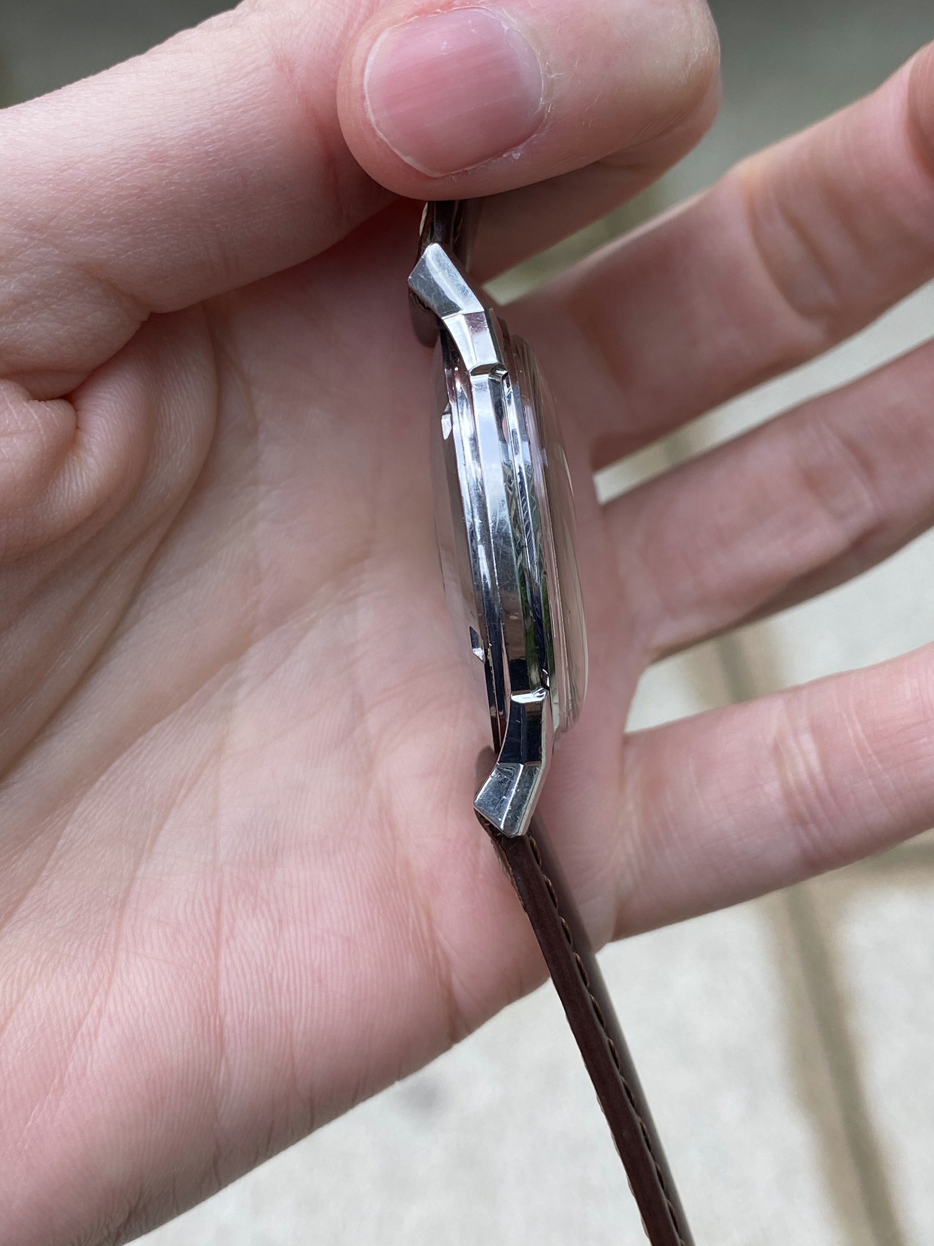 Case: Original 34.5mm 167.005 reference case is in very nice, unpolished condition. The dog leg lugs are razor sharp. The observatory medallion on the caseback is also nice. There are a couple scratches on the lugs as seen in pictures.