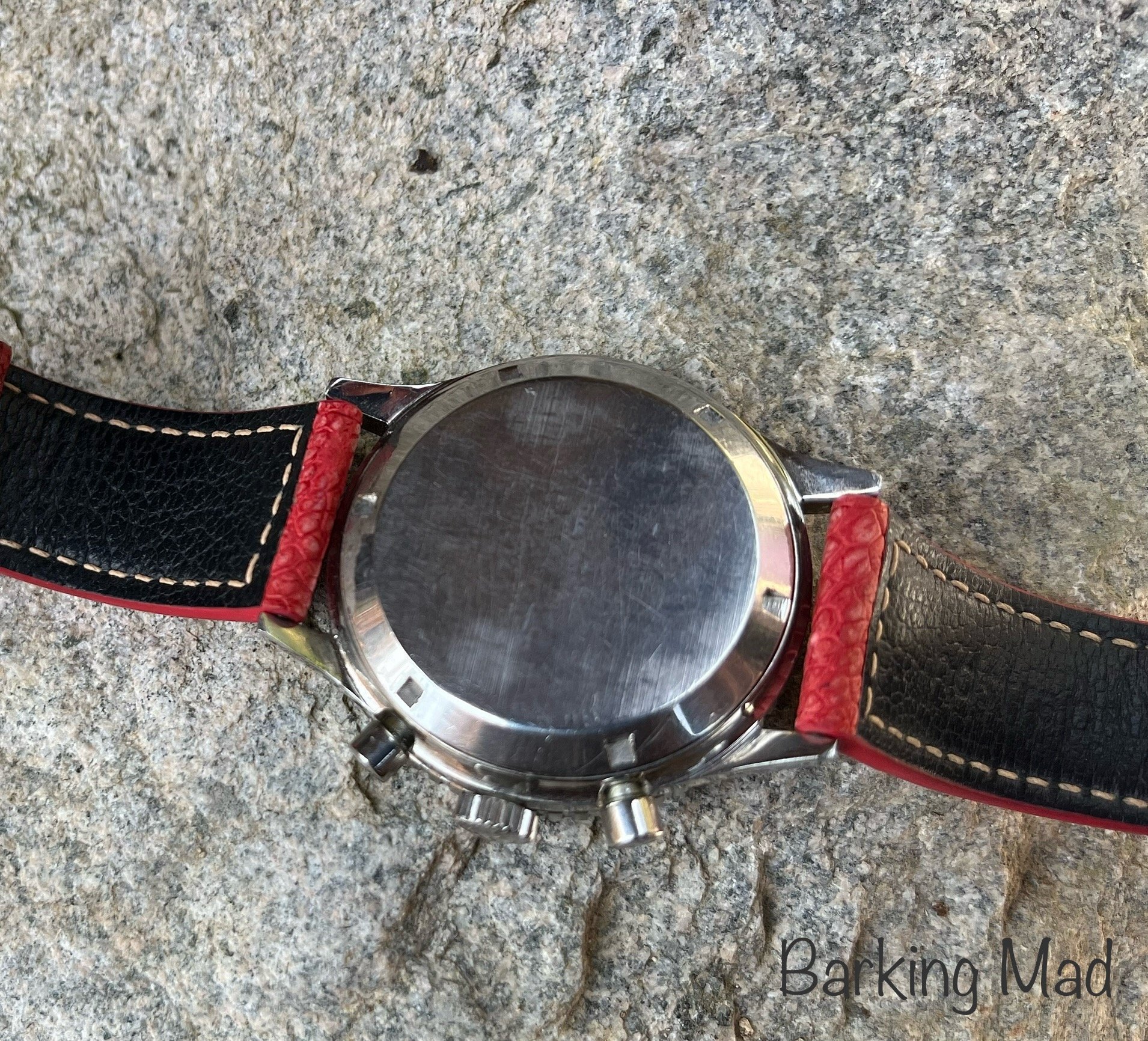 The flat black dial features a red(faded) regatta timer subdivision in the minute register, and oversize lume-filled hands with lollipop seconds.