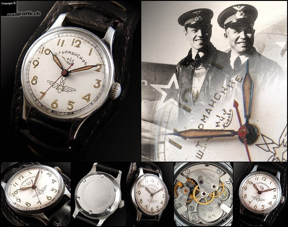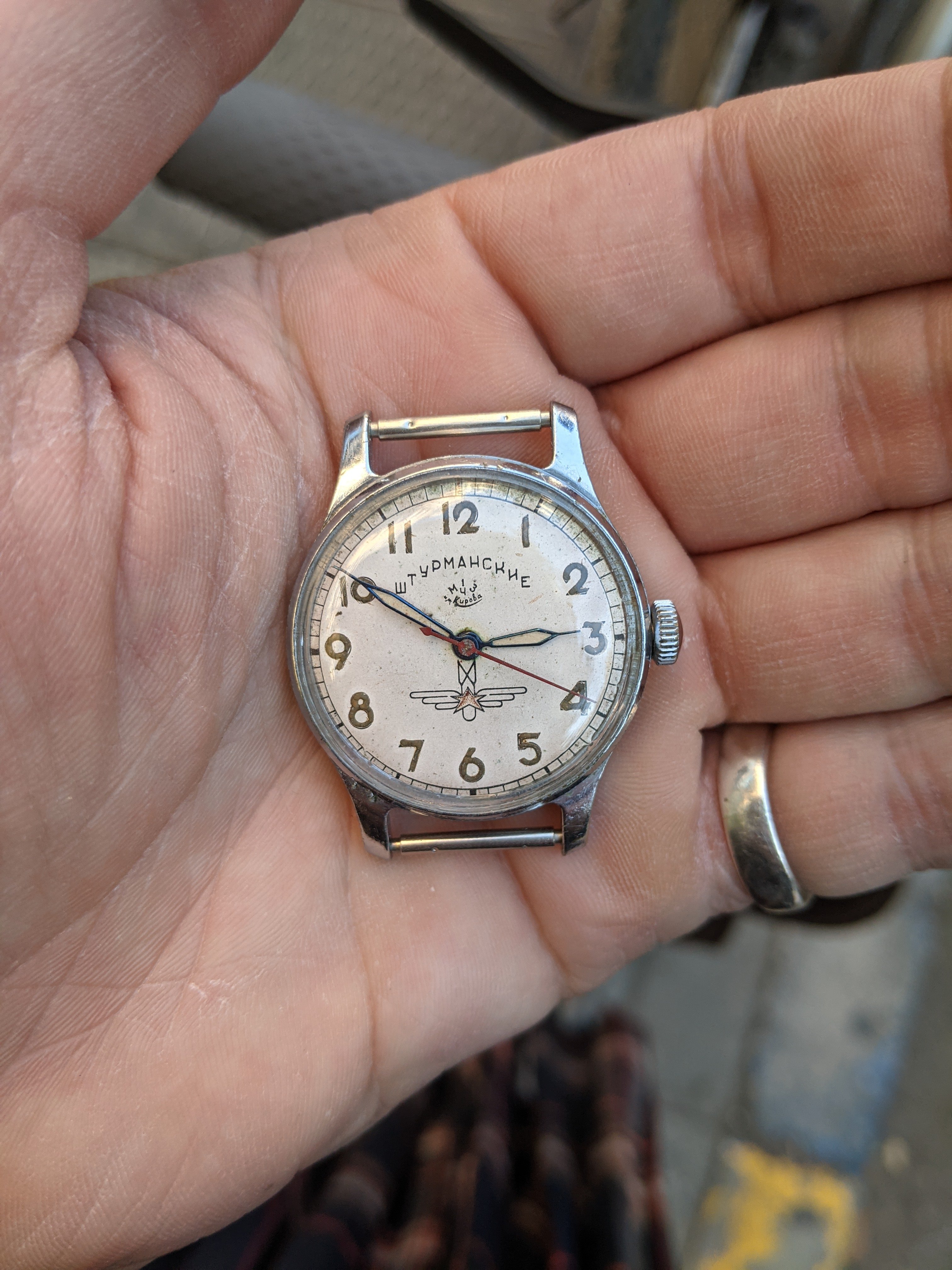 After 3 days of wandering around the Tirana university looking for a department with a Geiger counter to authenticate this watch, I met a physics professor who recommended a colleague to meet at a coffee shop. This Soviet watch (circa late 50s-early 60s, never commercially available and given only to Soviet cosmonauts and air force pilots--the first type of watch worn in space: Sturmanskie type 2) is highly radioactive from the radium dial, and is thus authentic (inside etc matches). The radium decays into radon gas, which are alpha particles, which are blocked by the crystal and even human skin, so if you don't go licking the dial it's generally safe-ish. However, if you wore this 24/7 for a year, it'd be like getting a few 10+ extra x-rays on your body.