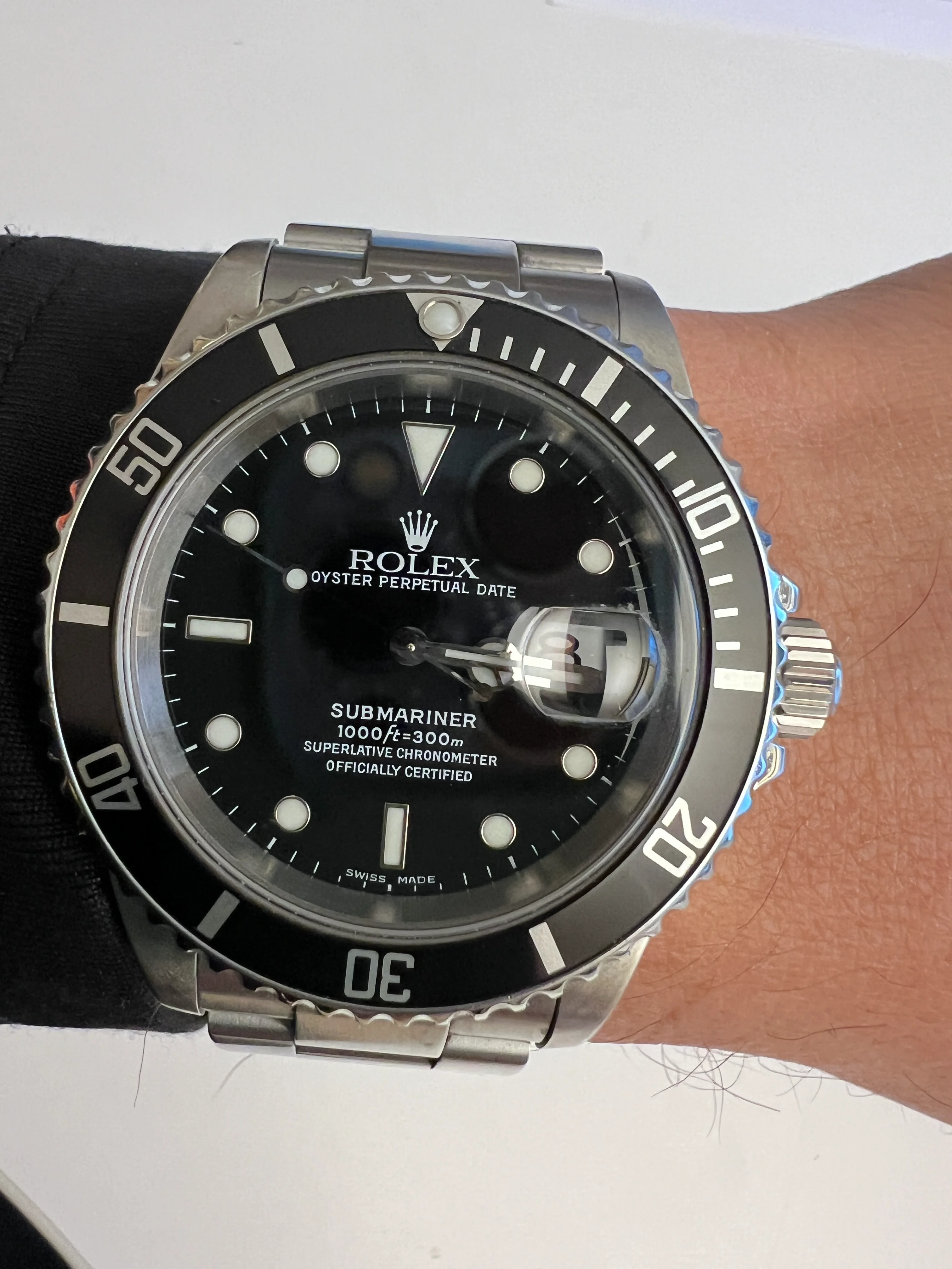 ·A local shop has each of these, both in identical condition. Both have been serviced by the shop’s Rolex-certified watchmaker and come with a two-year warranty. The lume plots on tritium dial are still white with no patina. Both have box and papers. There’s only a $500 price difference (1995 lower).
