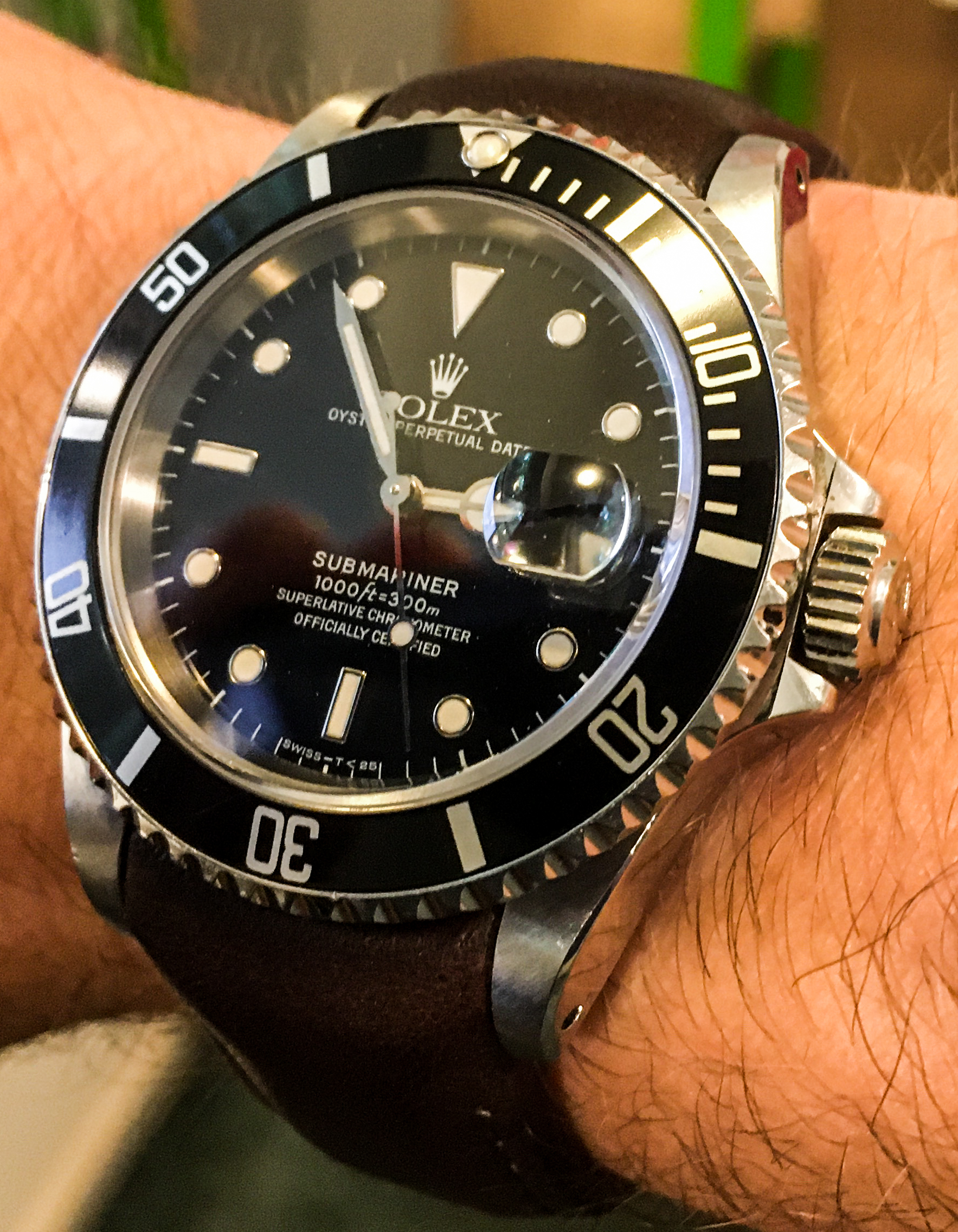 It's a nice, heavy chunk of watch, and I think it looks really handsome on the chocolate leather fitted strap from Everest. (I know some folks will say it's sacrilege to wear a Sub on anything other than stainless, but we all gotta do what we gotta do.)