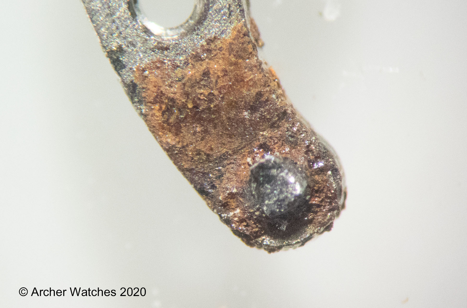 If either the post or slot in the stem is damaged, the stem can pull out of the watch more easily. In many vintage watches the post can get damaged by someone inserting the stem back into the movement, and screwing down the setting lever screw without first making sure the post is in the slot. Also, for those who like to keep original crowns that no longer seal, if you happen to get the watch wet when moisture enters this area it often leads to this: