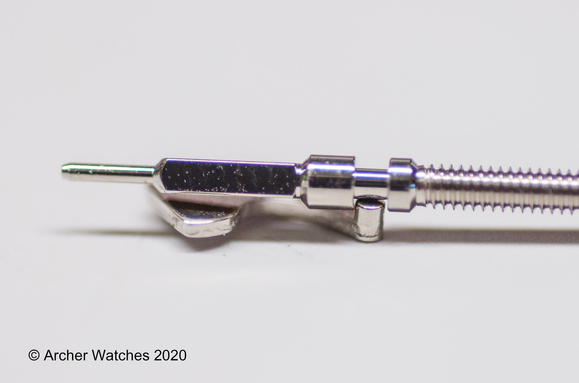 The part laying on the bench is called the setting lever. It has a small post on it that fits into a slot in the stem that you can see. This is what keeps the stem from pulling completely out. This is a macro photo, and these parts are from an ETA 6497, so a large wrist watch or medium pocket watch movement. So these are quite large in comparison to what you would find inside something like a Speedmaster, or a smaller movement. The post is 0.78 mm in diameter to give you an idea of the actual size.