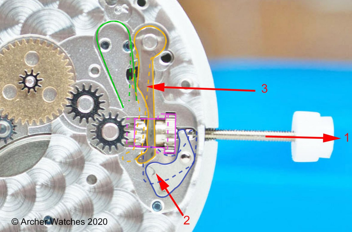 Here, pulling the crown and stem out one position lead to four parts moving, which I've outlined in four colors. In each case, I've outlined it with a solid line, and then again with a dotted line where I believe it will travel to when the crown is pulled out: