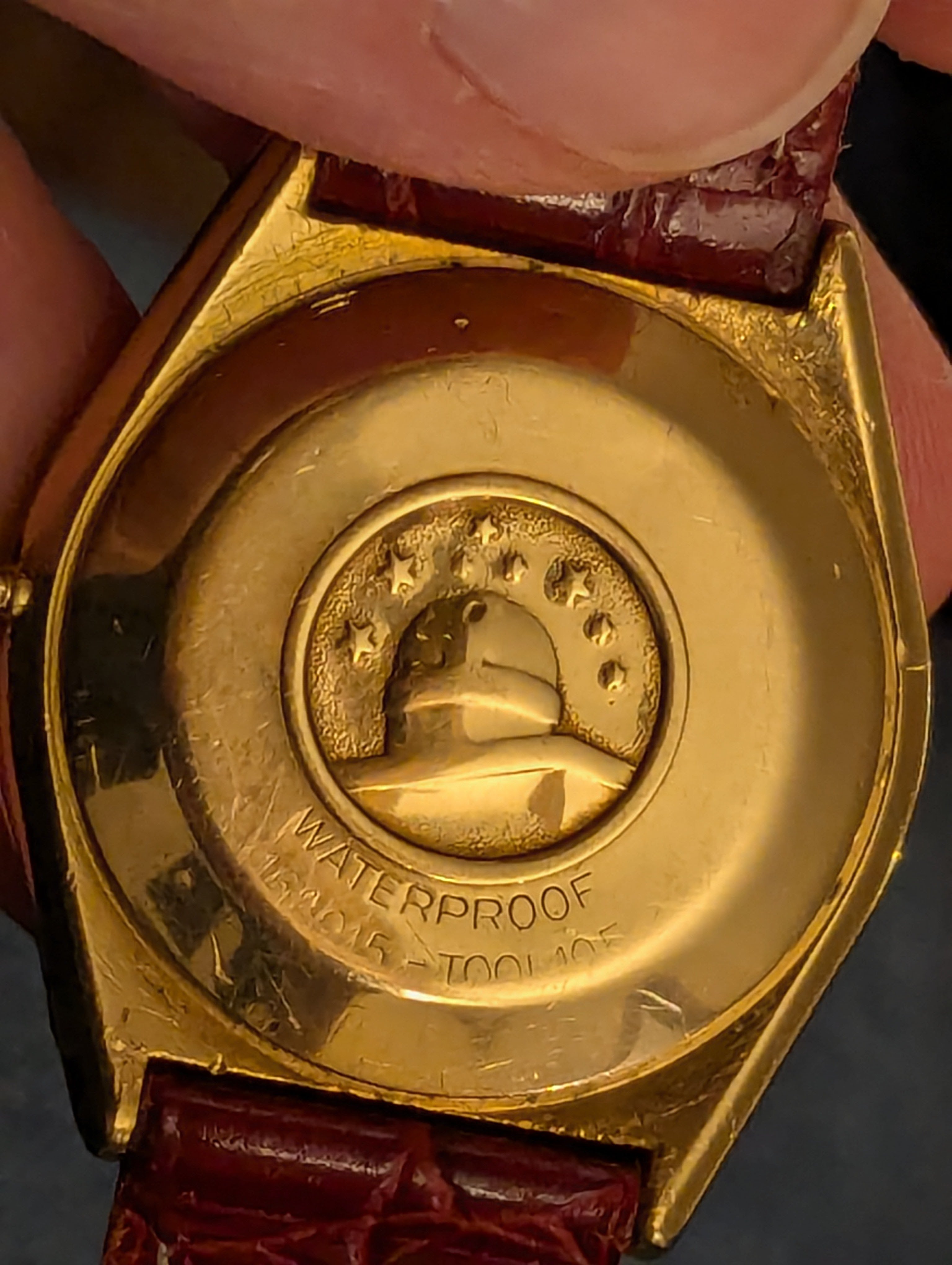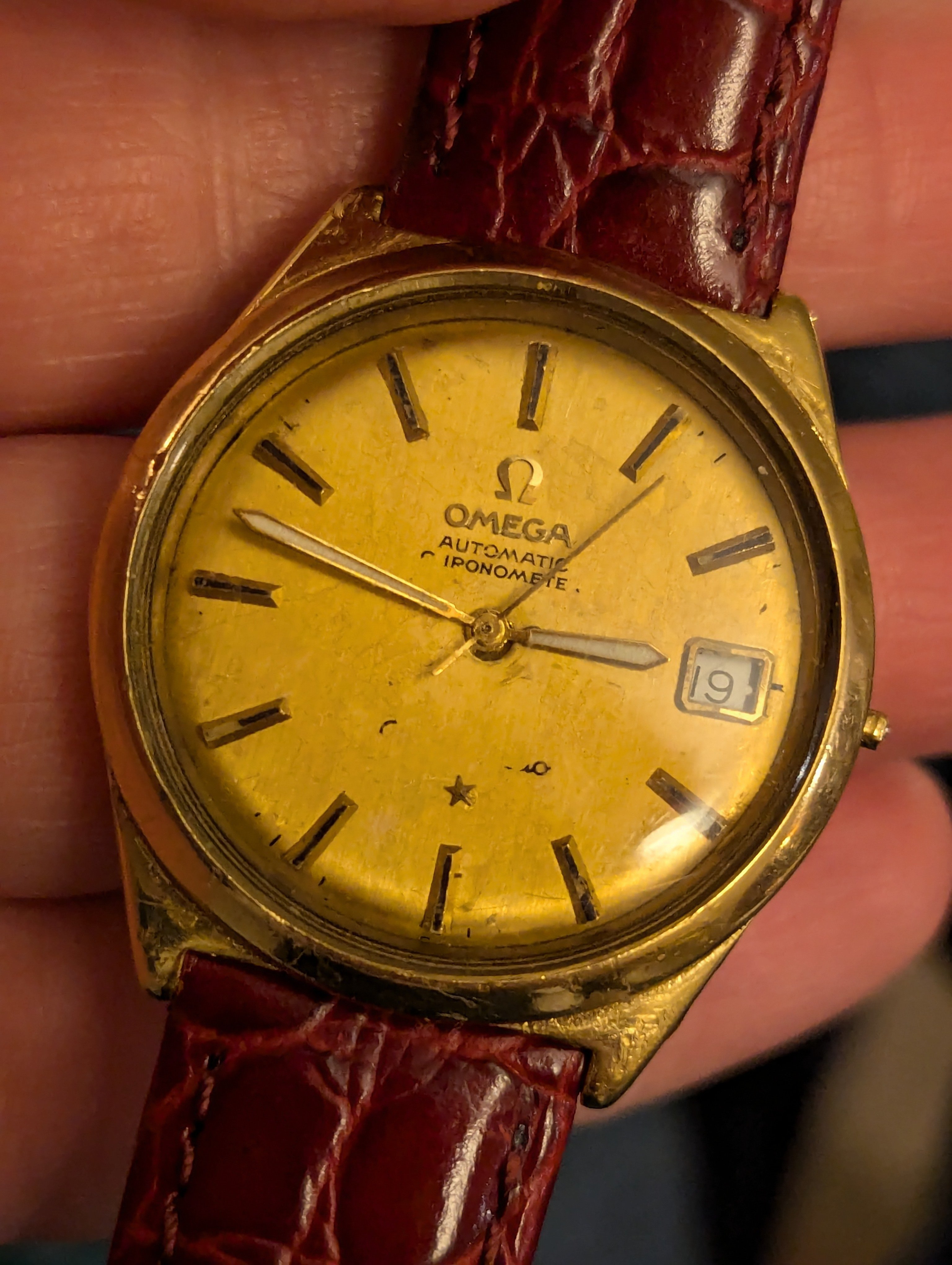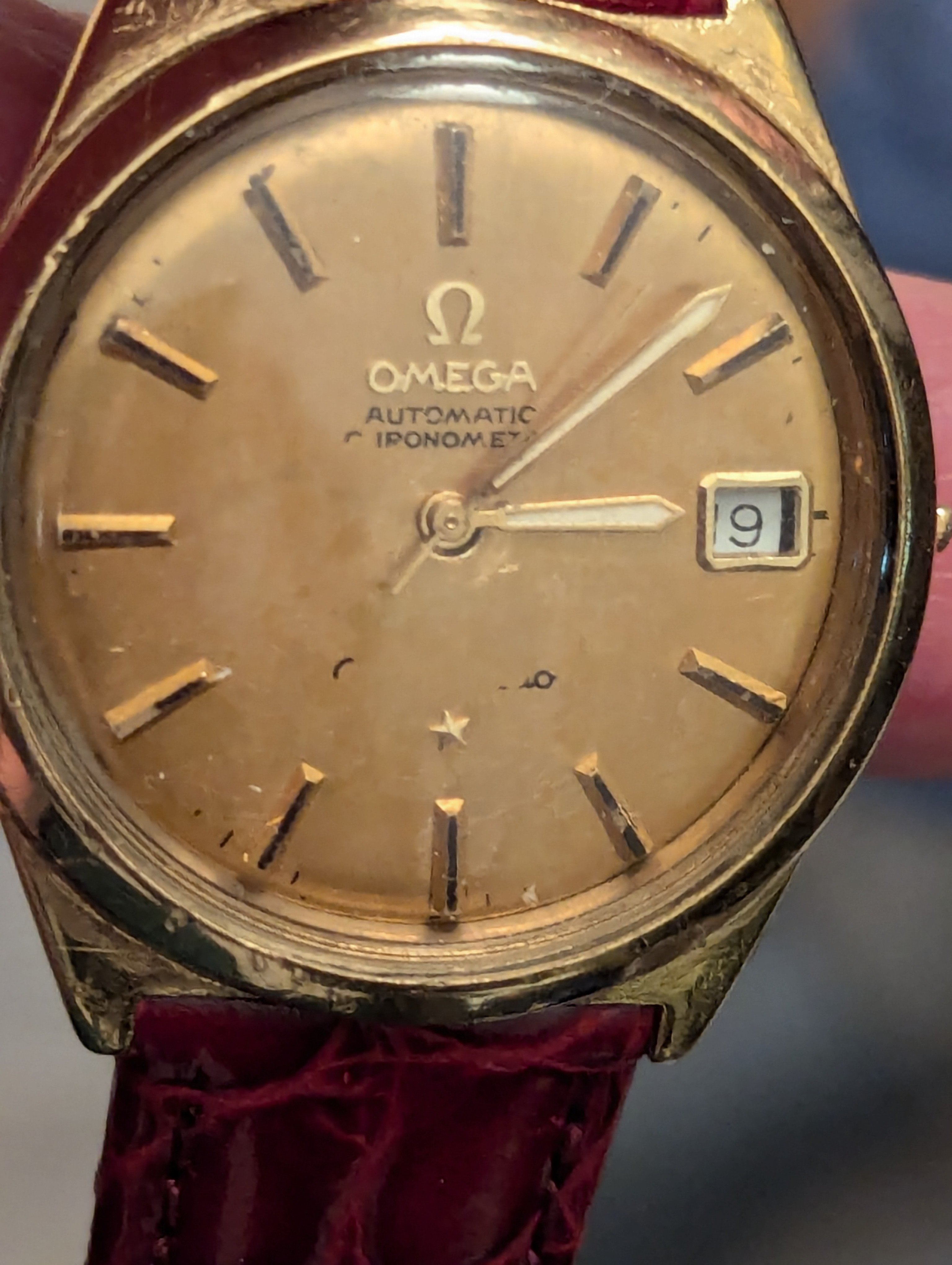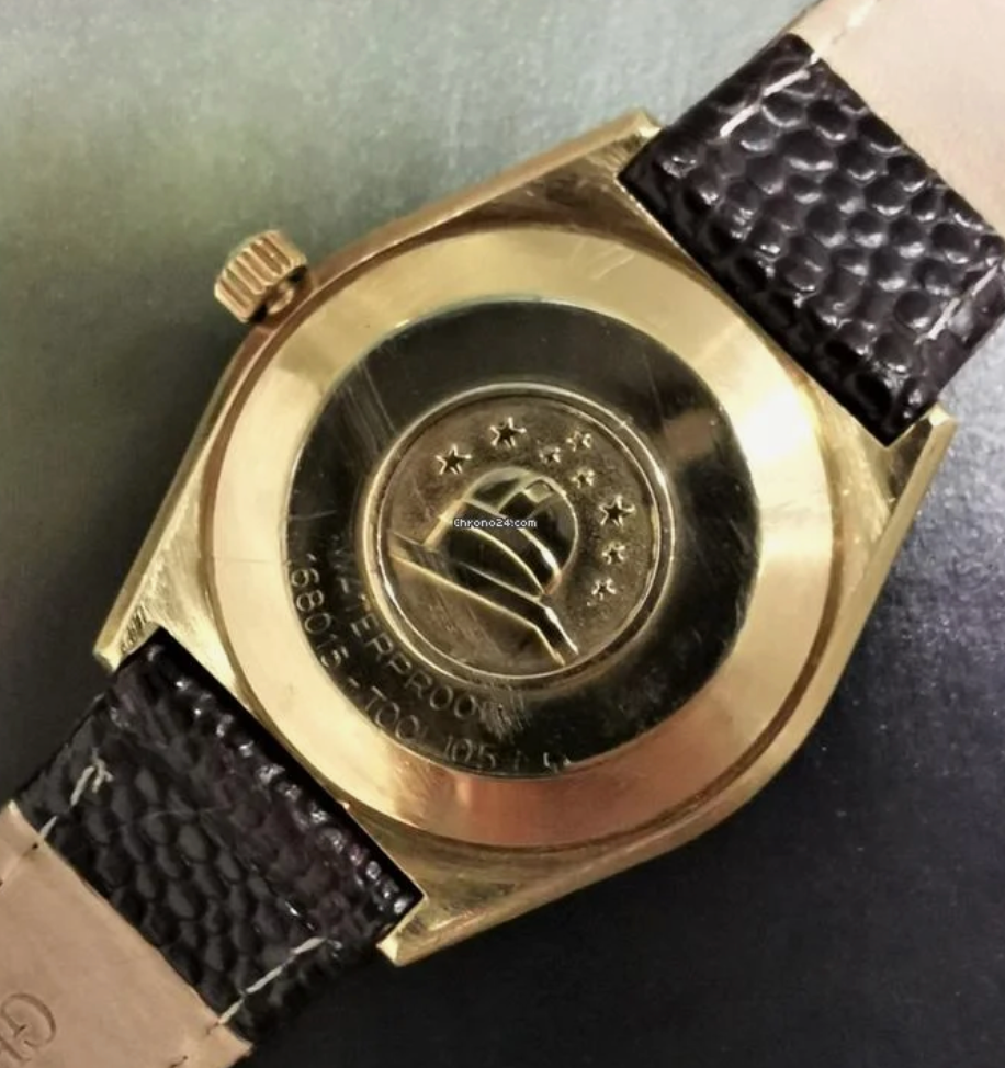 So now even that has stopped working and the watch has been sitting in a drawer for at least a couple of years. He's now just wearing my old Seiko, on the somewhat-original gold band from his watch. It was a gold weave-style band that wore through, back in the 90s and he had a jeweler melt it down and remake it into more of a smooth gold strap... kind of hard to describe and I don't have a pic, but that at least is still holding up! I believe it has the original Omega buckle on it.