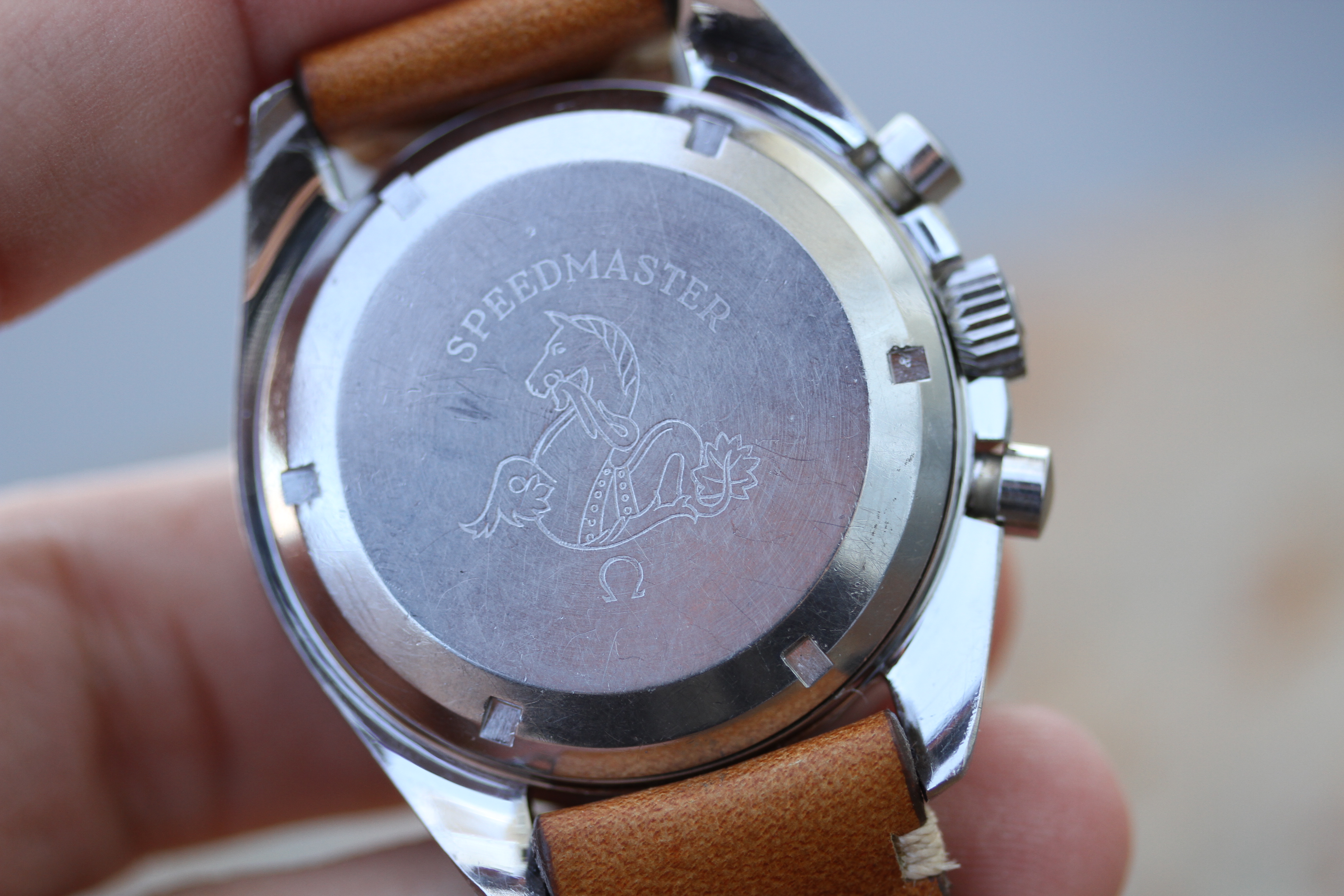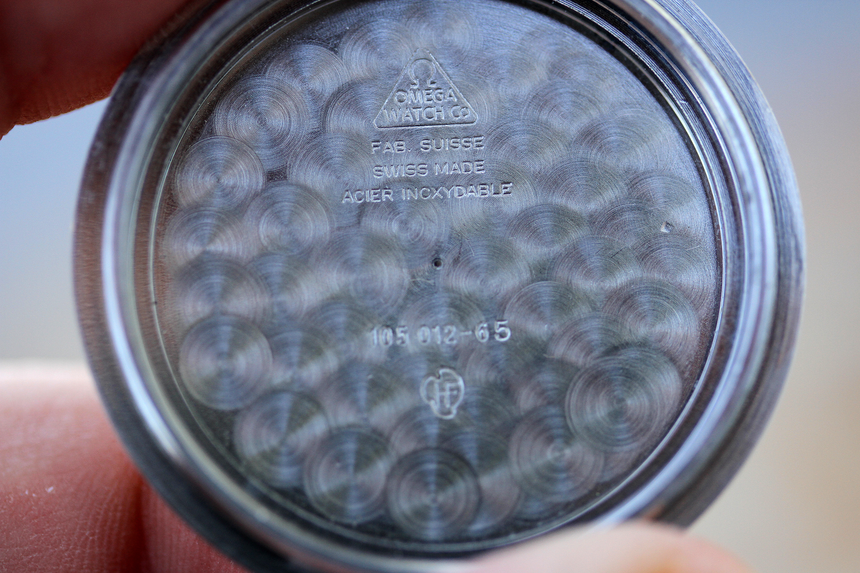 Caseback is excellent with crisp Seamonster, visible double step, stamped 105.012 - 65 with case maker mark HF for Huguenin Freres. Caseback still appears to have original finish and never been polished.