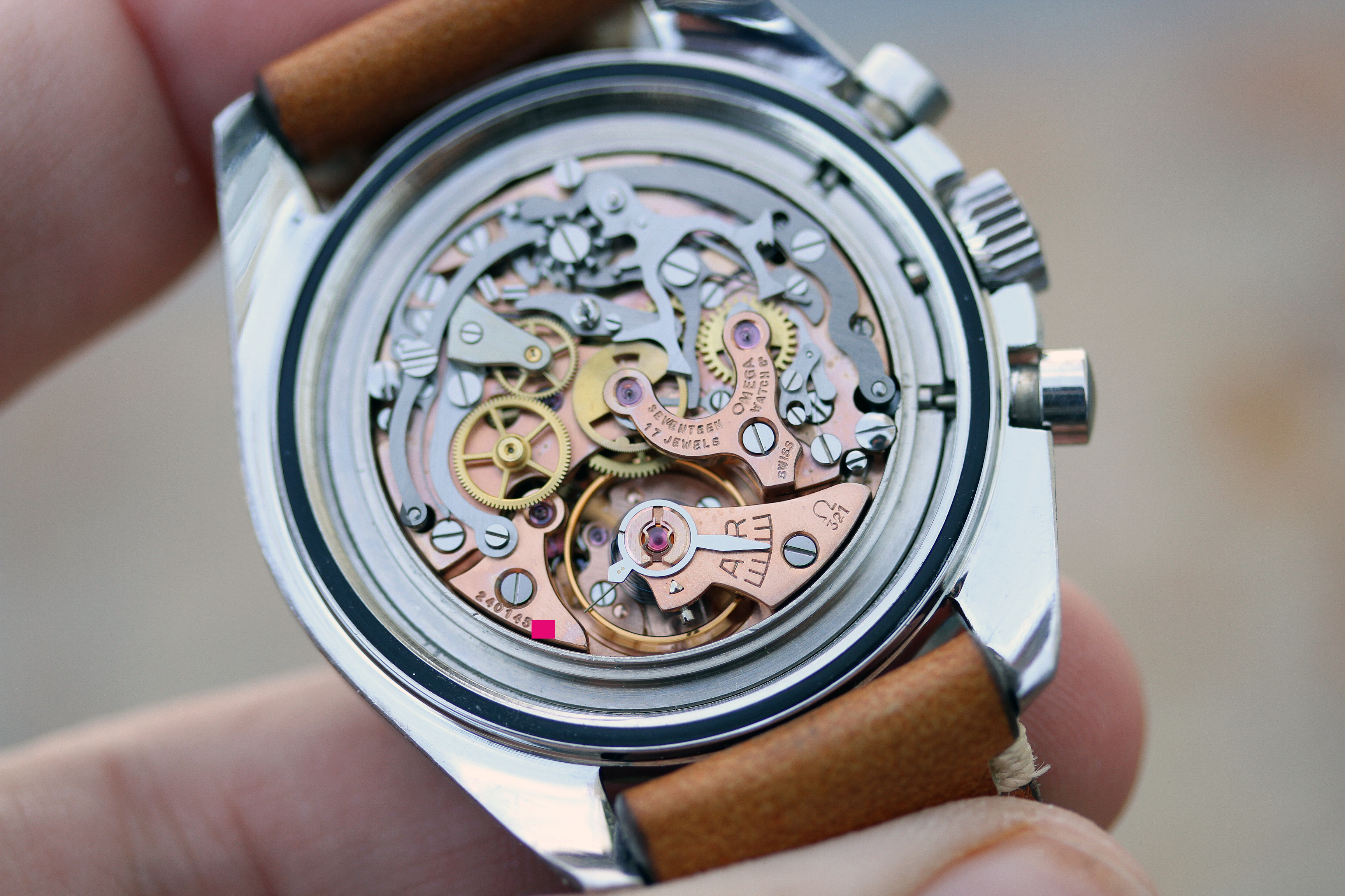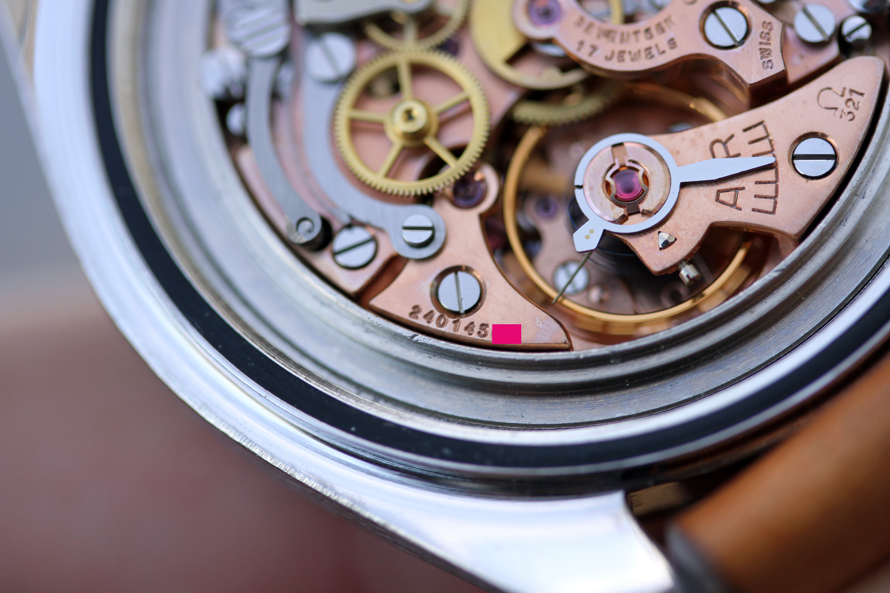Cal. 321 movement looks to be in excellent physical condition. The caseback doesn't show any service markings. Evidently, the watch has sat around for a long time not being worn or used based on condition. The watch winds, runs, chrono runs and resets back to 0. I do not have timekeeping or amplitude information for you.