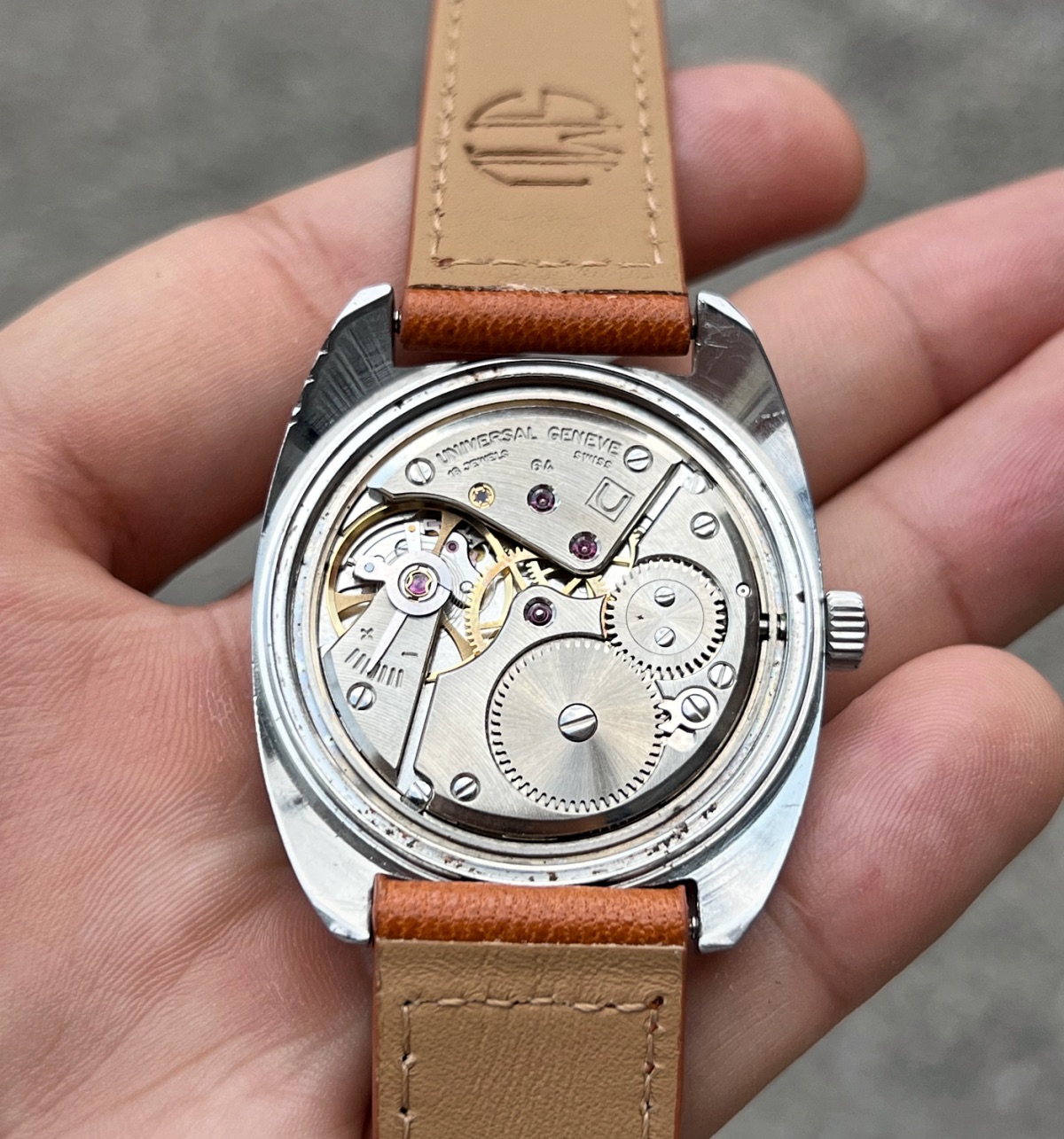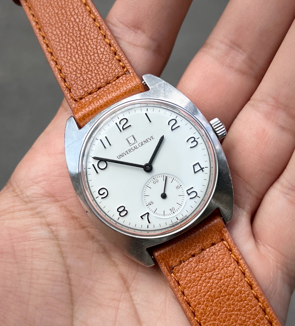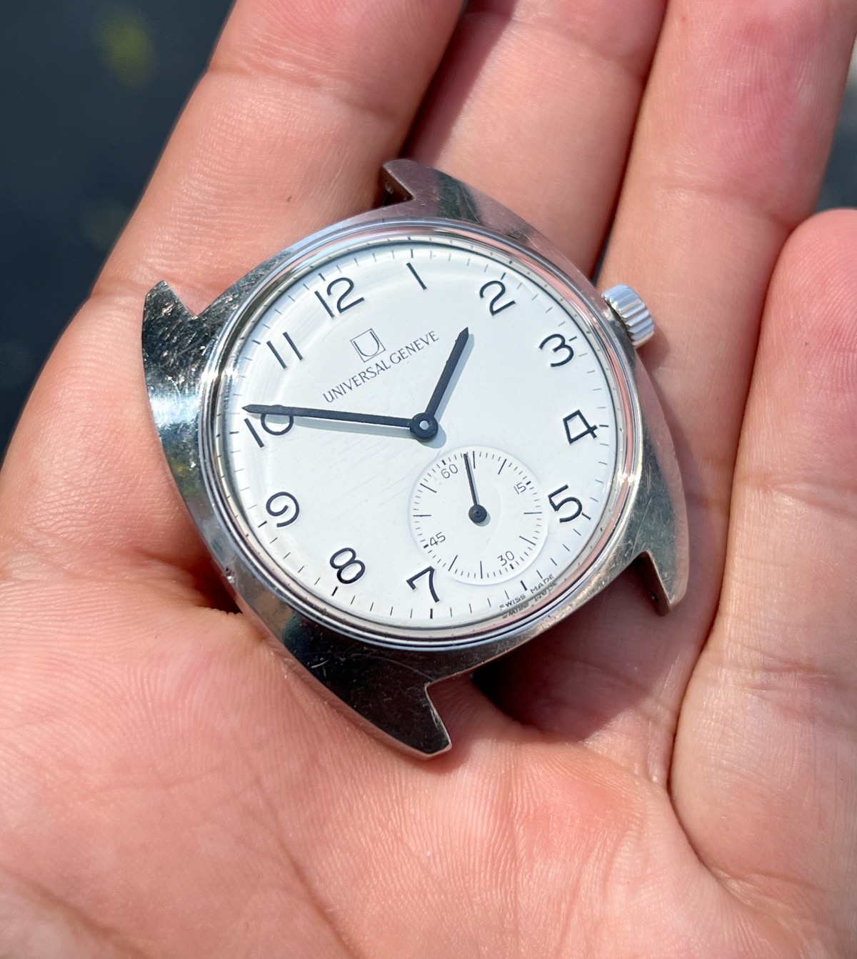 Up for grabs this spectacular example of Universal Geneve FS aka "Ferrovie dello Stato" (Italian railway company) from 60s. This specific axample is a "mark 2" version. I bought this watch from the grandson of the first owner, who worked for the company in the past.