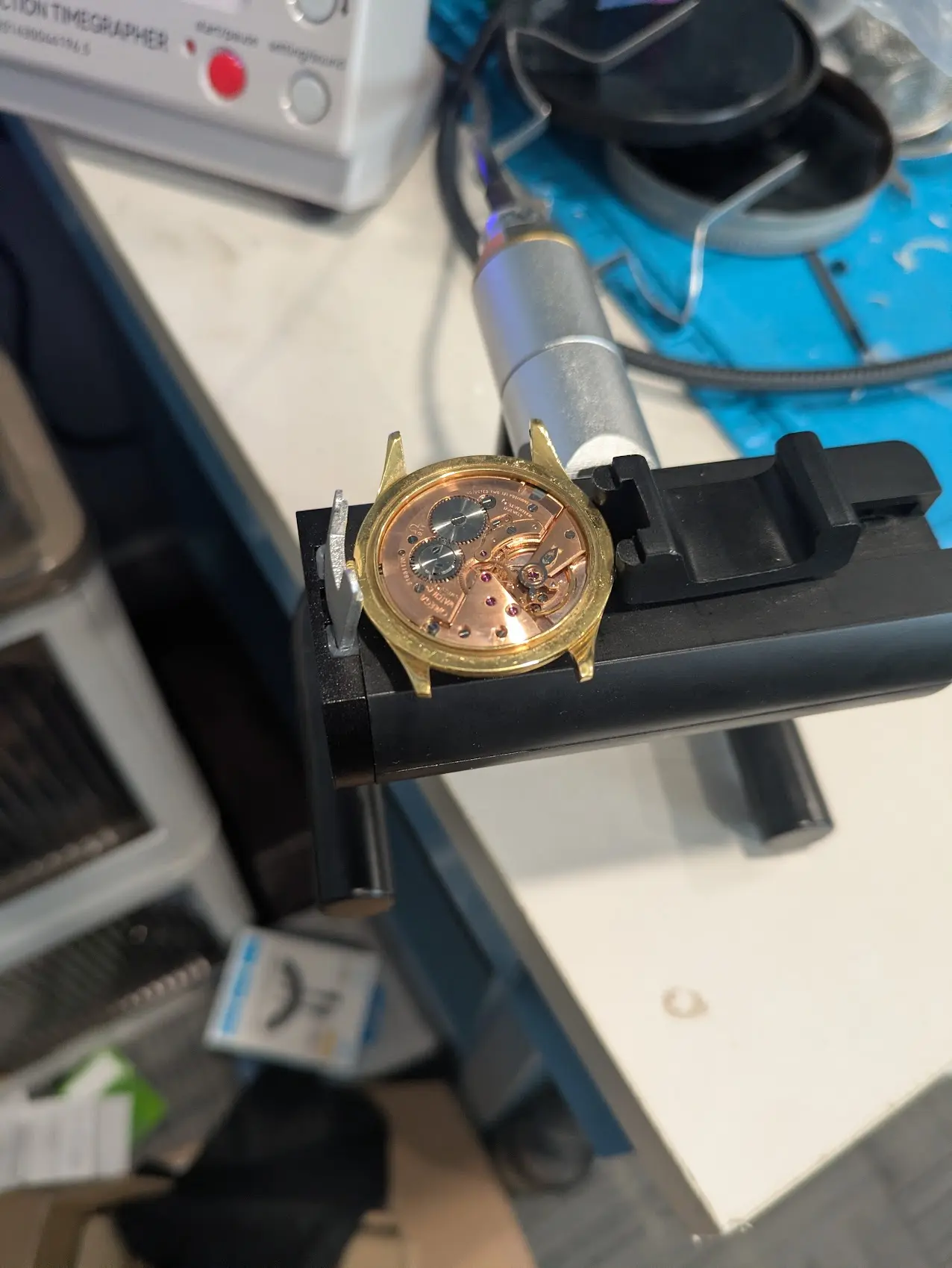 Looking at the case back, SOMEONE in this watch's history went to TOWN trying to get the case back off. Timegrapher was originally pretty encouraging, ~1.5ms beat error, ~135 degree amplitude (at 52 degrees, though I see I should have done it at 49 degrees), and ~2-2.5 mins/day behind. Not too bad!