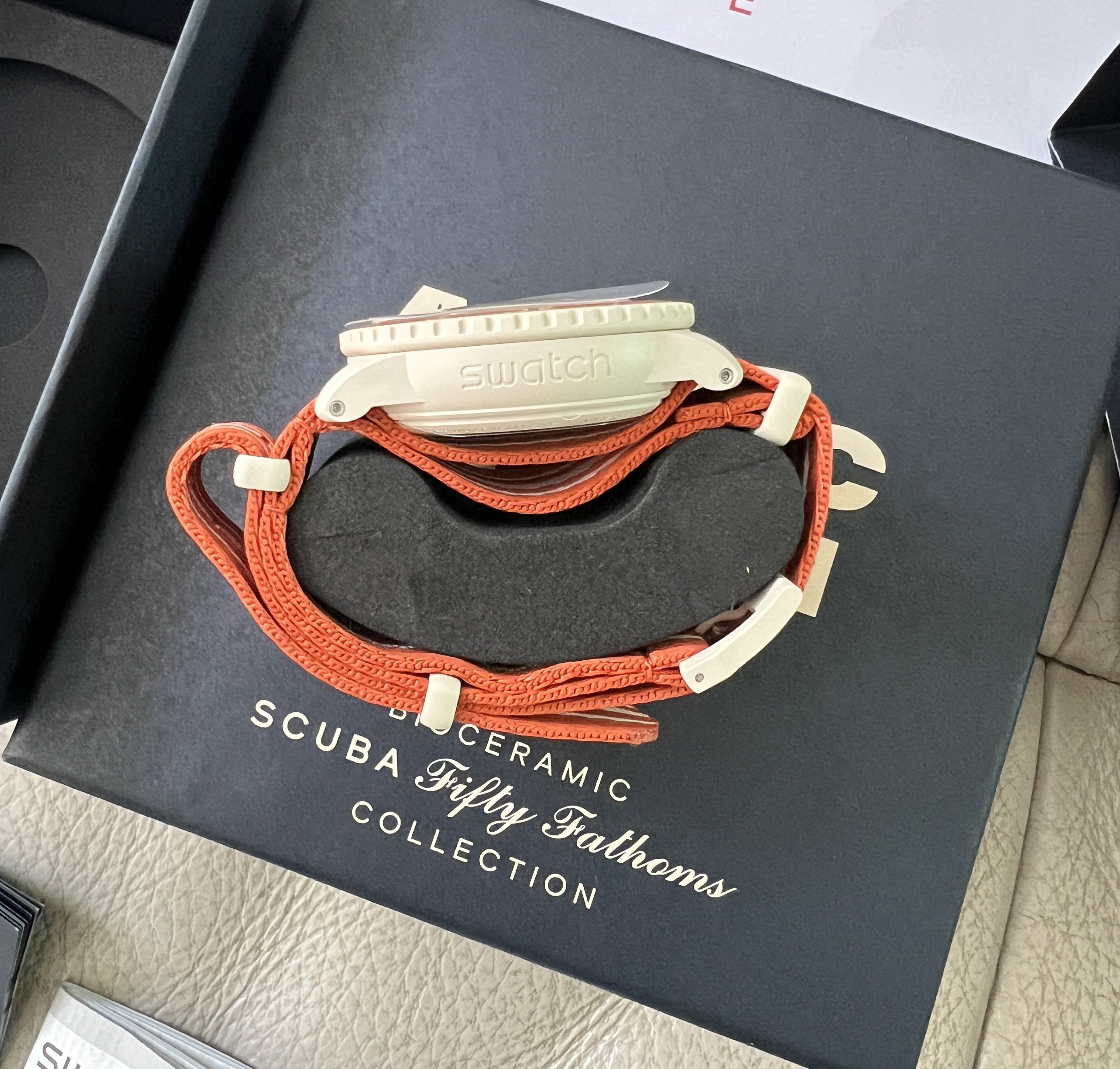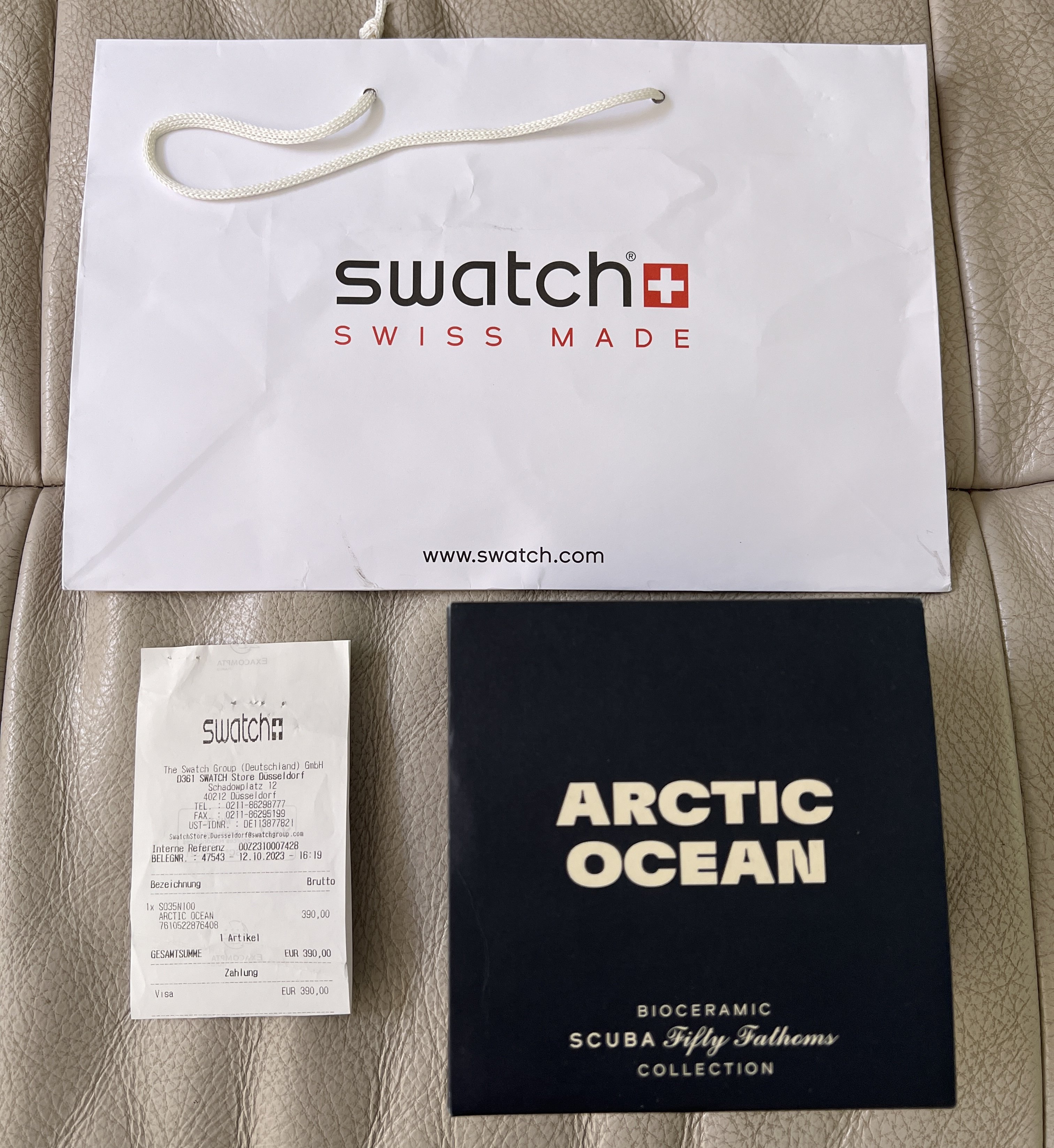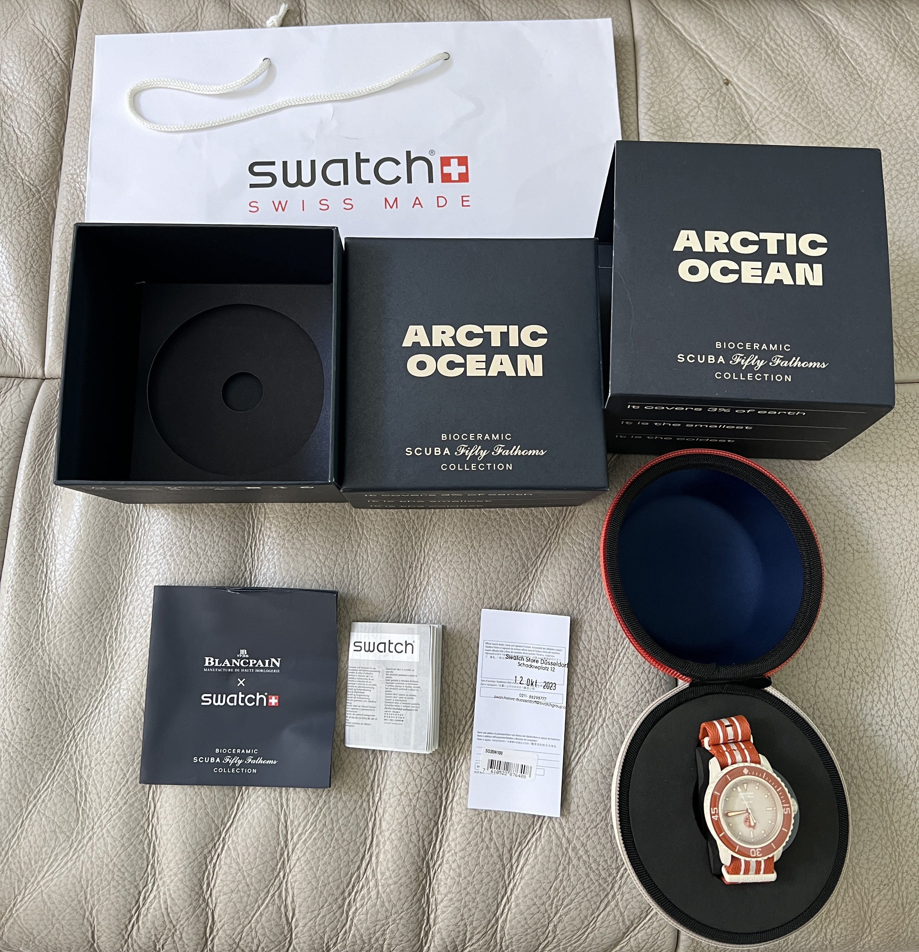 ·For sale ($535 OBRO) have a brand new, never worn Swatch Fifty Fathoms Artic Ocean watch. I bought this watch on the Swatch boutique in Dusseldorf Germany last week and have decided to sell it as already have too many watches. It comes as pictured with the original box and stamped warranty card from Swatch, as well as with the original purchasing receipt. The Artic Ocean in my opinion is the coolest model / color from the series and probably the hardest to find. Information from Swatch can be seen at:
