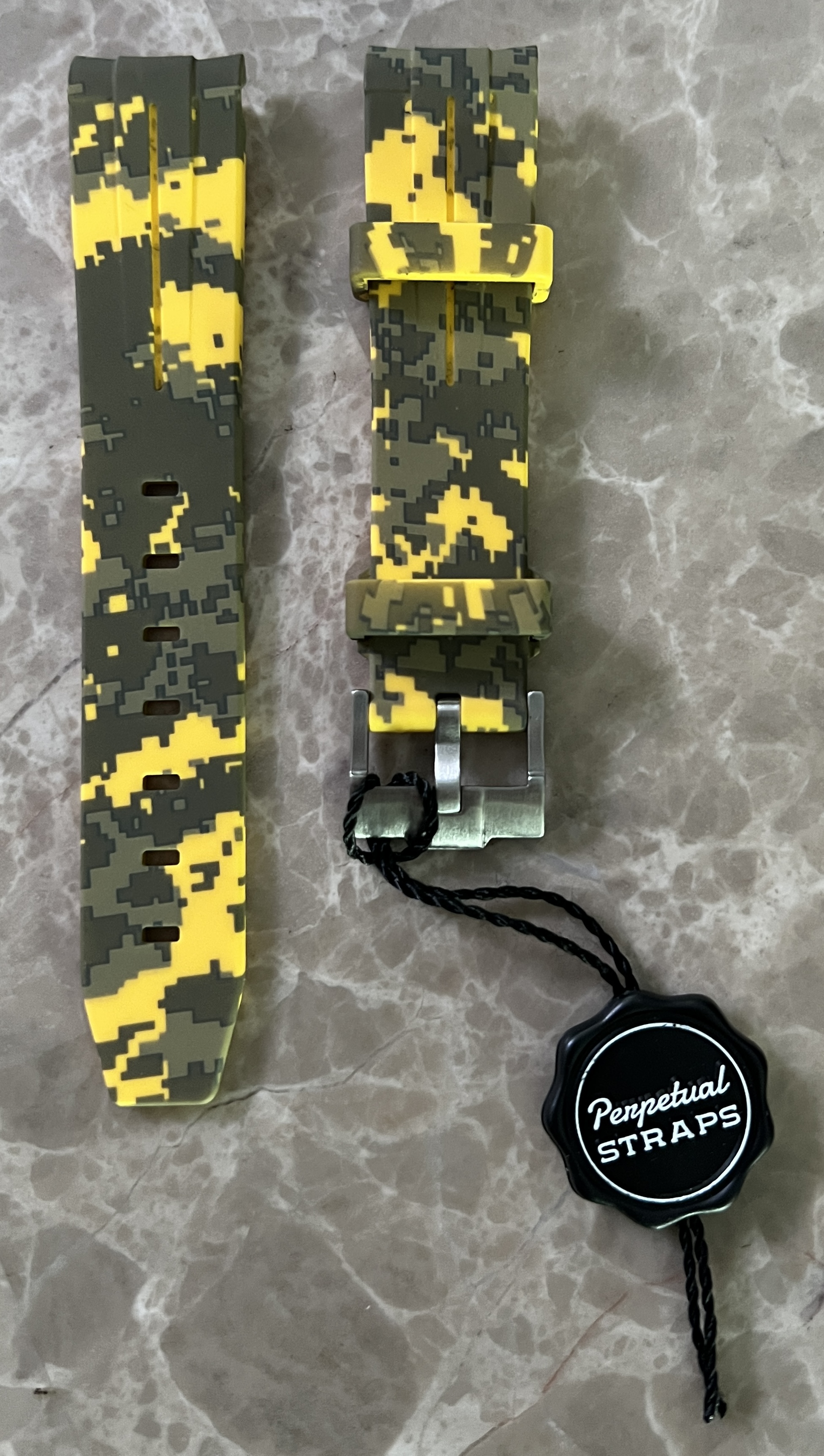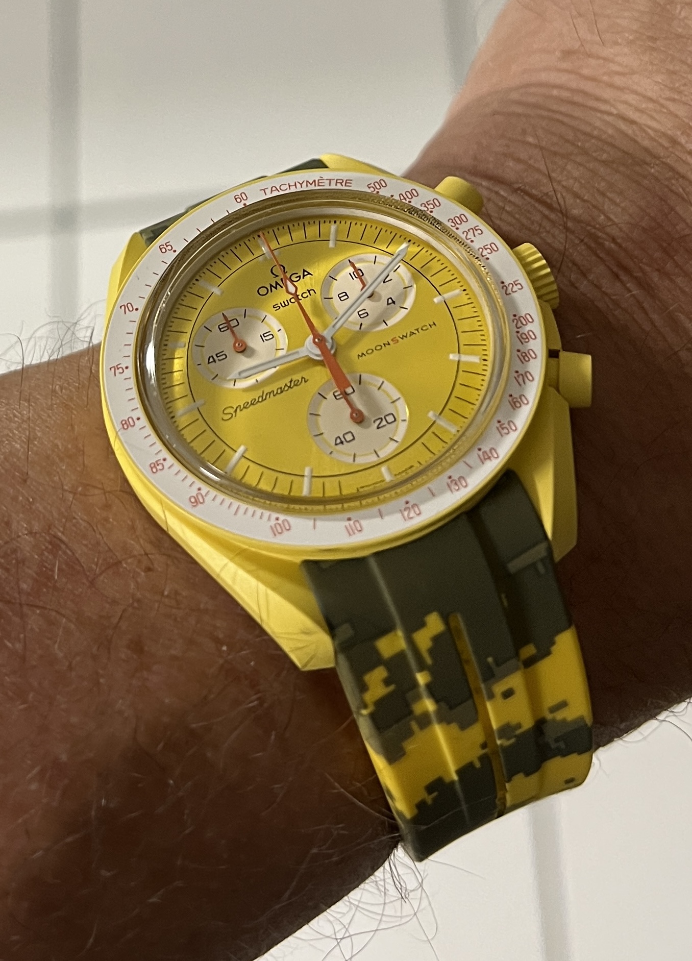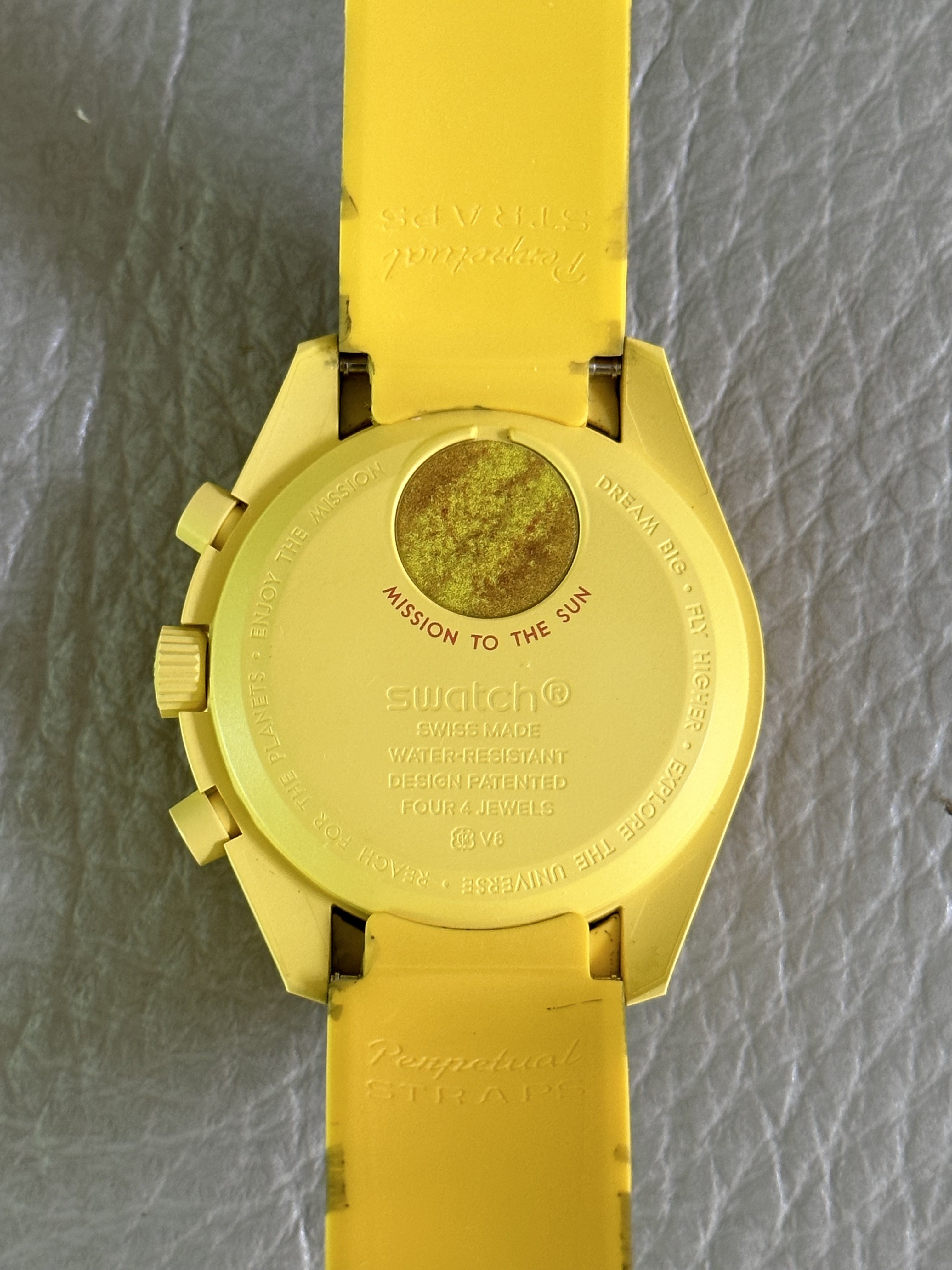 ·*SOLD* ($325 OBRO) have a genuine Swatch MoonSwatch Mission to Sun with comes with all factory paperwork and accessories (including original purchasing receipt from Omega Boutique) and a Perpetual Bands yellow camo rubber band in perfect operating conditions / physical conditions as shown on the pictures below. I recently purchased this watch and immediately ordered the Perpetual band yellow camo band as have read many people saying the factory velcro band is not good (which think is a fair statement); never wore the watch on the factory velcro so it's brand new. Only wore the watch in the house with the Perpetual band (which looks pretty good as shown on the pictures below) a few times so you are basically buying a brand new watch with the extra rubber band for the less than the cost of the watch and the band plus tax (Some people are asking crazy money for these watches, not looking in my case to benefit from that, would rather let another member to get it for a fair price instead)