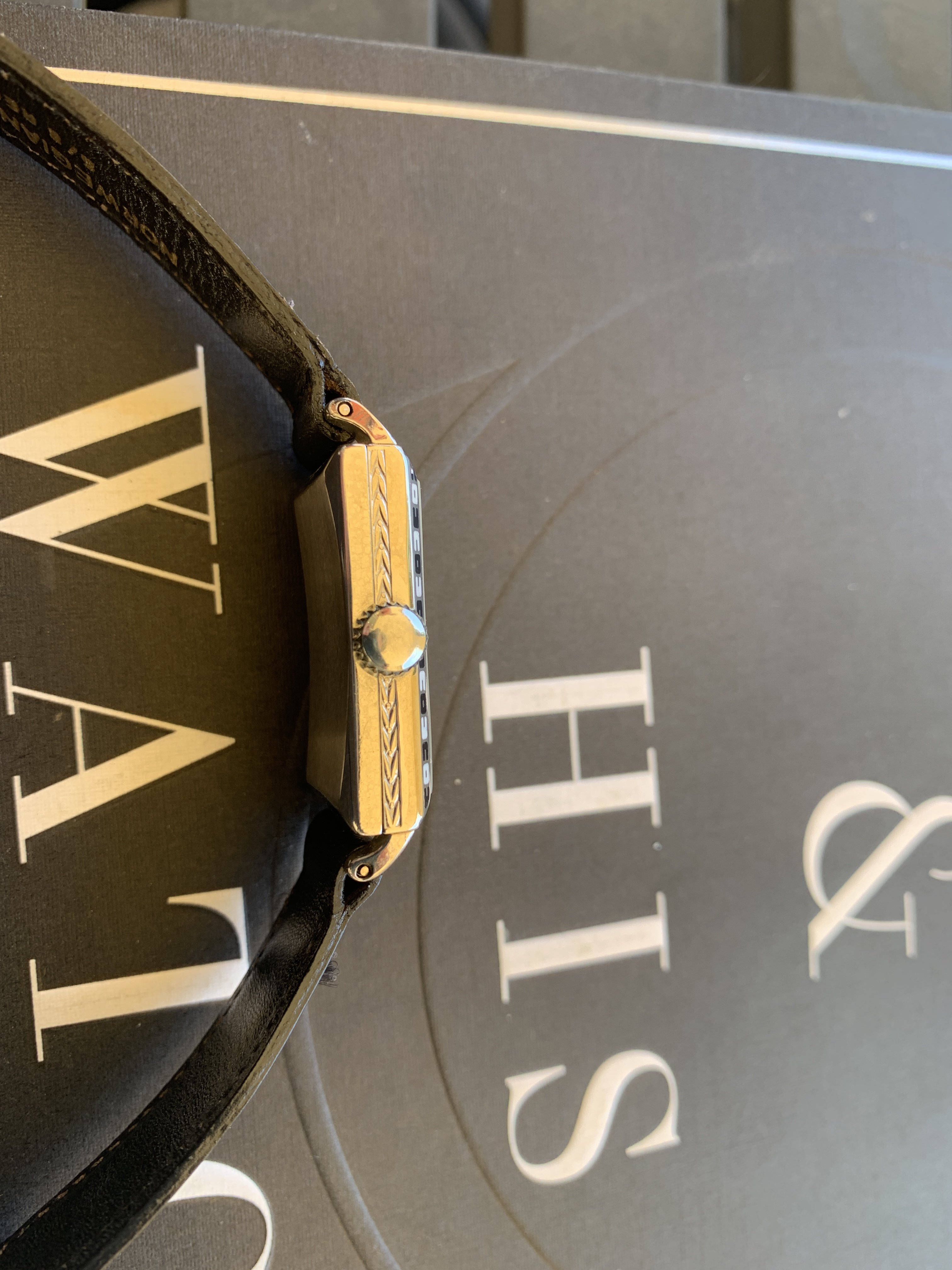 Love all the Art Deco detailing on the 14 karat white gold-filled case: