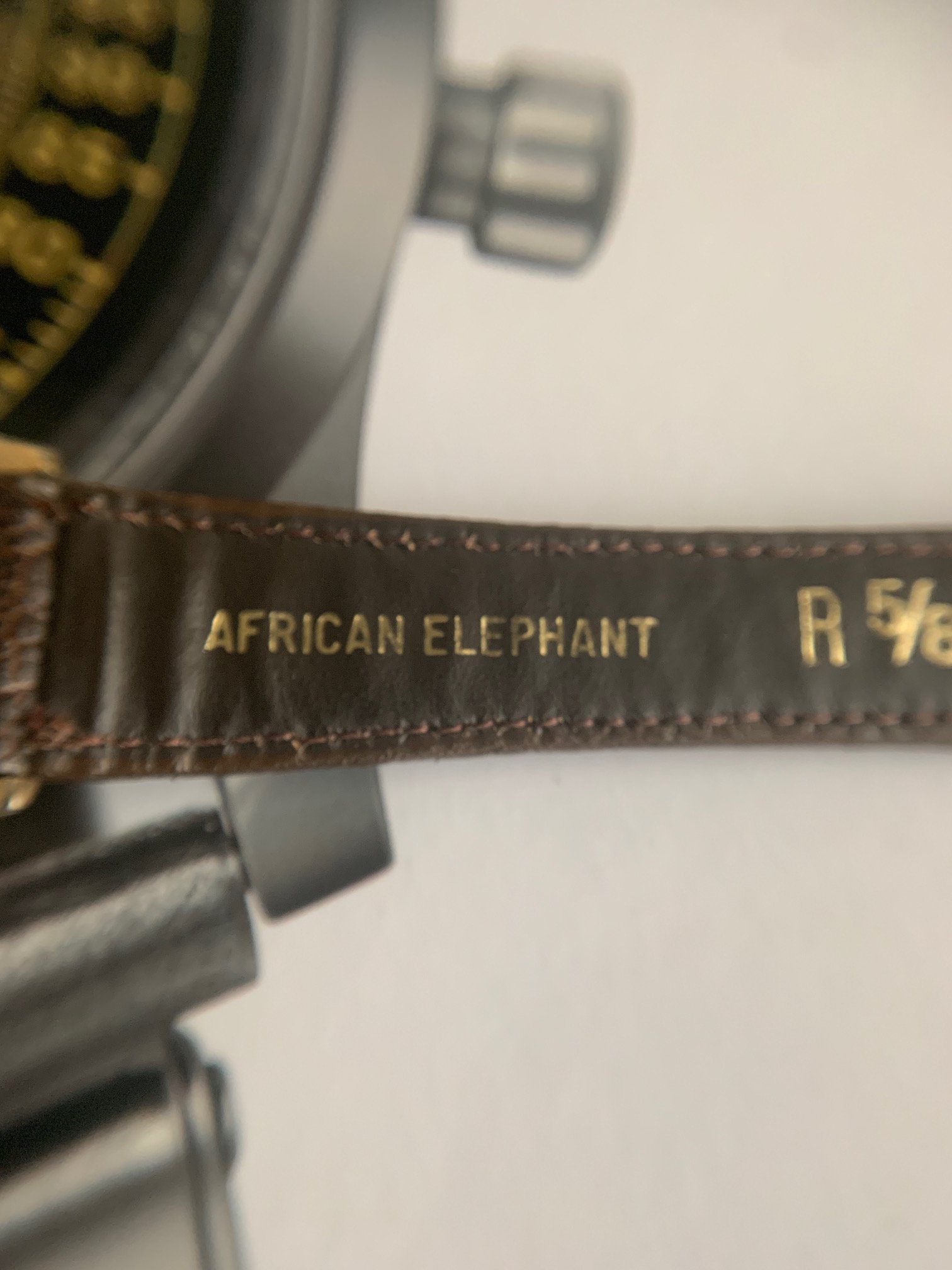 Weighing in at app. 21mm wide x 38mm lug to lug, taking a 16mm strap. Speaking of, it comes on what I can only imagine is its original Elephant strap: