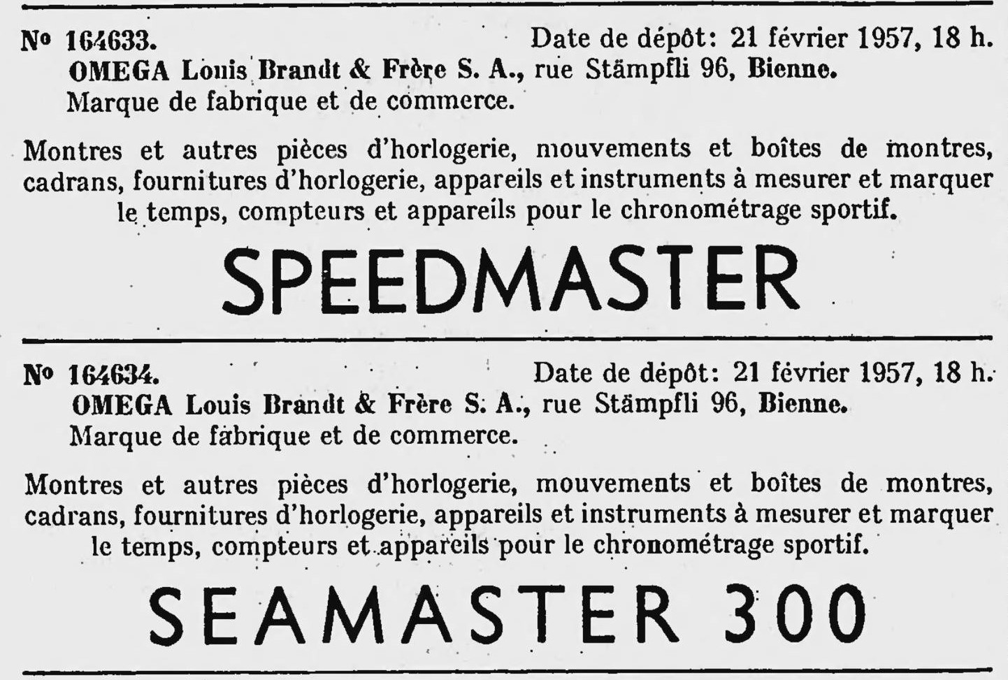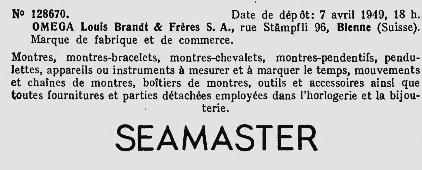 Here are a few entries I found when searching for Omega content, Original trademark entries for Seamaster in 1949, Speedmaster and Seamaster 300 in 1957 and the Omega triangle logo from the inner case back from 1934.