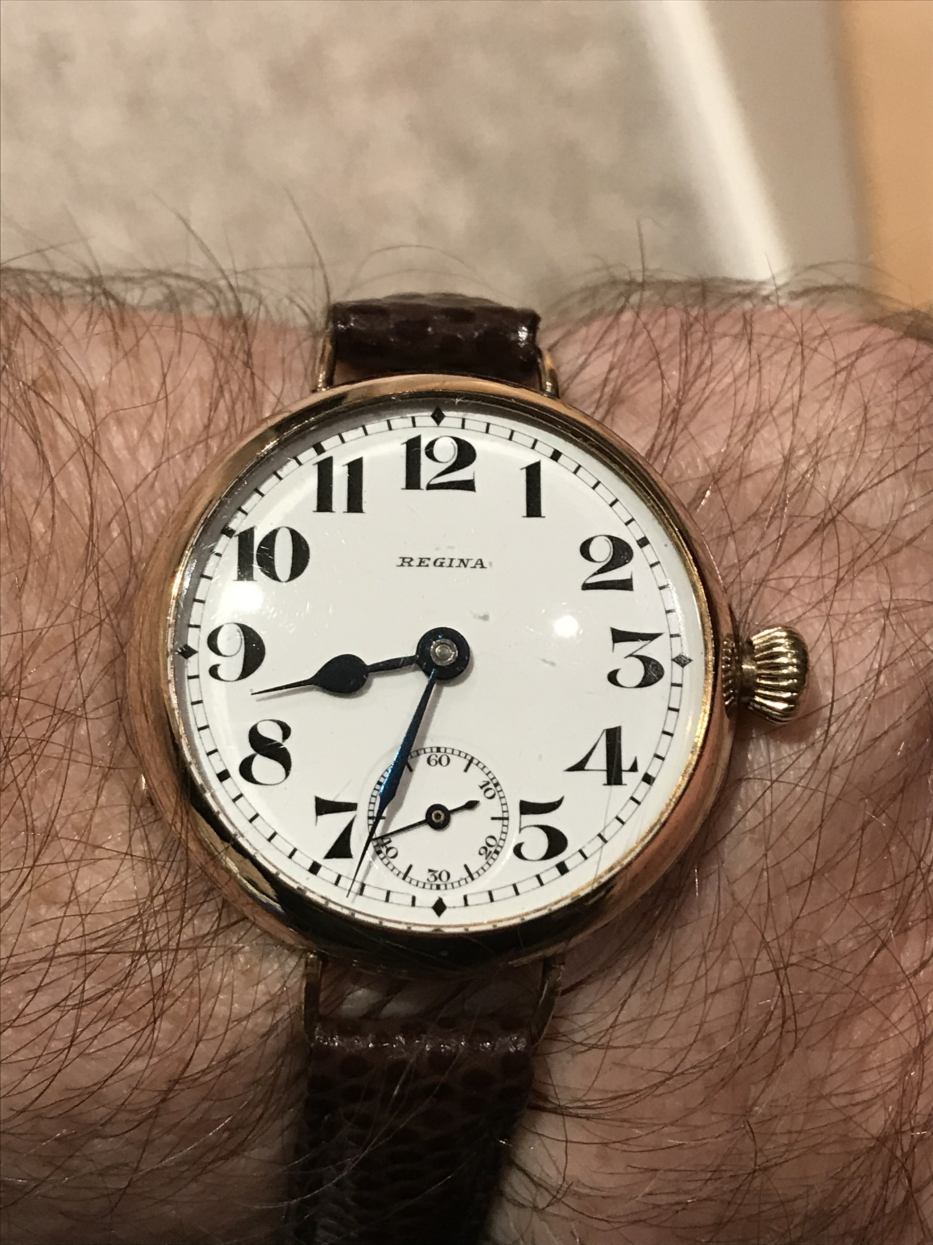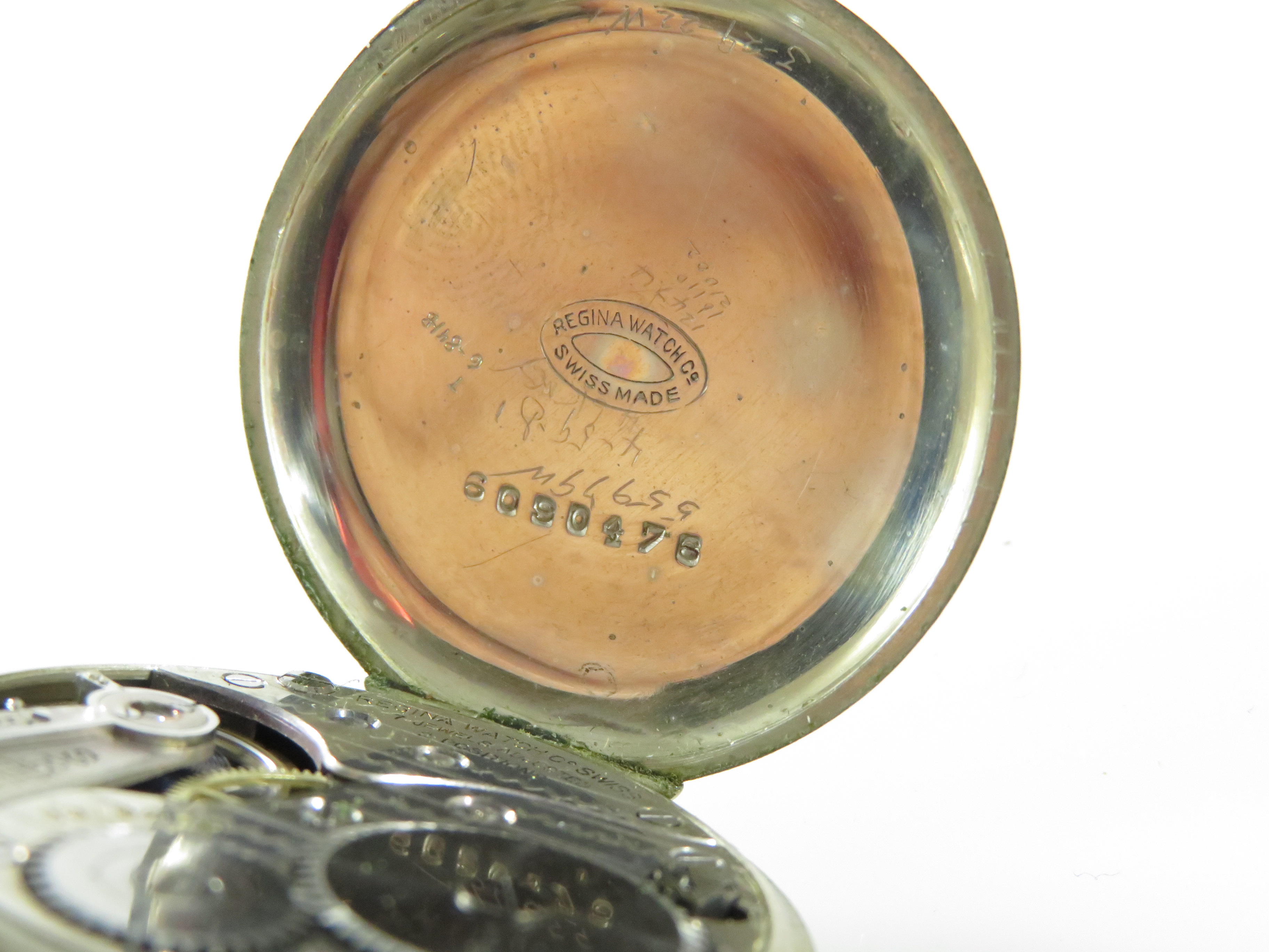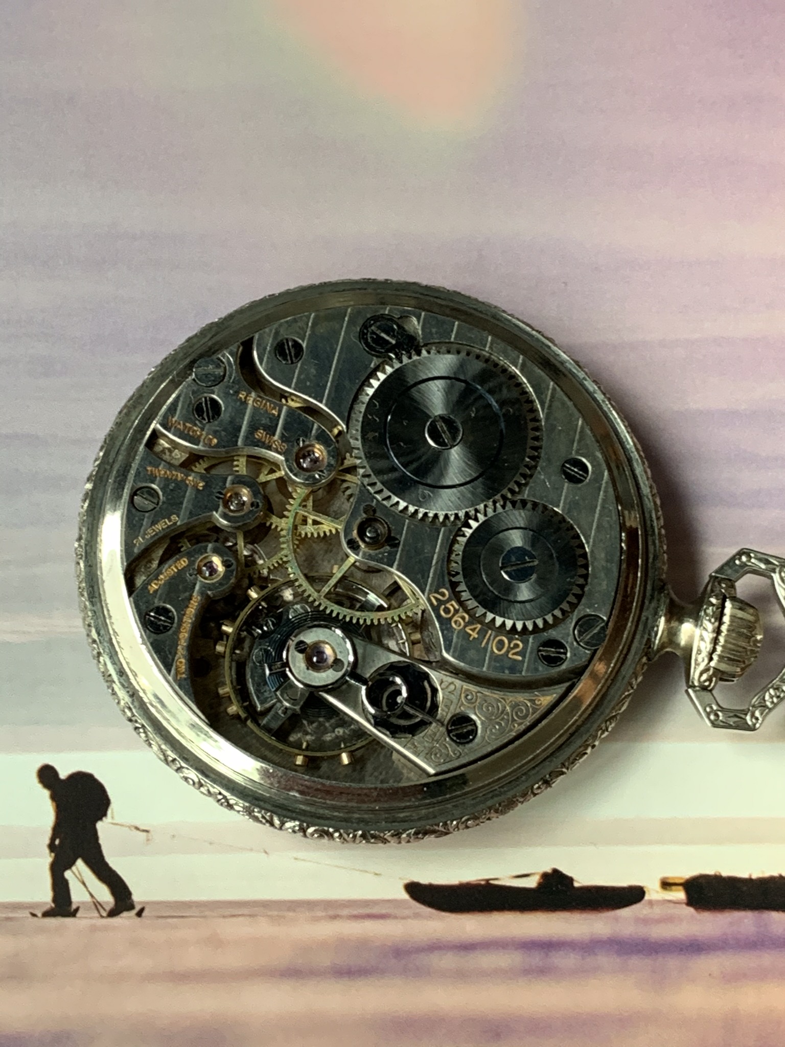 Works serial number 4299796. Watch is a 7 jewels adjusted, 2 positions. Watch works are running about 1 minute fast every 24 hours. Winds and runs without issue. Top of the case is screw on, though I cannot unscrew it which is just as well given the dial materials used. Crystal appears to be a plastic material. Case measures 35.92mm across with the crown and about 37.05 lug mount to mount with a rise off the wrist of 11.69mm. Case is a swiss made nickel. Case serial number 6090476 and marked Regina Watch Co. If you need or want additional information, please don't hesitate to ask, I'll do my best to provide it.