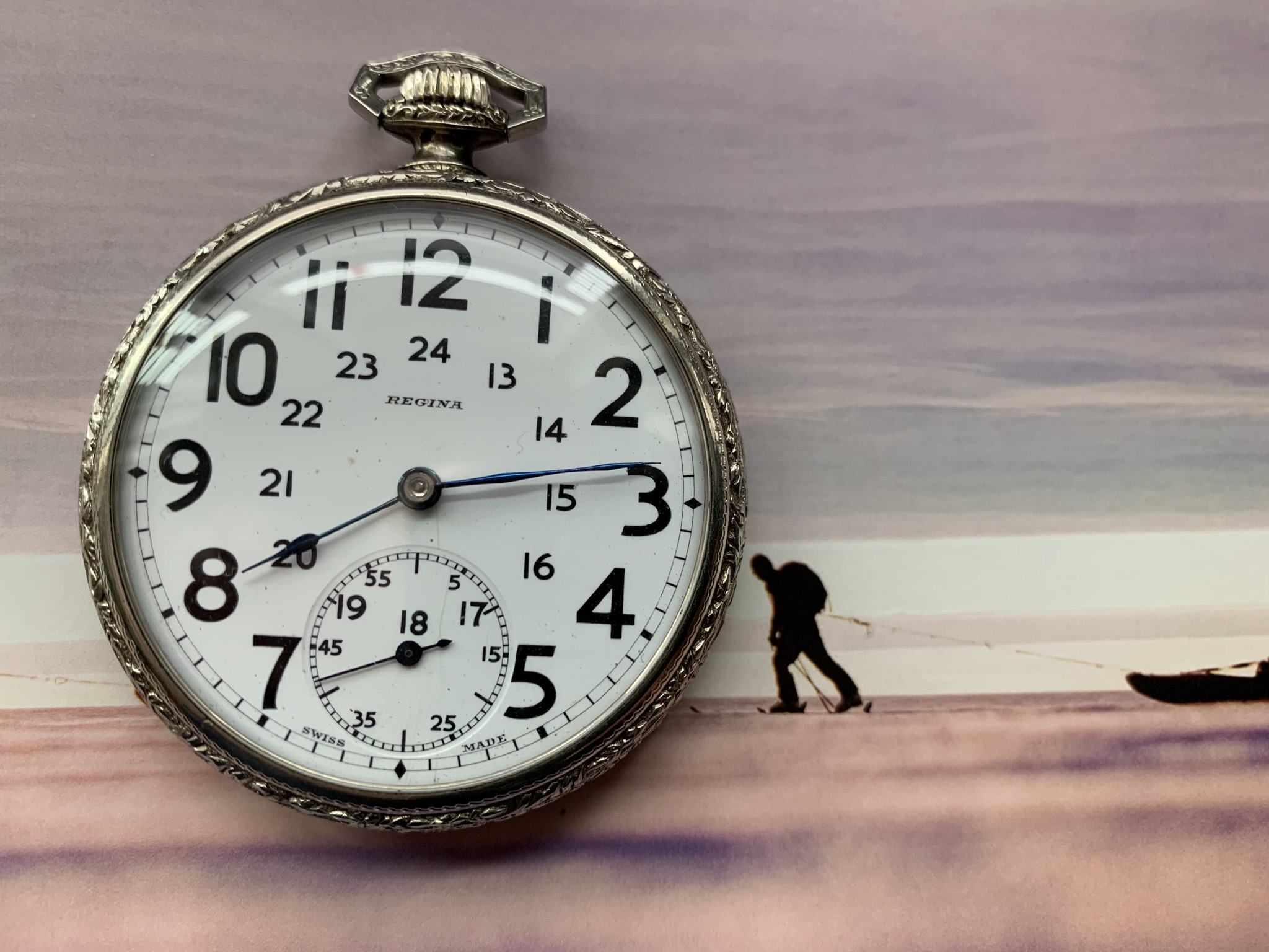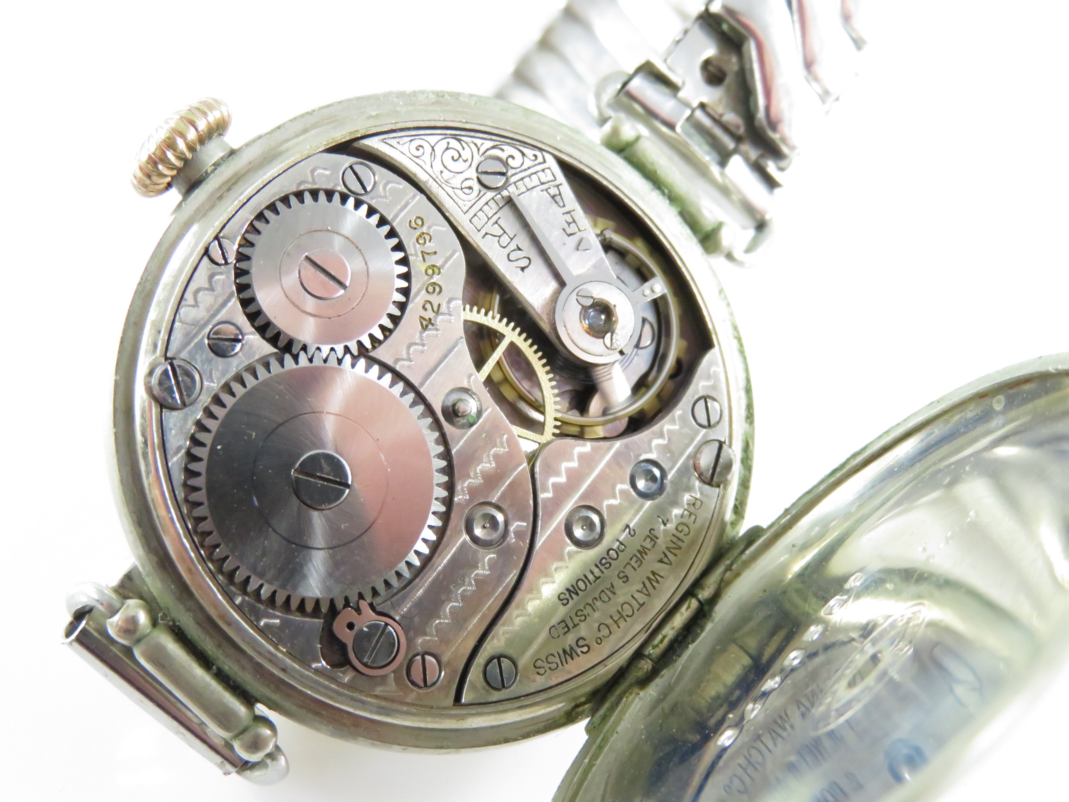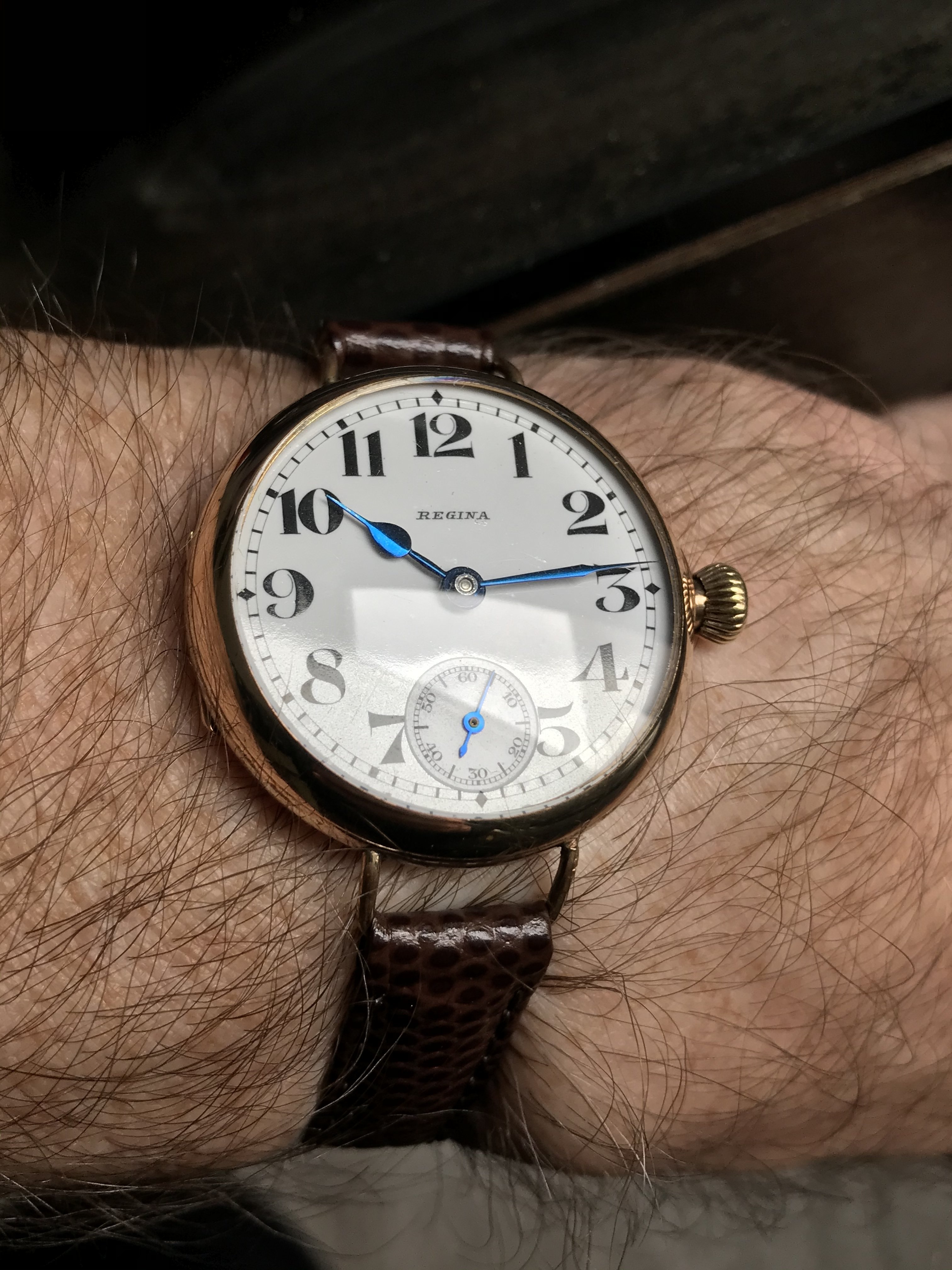 Works serial number 4299796. Watch is a 7 jewels adjusted, 2 positions. Watch works are running about 1 minute fast every 24 hours. Winds and runs without issue. Top of the case is screw on, though I cannot unscrew it which is just as well given the dial materials used. Crystal appears to be a plastic material. Case measures 35.92mm across with the crown and about 37.05 lug mount to mount with a rise off the wrist of 11.69mm. Case is a swiss made nickel. Case serial number 6090476 and marked Regina Watch Co. If you need or want additional information, please don't hesitate to ask, I'll do my best to provide it.