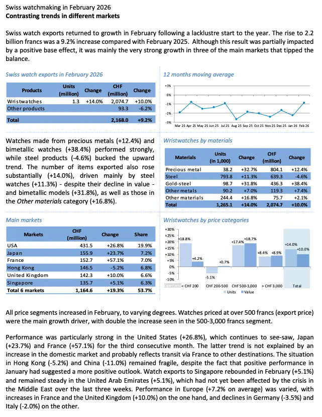 Performance was particularly strong in the United States (+26.8%), which continues to see-saw, Japan (+23.7%) and France (+57.1%) for the third consecutive month. The latter trend is not explained by an increase in the domestic market and probably reflects transit via France to other destinations. The situation in Hong Kong (-5.2%) and China (-11.0%) remained fragile, despite the fact that positive performance in January had suggested a more positive outlook. Watch exports to Singapore rebounded in February (+5.1%) and remained steady in the United Arab Emirates (+5.1%), which had not yet been affected by the crisis in the Middle East over the last three weeks. Performance in Europe (+7.2% on average) was varied, with increases in France and the United Kingdom (+10.0%) on the one hand, and declines in Germany (-3.5%) and Italy (-2.0%) on the other.