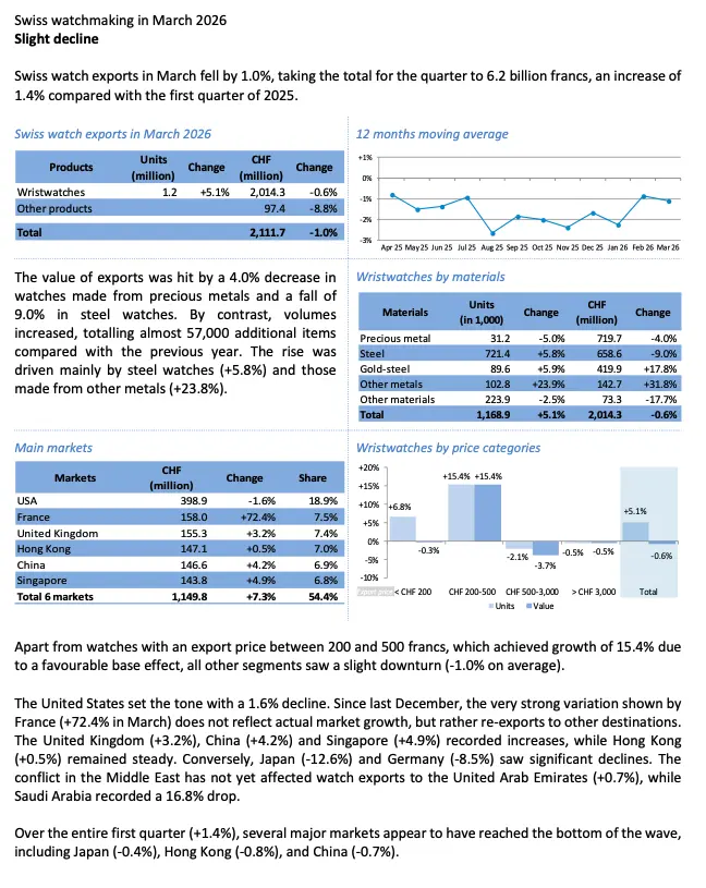 Performance was particularly strong in the United States (+26.8%), which continues to see-saw, Japan (+23.7%) and France (+57.1%) for the third consecutive month. The latter trend is not explained by an increase in the domestic market and probably reflects transit via France to other destinations. The situation in Hong Kong (-5.2%) and China (-11.0%) remained fragile, despite the fact that positive performance in January had suggested a more positive outlook. Watch exports to Singapore rebounded in February (+5.1%) and remained steady in the United Arab Emirates (+5.1%), which had not yet been affected by the crisis in the Middle East over the last three weeks. Performance in Europe (+7.2% on average) was varied, with increases in France and the United Kingdom (+10.0%) on the one hand, and declines in Germany (-3.5%) and Italy (-2.0%) on the other.