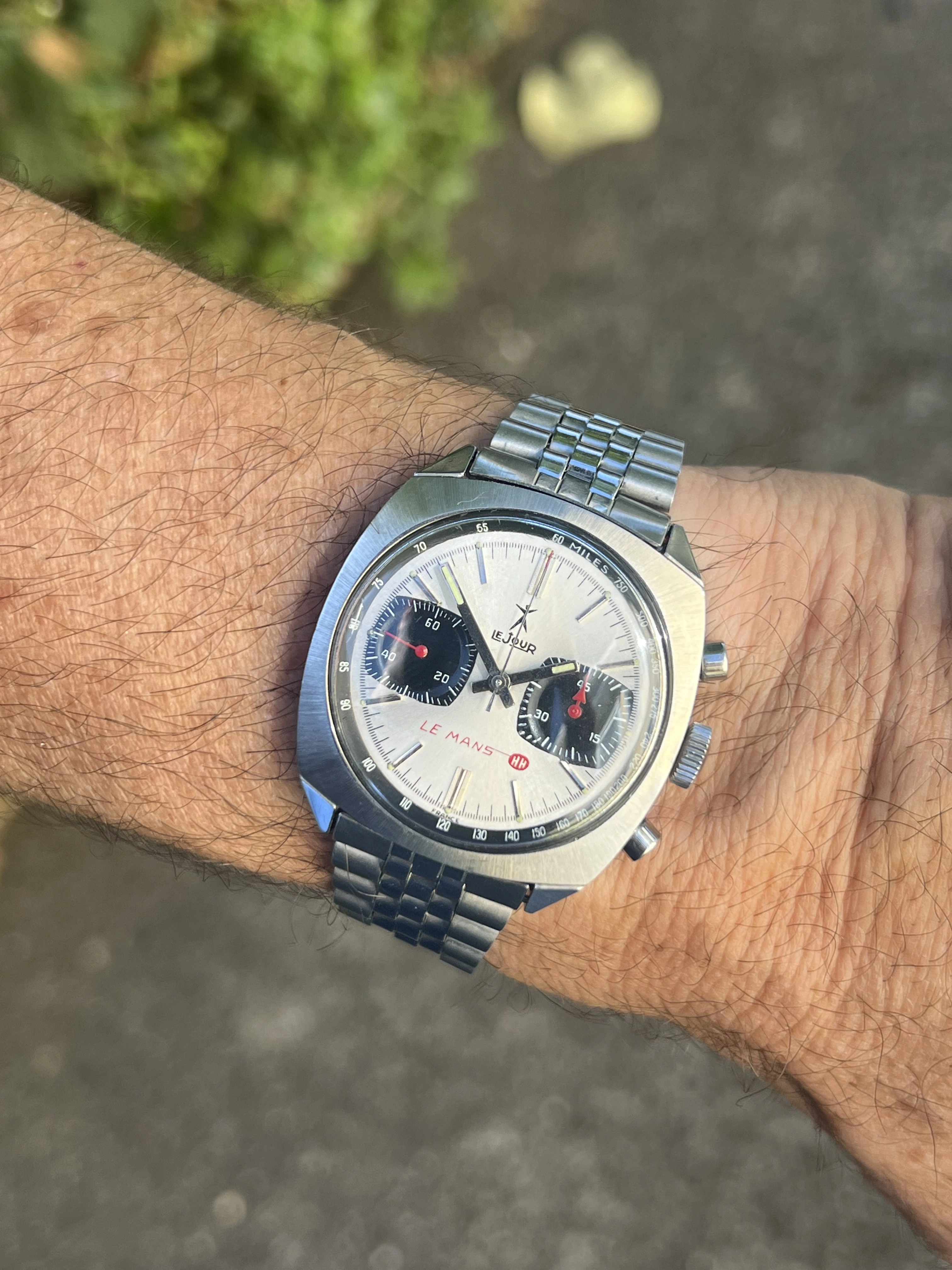 ·I know there are some Omegas with these but this one is a LeJour that has a little crack in the crystal. The tachometer is retaining ring. What is the likelihood that I can replace the crystal and reuse retaining ring? Will probably be difficult to get a good fit. I haven’t pulled the crystal, but will do it to take measurements if it is a possibility. Something else about this watch: apparently it was made to commemorate Hans Herman’s 1970 LeMans win.