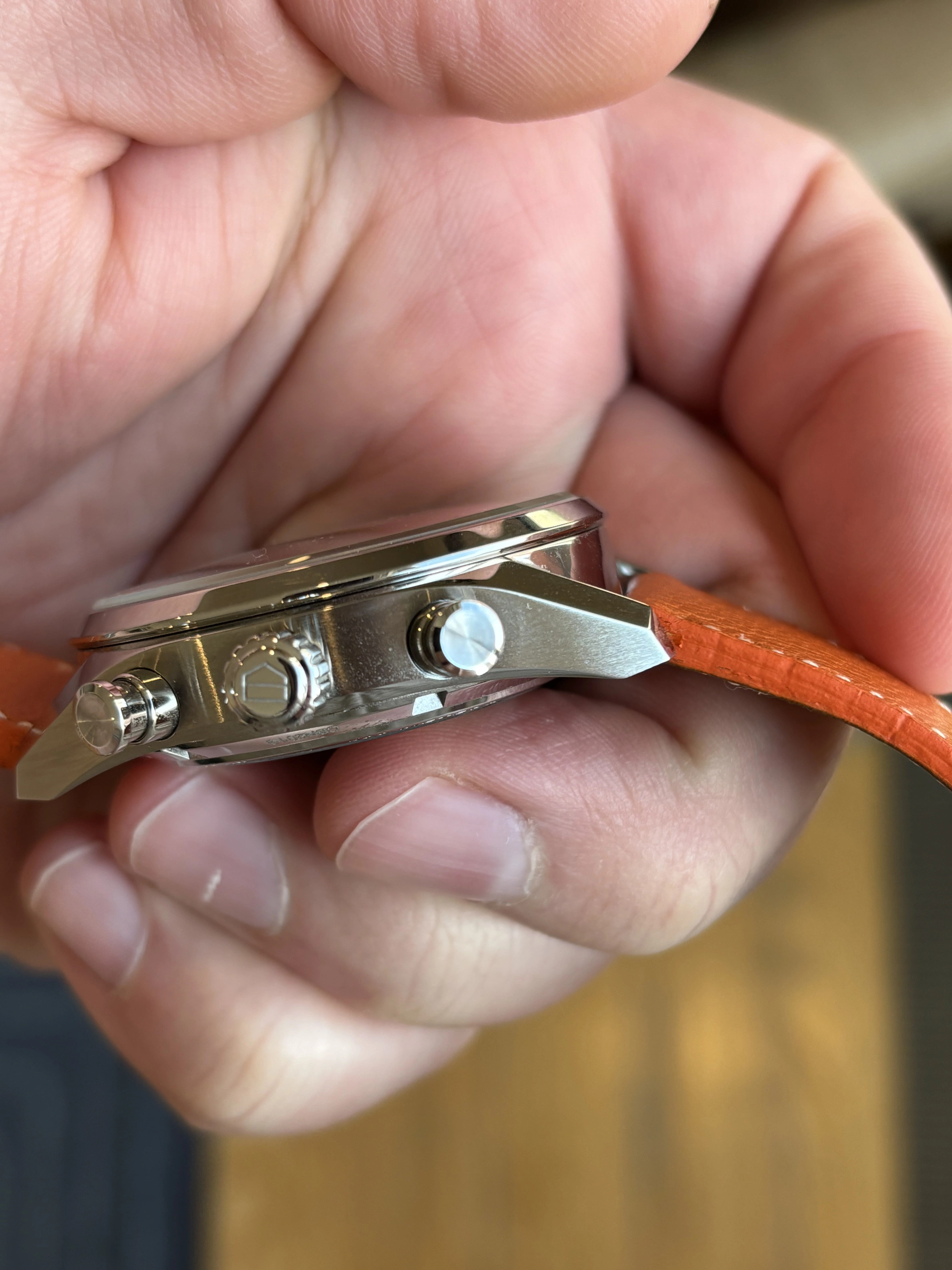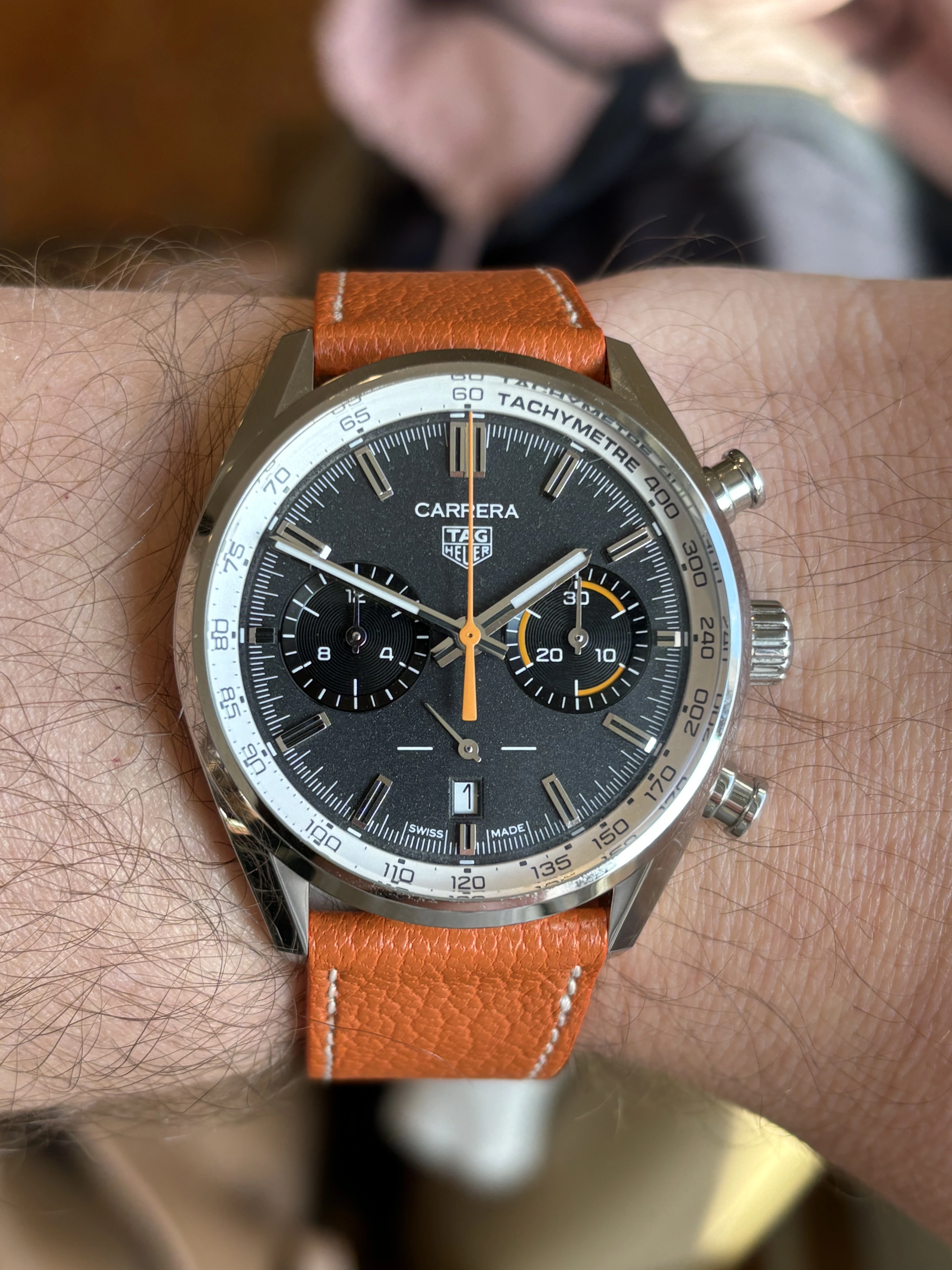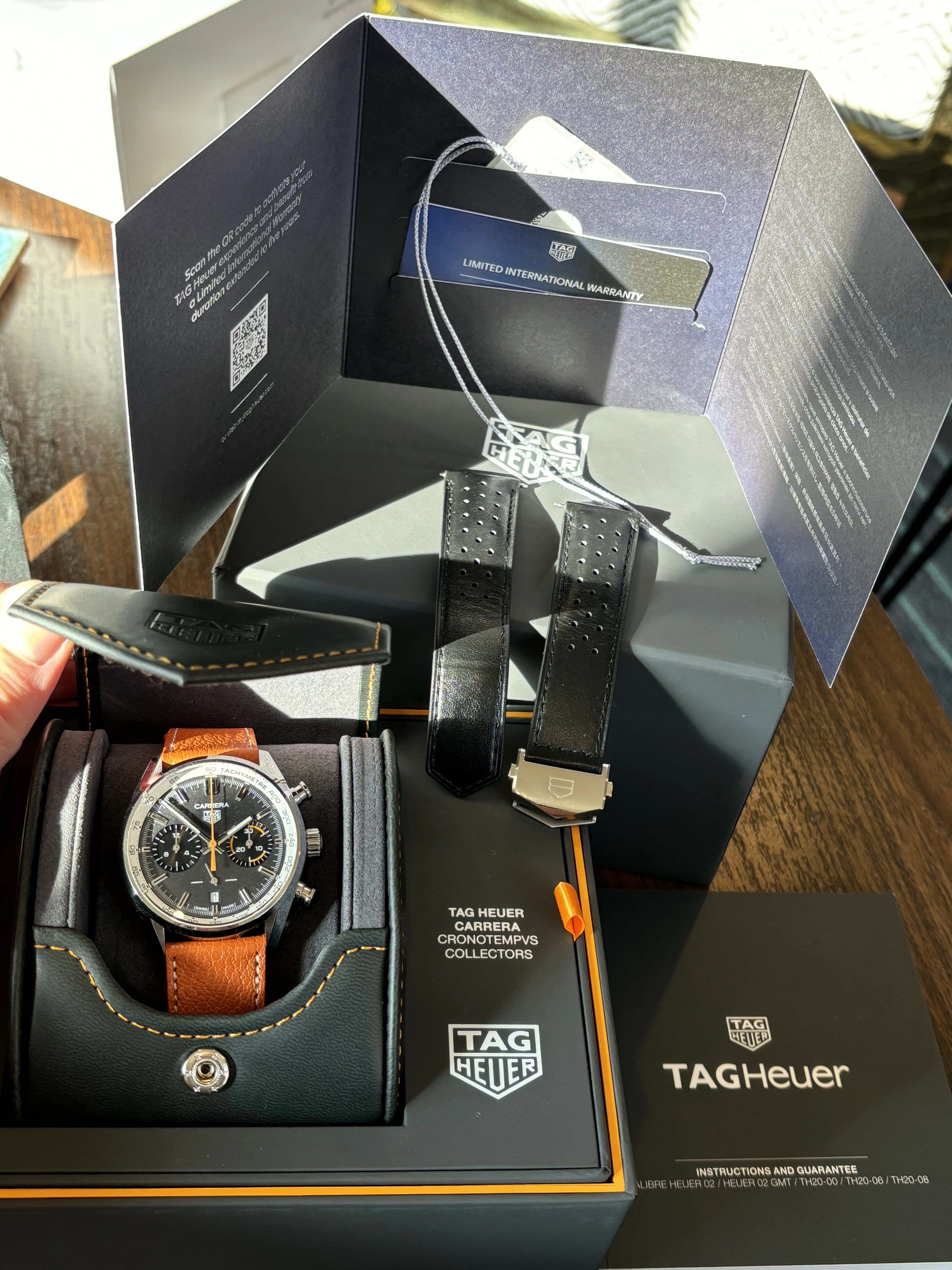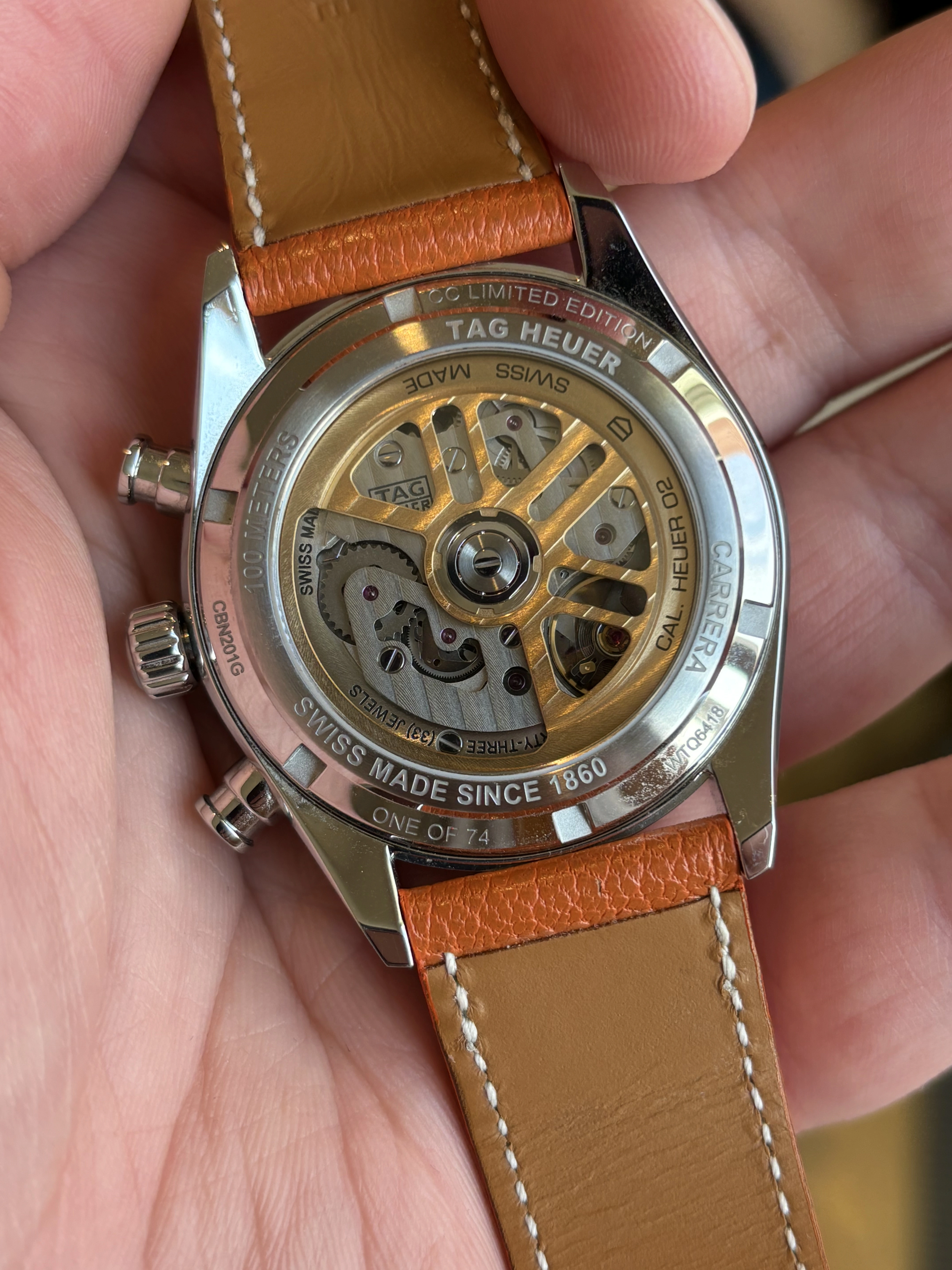 Comes as a full set with the original TAG Heuer racing strap and deployant clasp; includes the orange goatskin Hodinkee strap in the photos as well.
