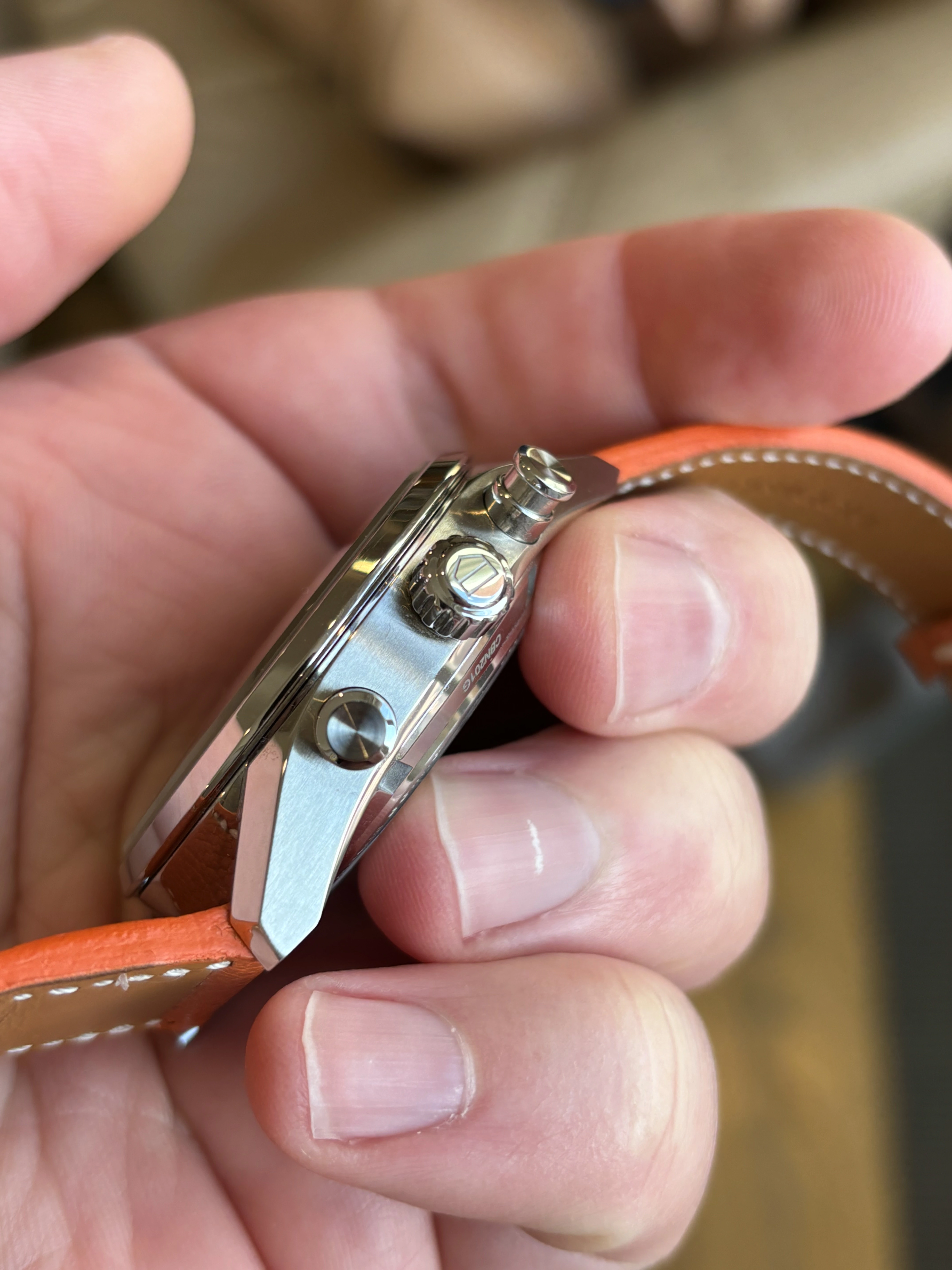 42mm size wears well with the model-exclusive white tachymeter track. Reference is CBN201G
