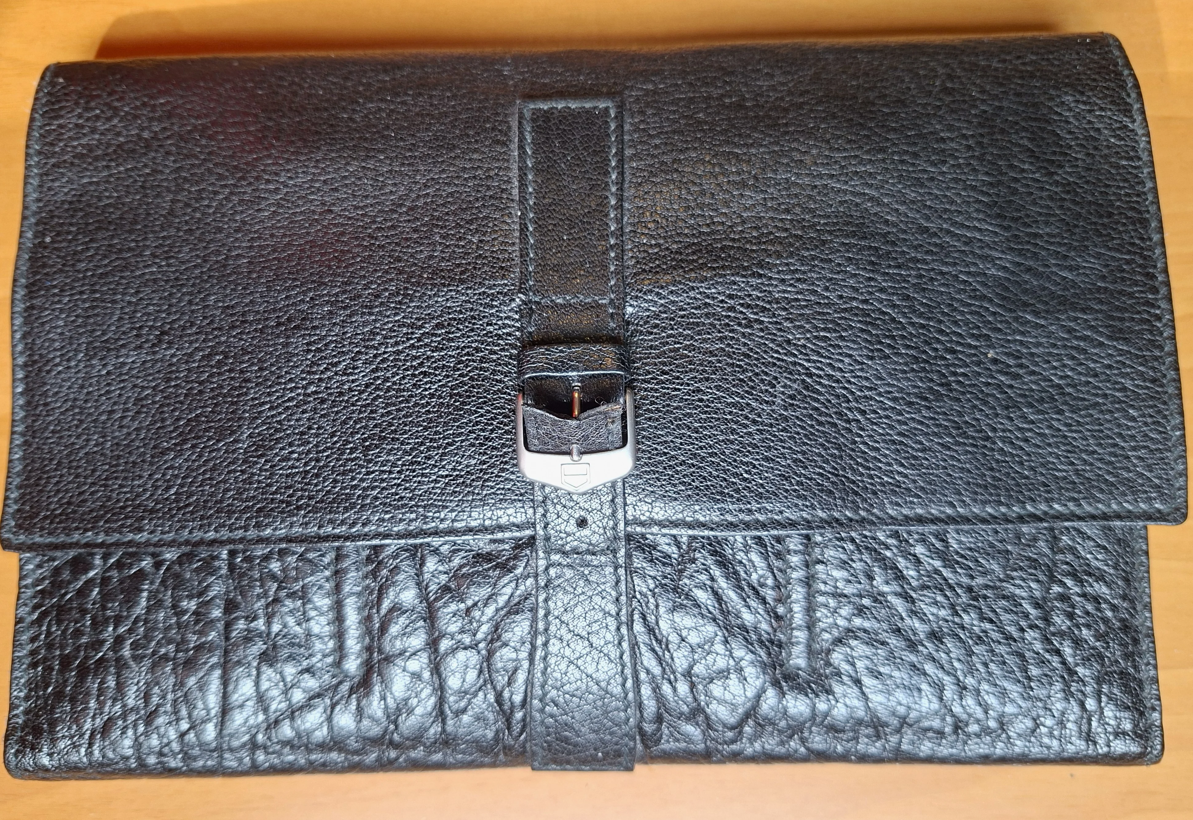 The leather pouch is missing the final tip of the closing strap, but you can close it without problems (you can see it in the last photo).