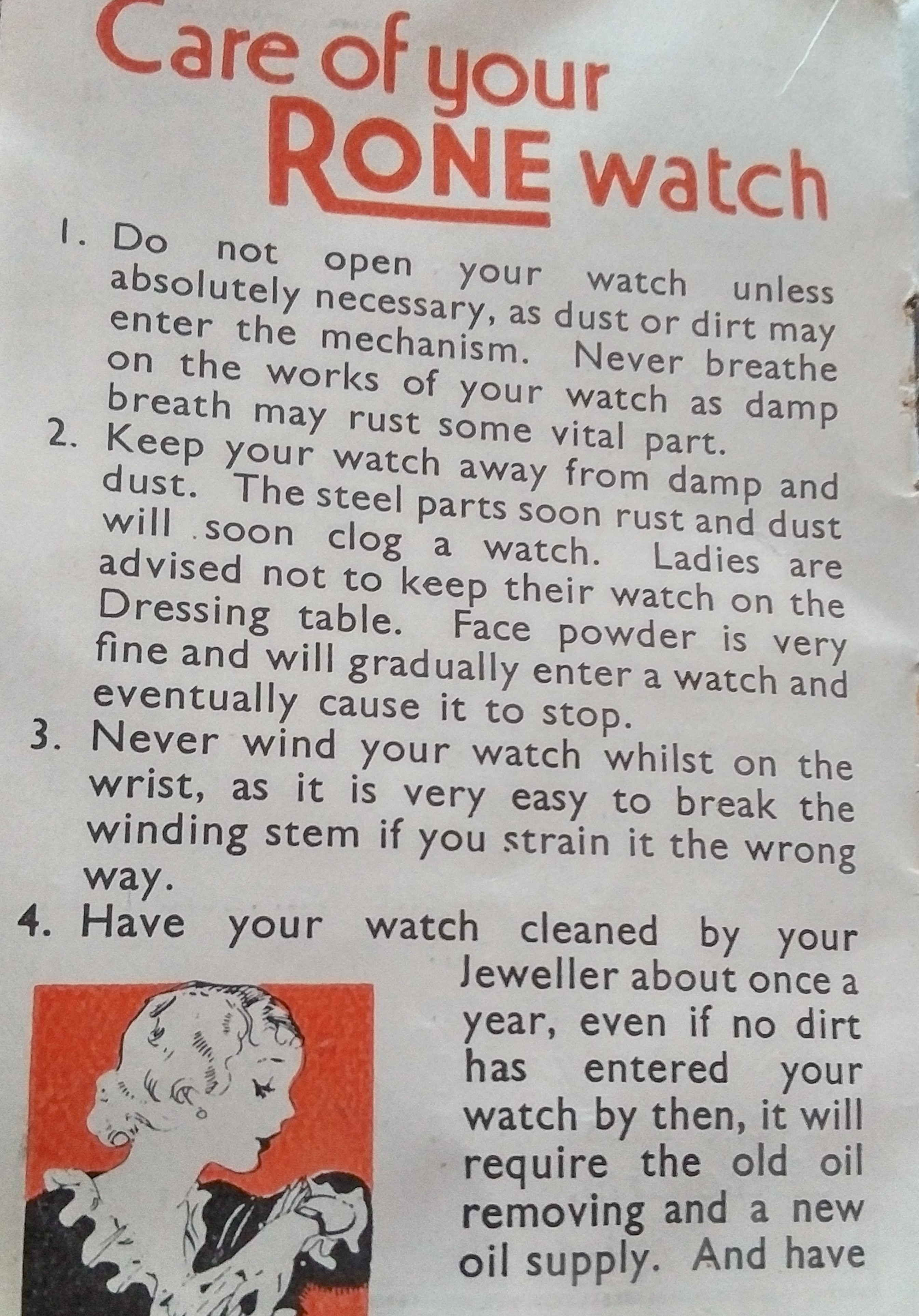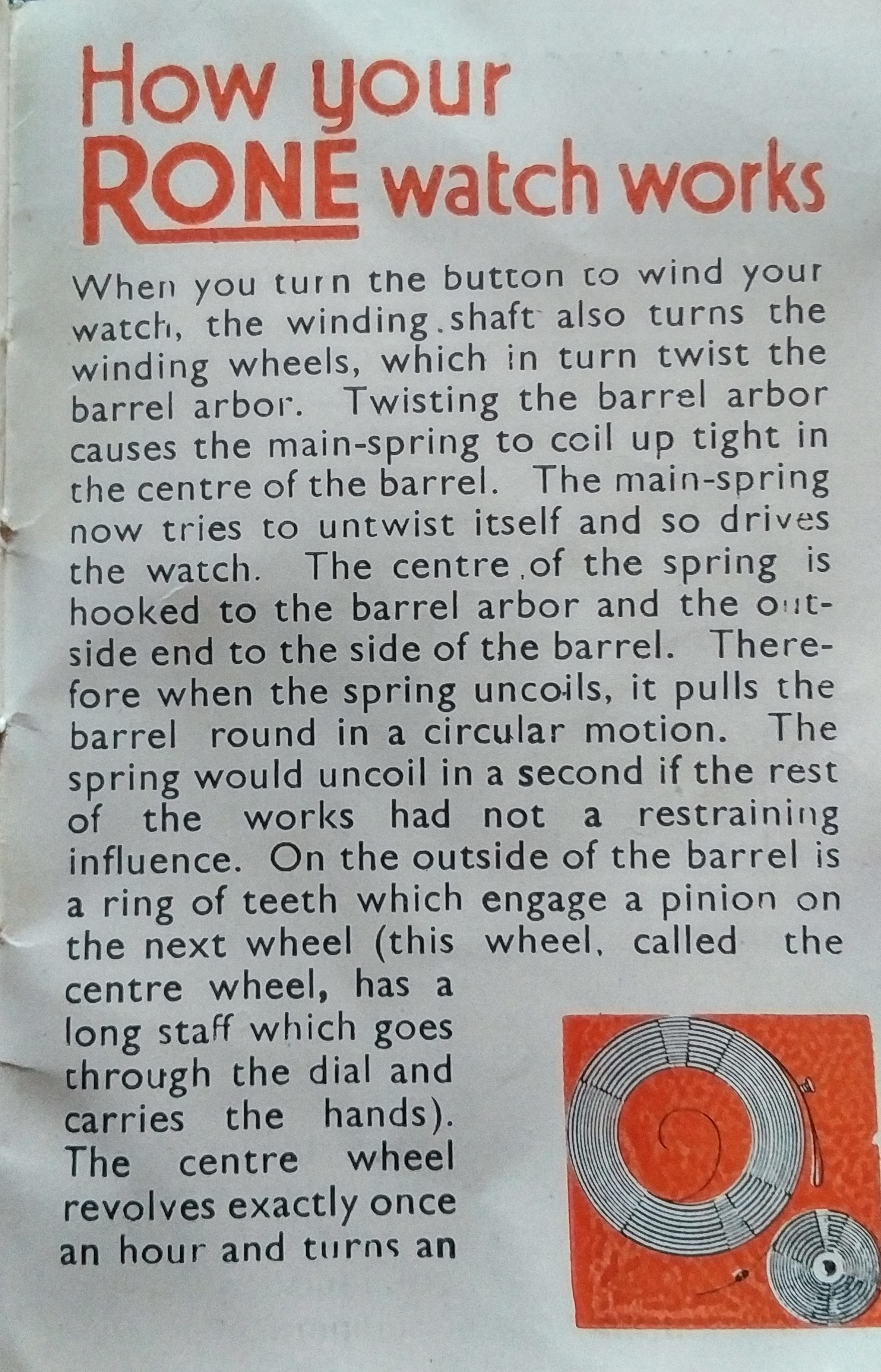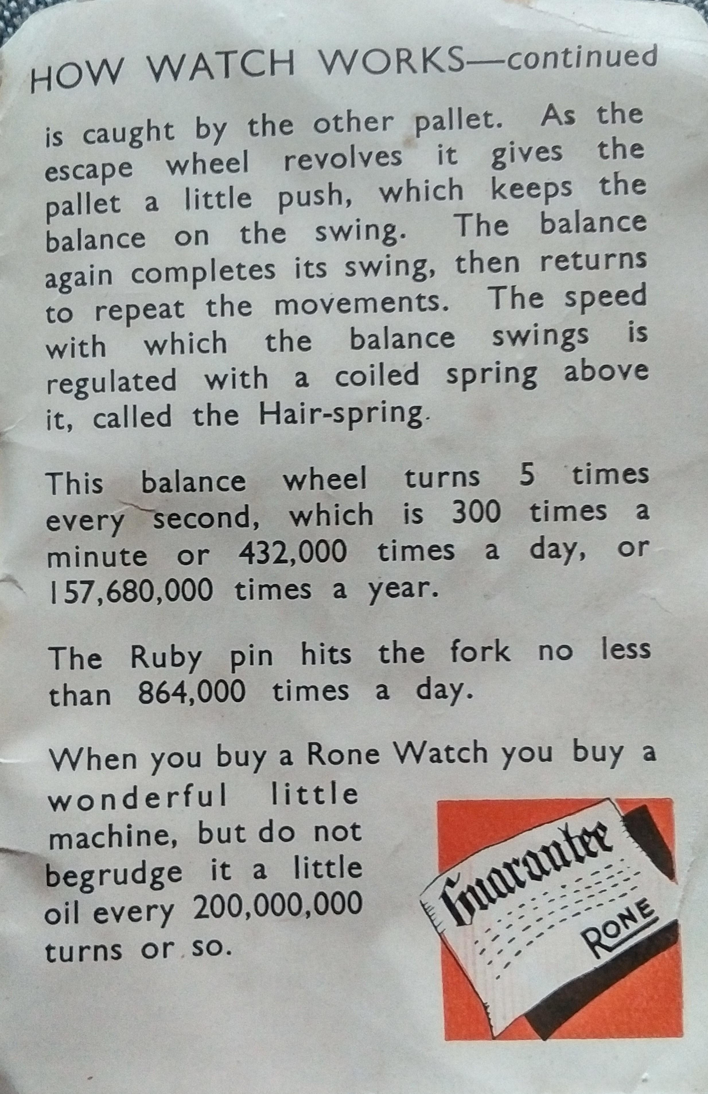 Also noted the advice to get the watch "cleaned" once a year, and they go on the talk about a proper service including full disassembly of the watch, clean, lube, adjusting. The use of natural oils back then meant that when the oil aged it would gum up and stop the watch, and it didn't take long for the oils to fail compared to modern watch oils. Modern oils just sort of dry up and mostly disappear, so they don't add enough drag to stop the watch. The do last longer, but it's a double edged sword because watches will run and run after the oils are gone, leading to pretty severe wear.