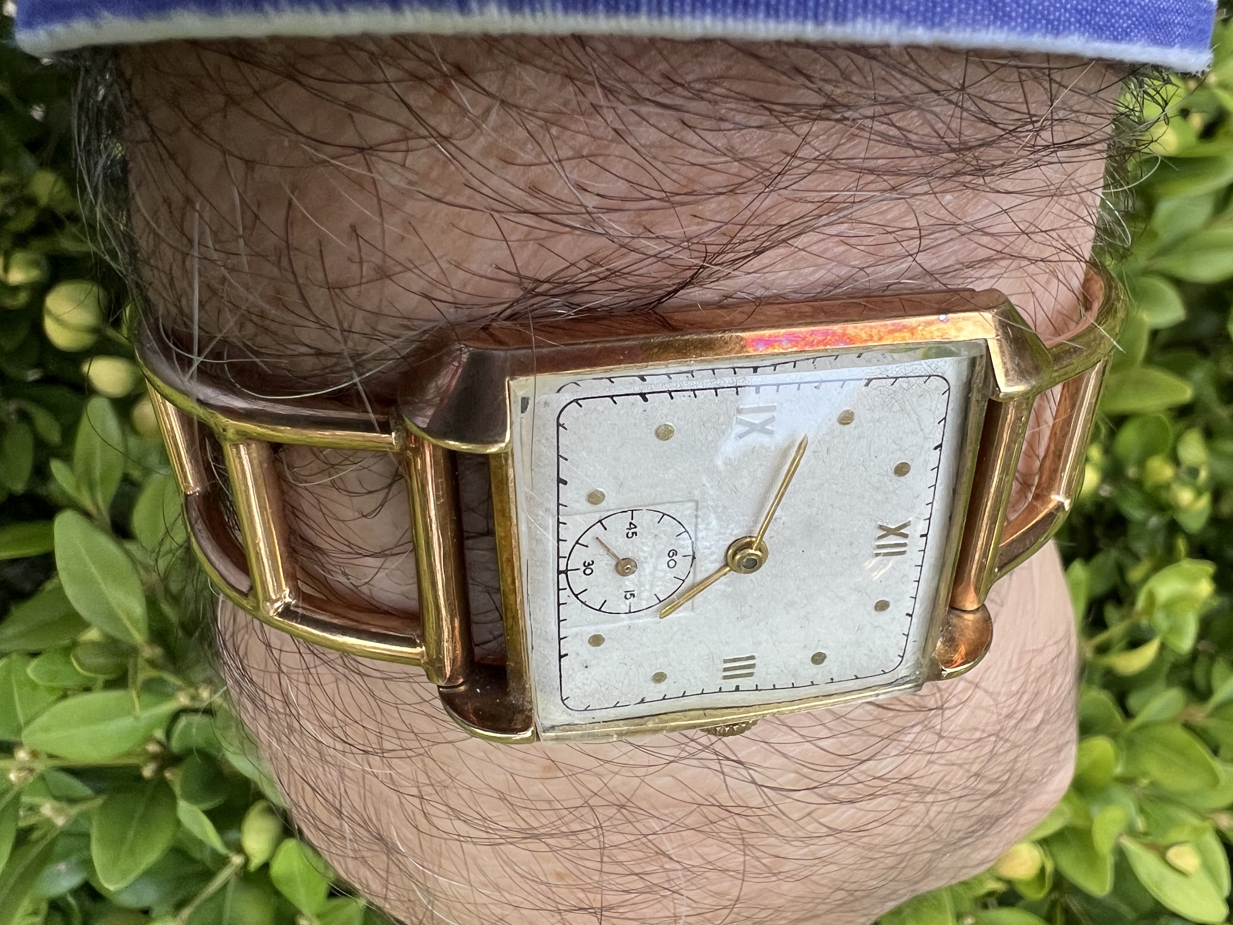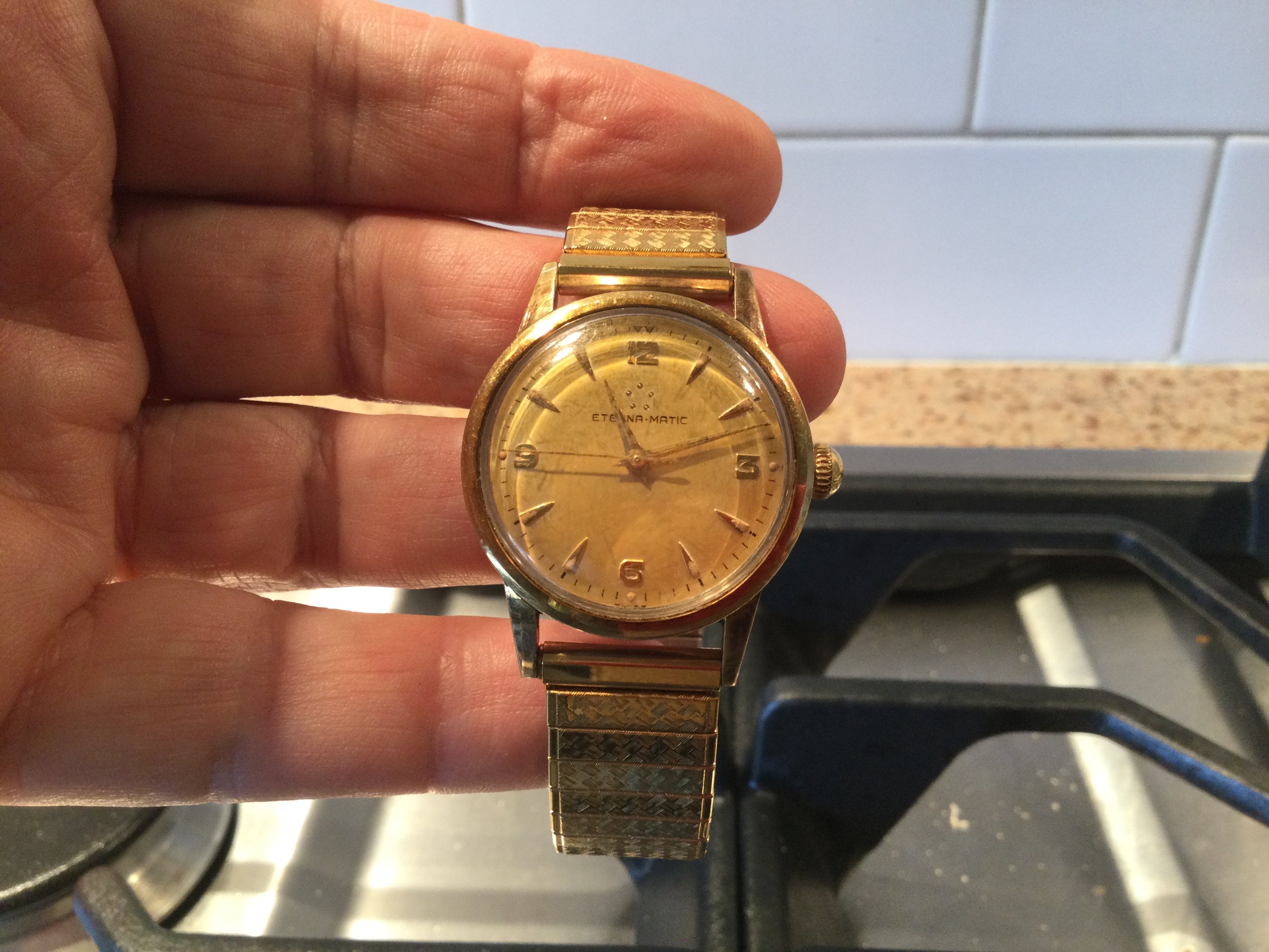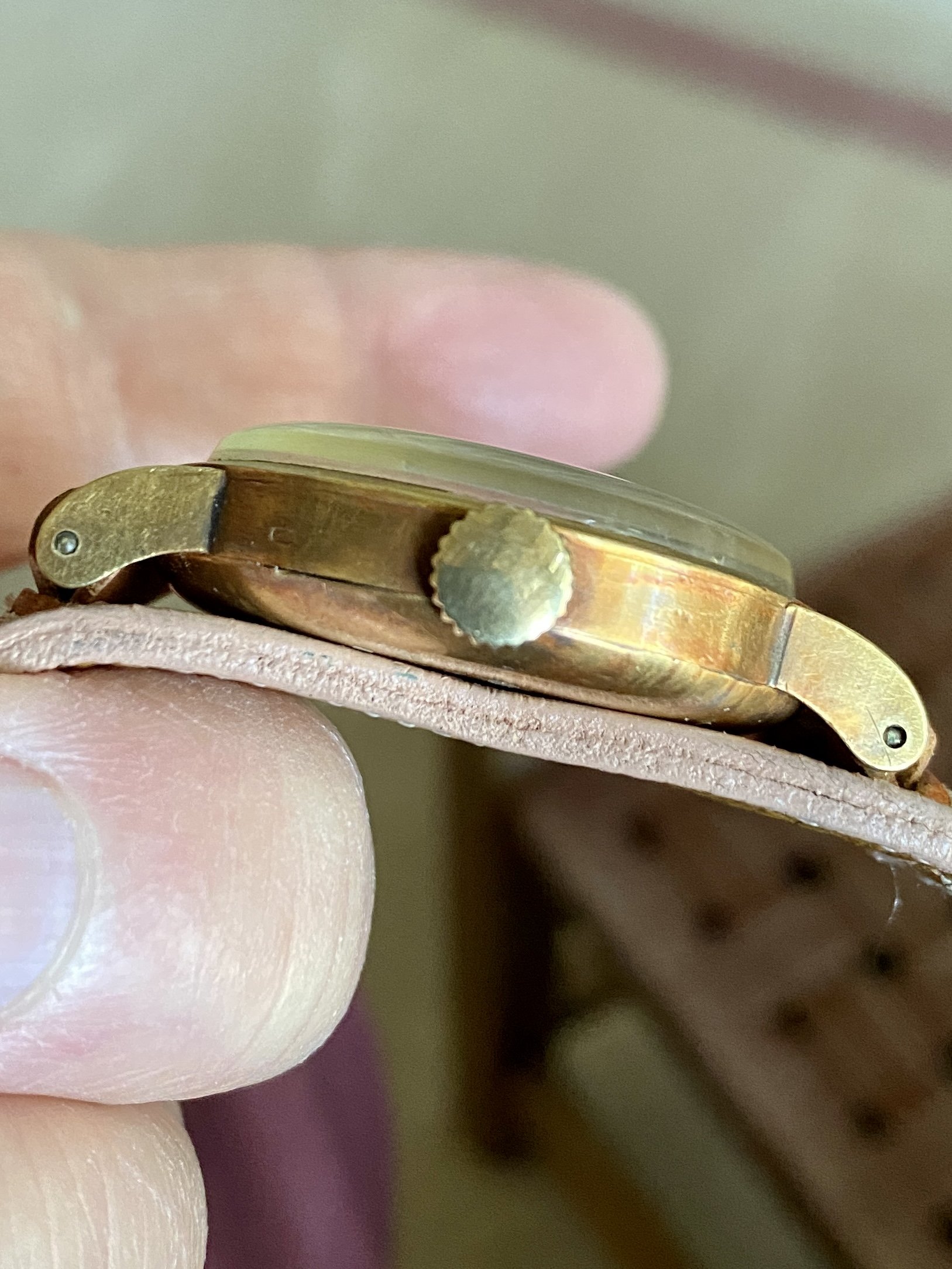 I get this type f tarnish on my gold capped constellation. I leave it and some of it comes off as I wear and some stays. Wood produces lots of acidic gases, so a wooden drawer, is often quite good at producing tarnish.