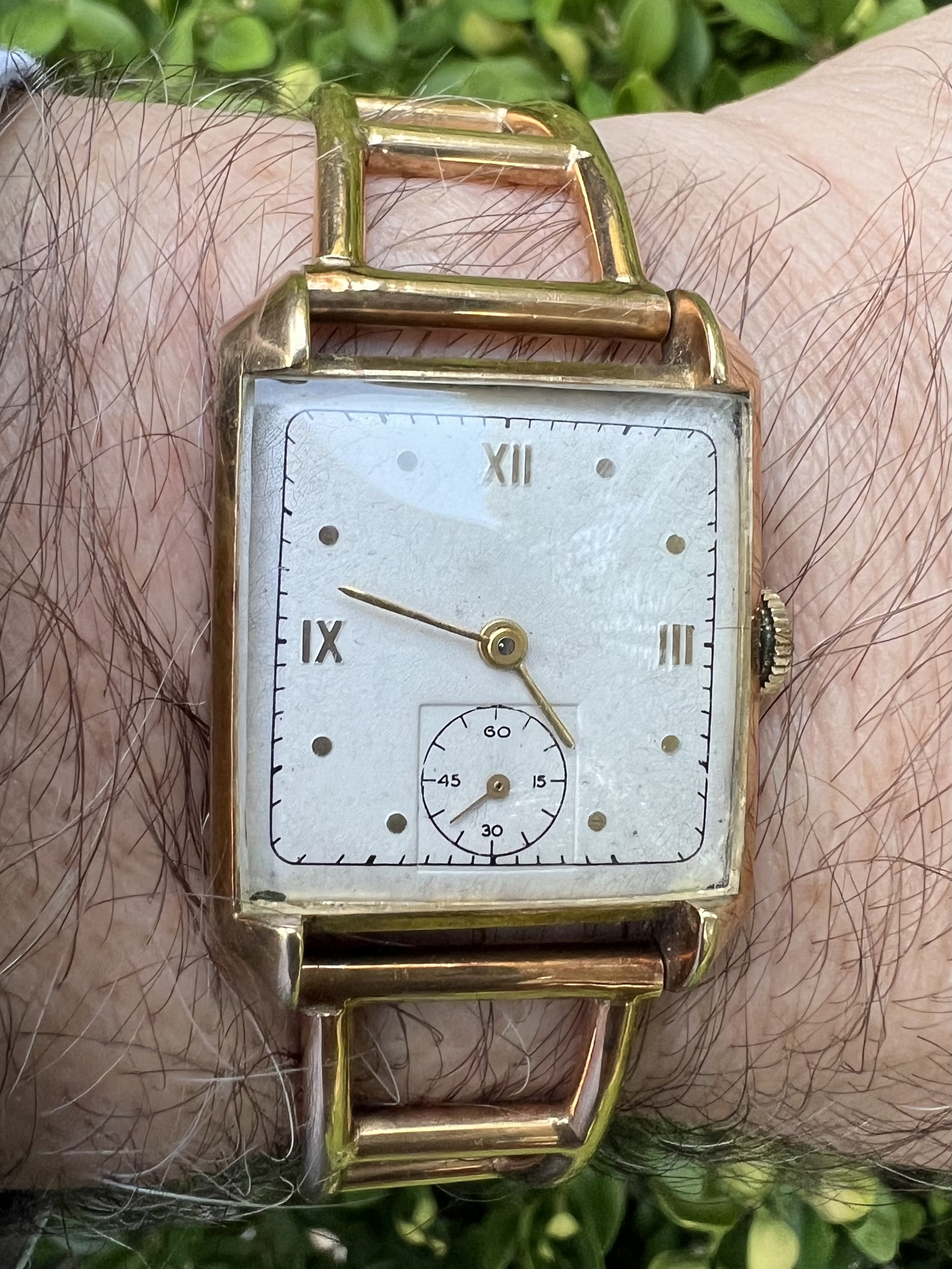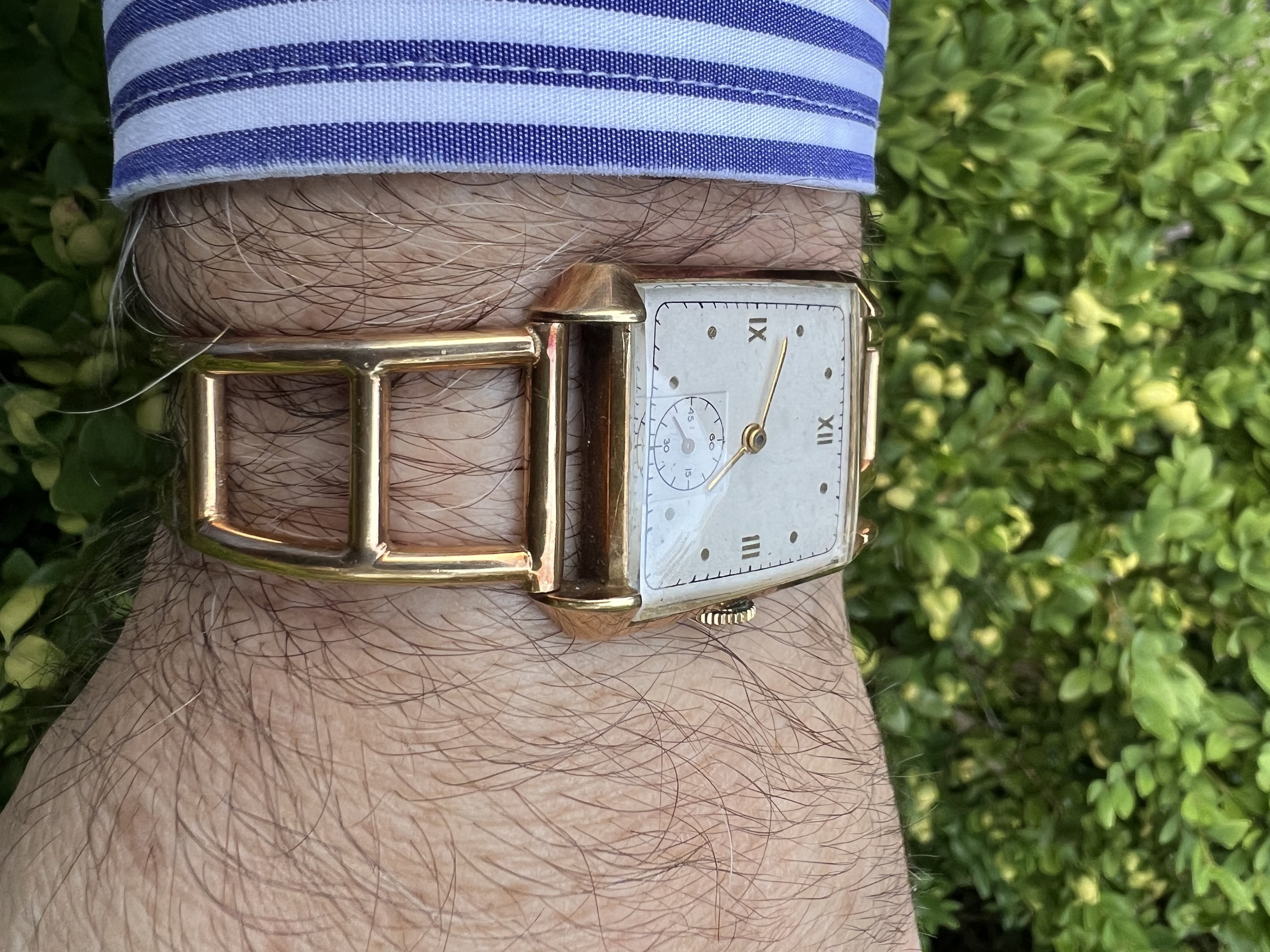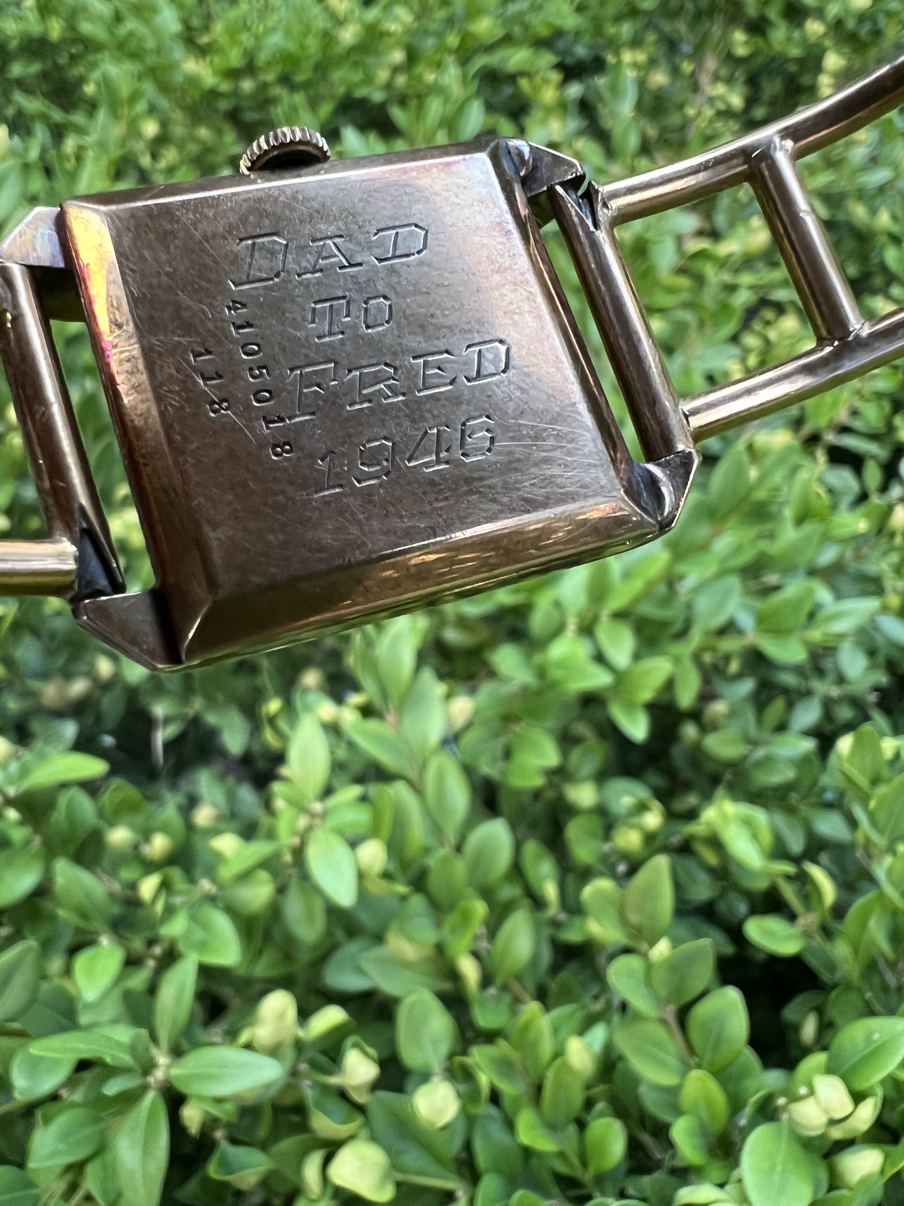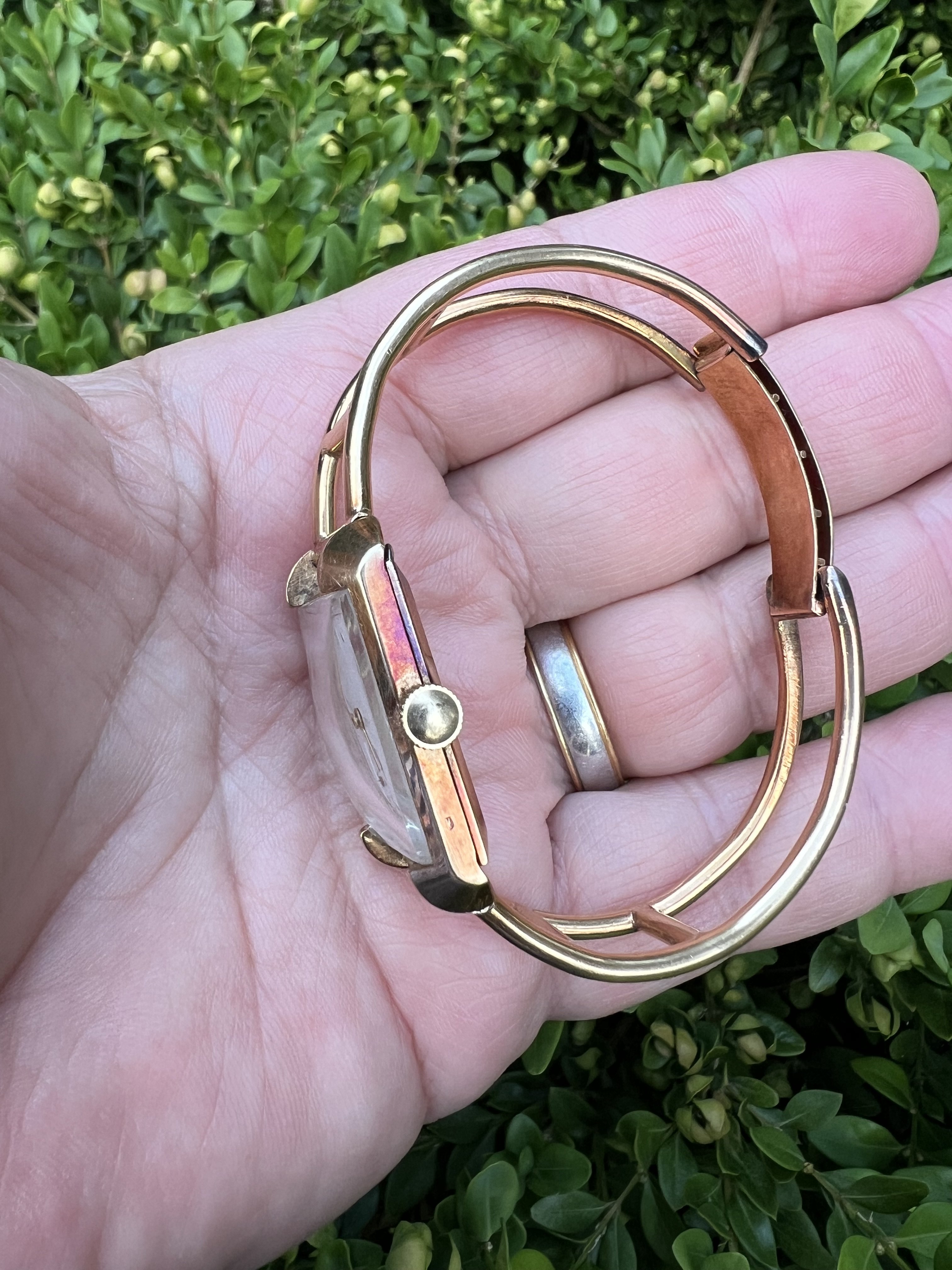 I get this type f tarnish on my gold capped constellation. I leave it and some of it comes off as I wear and some stays. Wood produces lots of acidic gases, so a wooden drawer, is often quite good at producing tarnish.