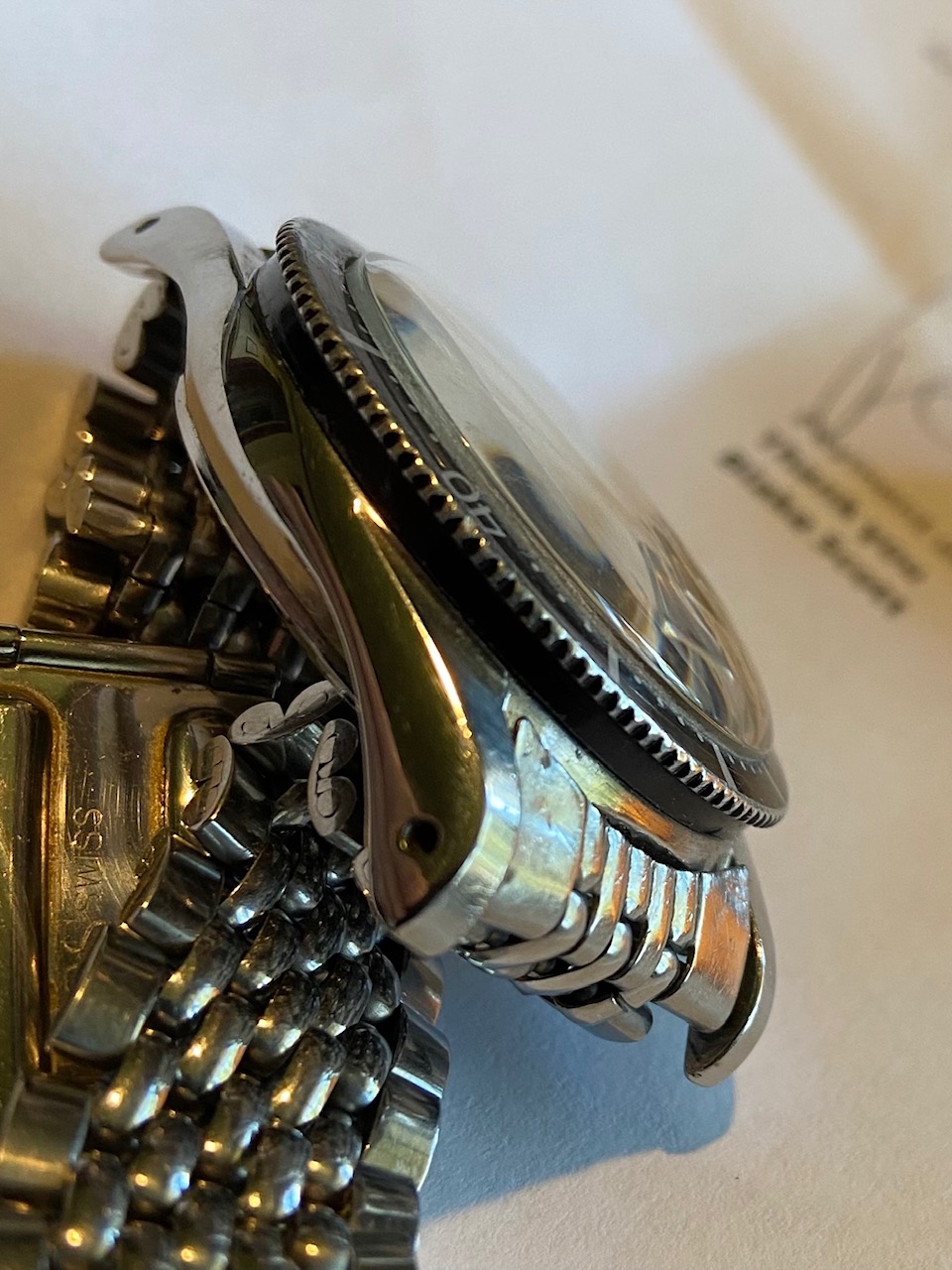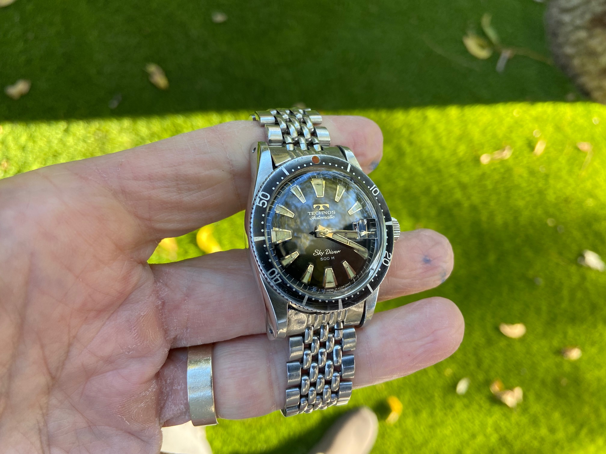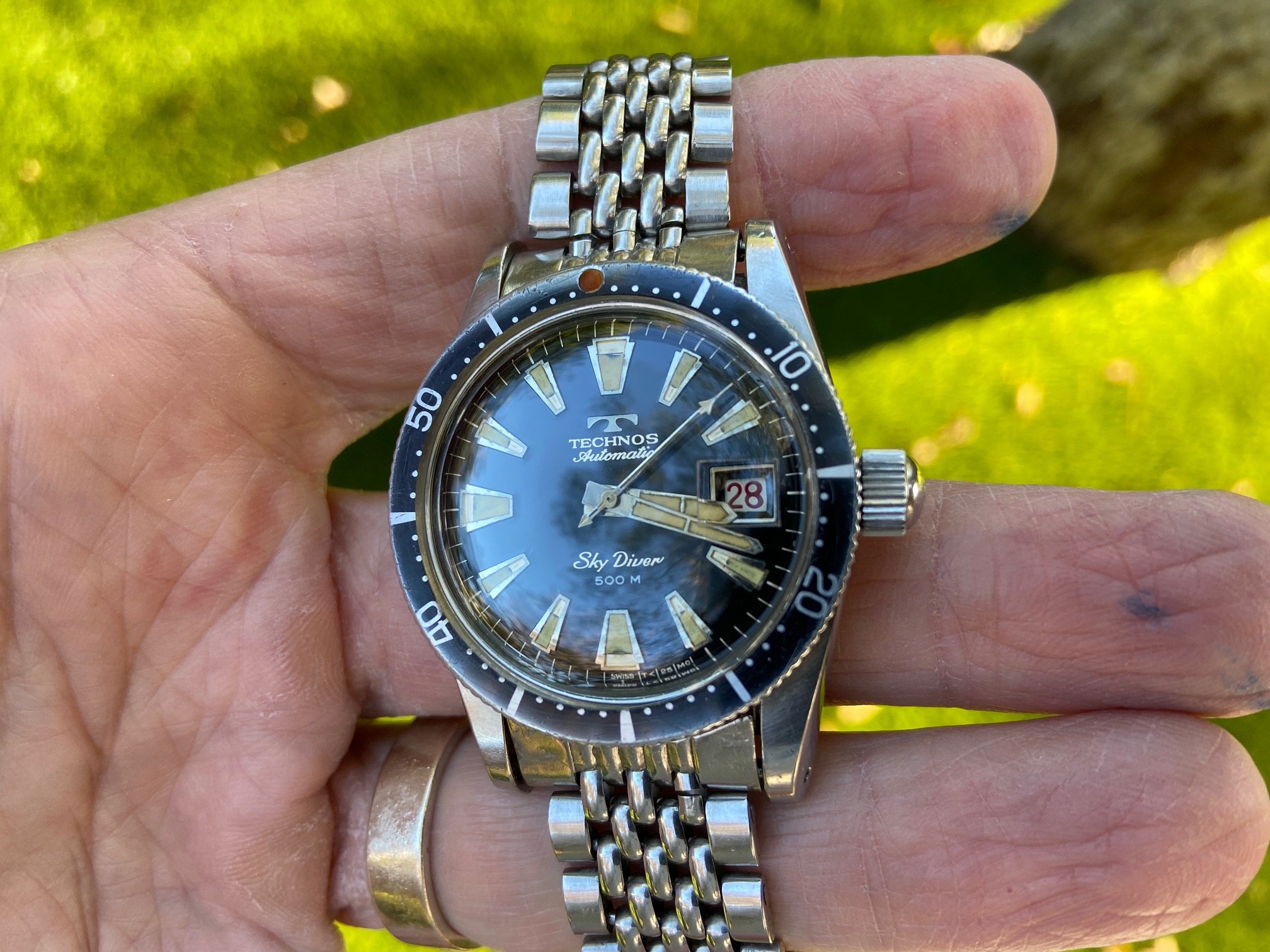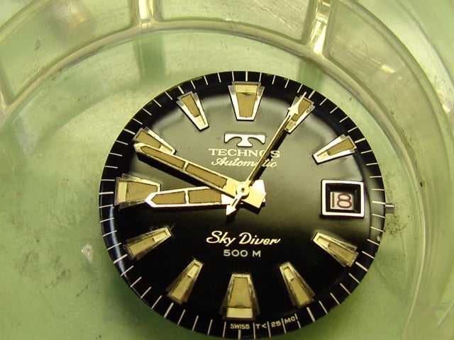 Dial: Excellent condition, super glossy 500 meter (gilt and silver print). Many Sky Diver dials did not age well, this one did.