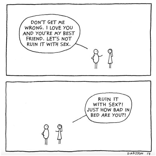 “Well, I was making love to her, kissing her on the neck, and I gave her a little bite. Then she farted, flew out the window, and took my teeth with her!!!”