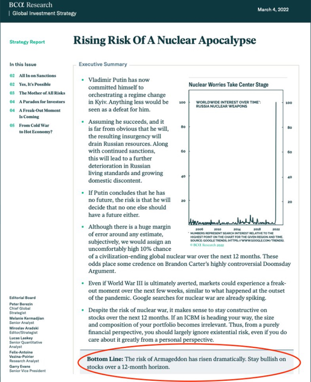 Posts 3,066 Likes 14,325 Wryfox ·Mar 5, 2022 Tony C. Investment advice for the glass half-full crowd. So spend like hell because if we all die, it won't matter anyway. Given that argument, same could be said about booze and hookers.... 🍿