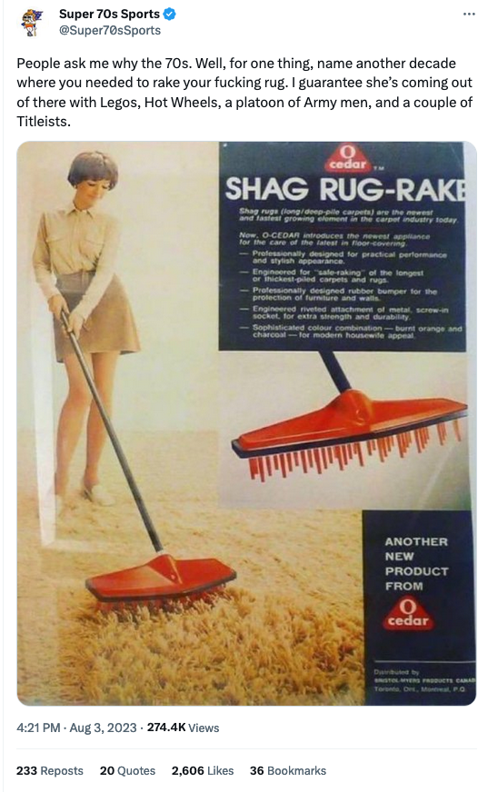 Posts 8,064 Likes 28,346 Tony C. ·Aug 28, 2023·Ωf Jury member I've been waiting for years to contribute to a consecutive shag carpet joke thread! 😁