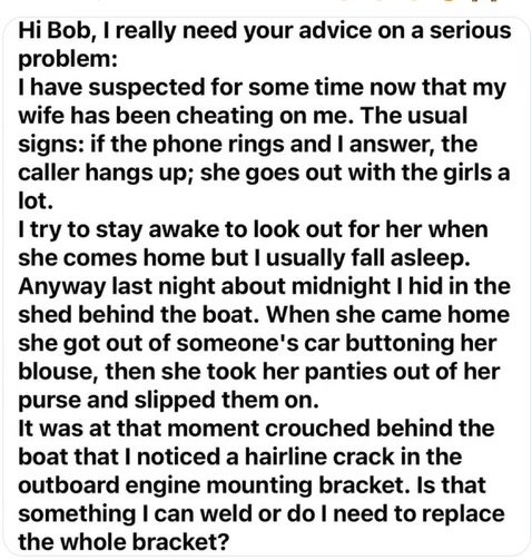 "Now," she announced in a quivering voice, "Thank the Lord, Ted is out of the hospital and the doctors say that with time, his scrotum should recover completely."