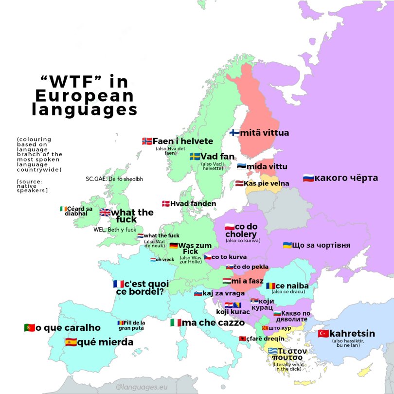 A little correction in the Norwegian "Faen i helvete" that means "The devil in hell" with an exclamation mark. The other is more correct "Hva det faen" appart from the "det". The correct translation of WTF in Norwegian is " Hva Faen" it can be expanded with other words, especially if you live in the north of the country. The it becomes something like this; "Ka faen i svarte hule heite hestkuk helvete" and thats when they speak to children and friends.