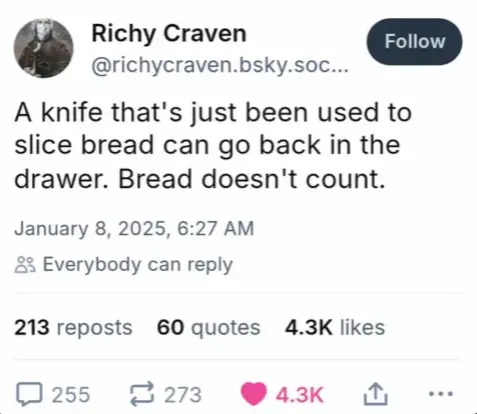 Posts 2,656 Likes 5,412 Charlemagne1333 ·Jan 13, 2025 DaveK I don't think it matters who uses the knife. You took the words right out of my mouth… 😉