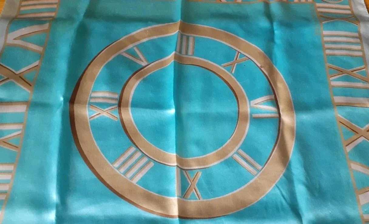 "The Harve Benard Scarf Pocket Square is a 21" square made of 100% silk, featuring a unique clock pattern and a turquoise color. This vintage-inspired accessory is perfect for men who appreciate time pieces and have a casual yet sophisticated style."
