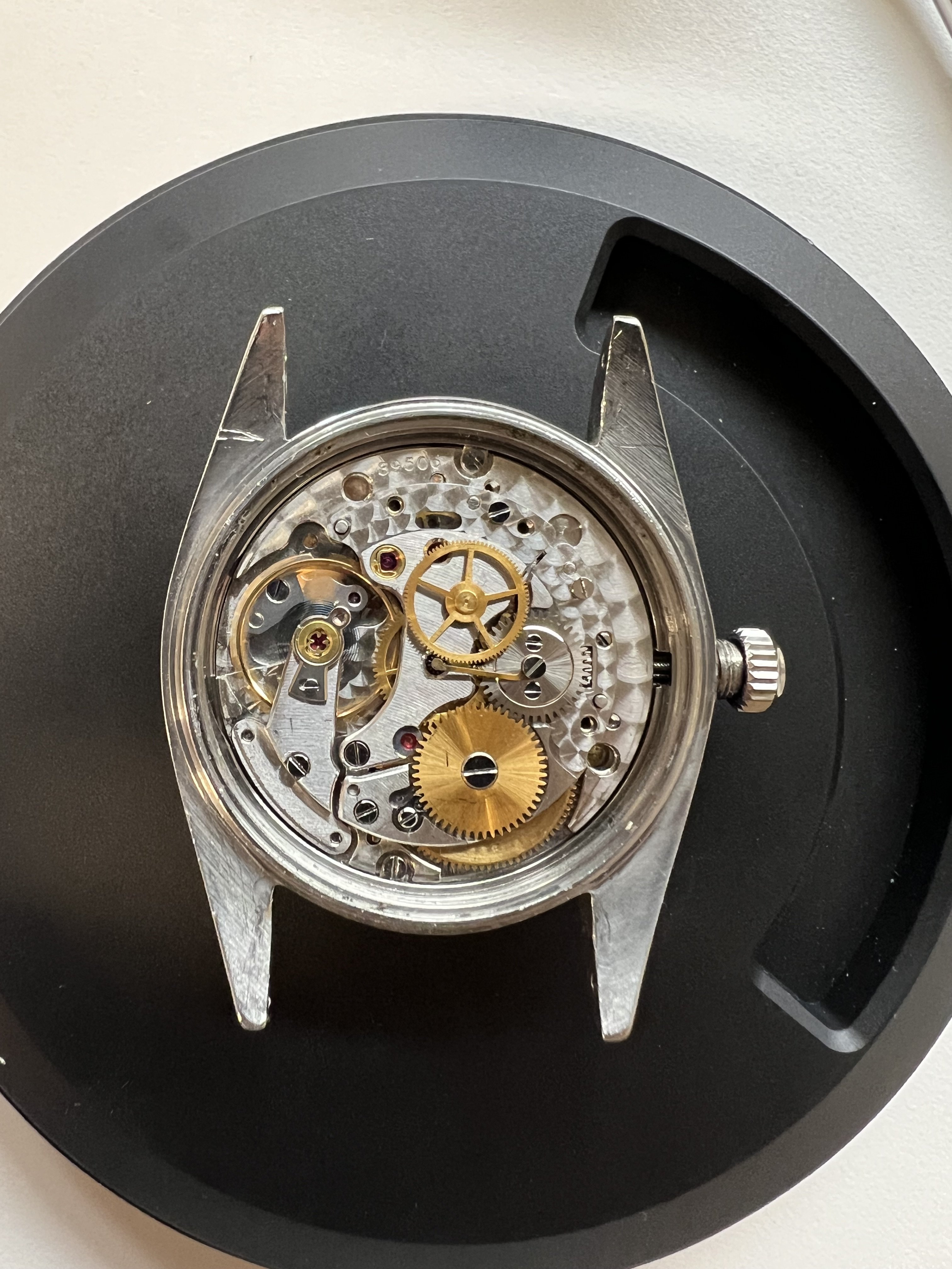 ·Is it just me or do movement clamps have wings! I spent about 10 minutes staring at the carpet under magnification and then thought, I have a tool for this! And Hazzah, it worked! On another note, have you ever seen movement clamps on a Rolex movement? This 1018 has them and I was a bit puzzled. I tried using the typical Rolex movement screws but I didn’t have enough clearance. I guess this dial is slightly thicker than the norm.