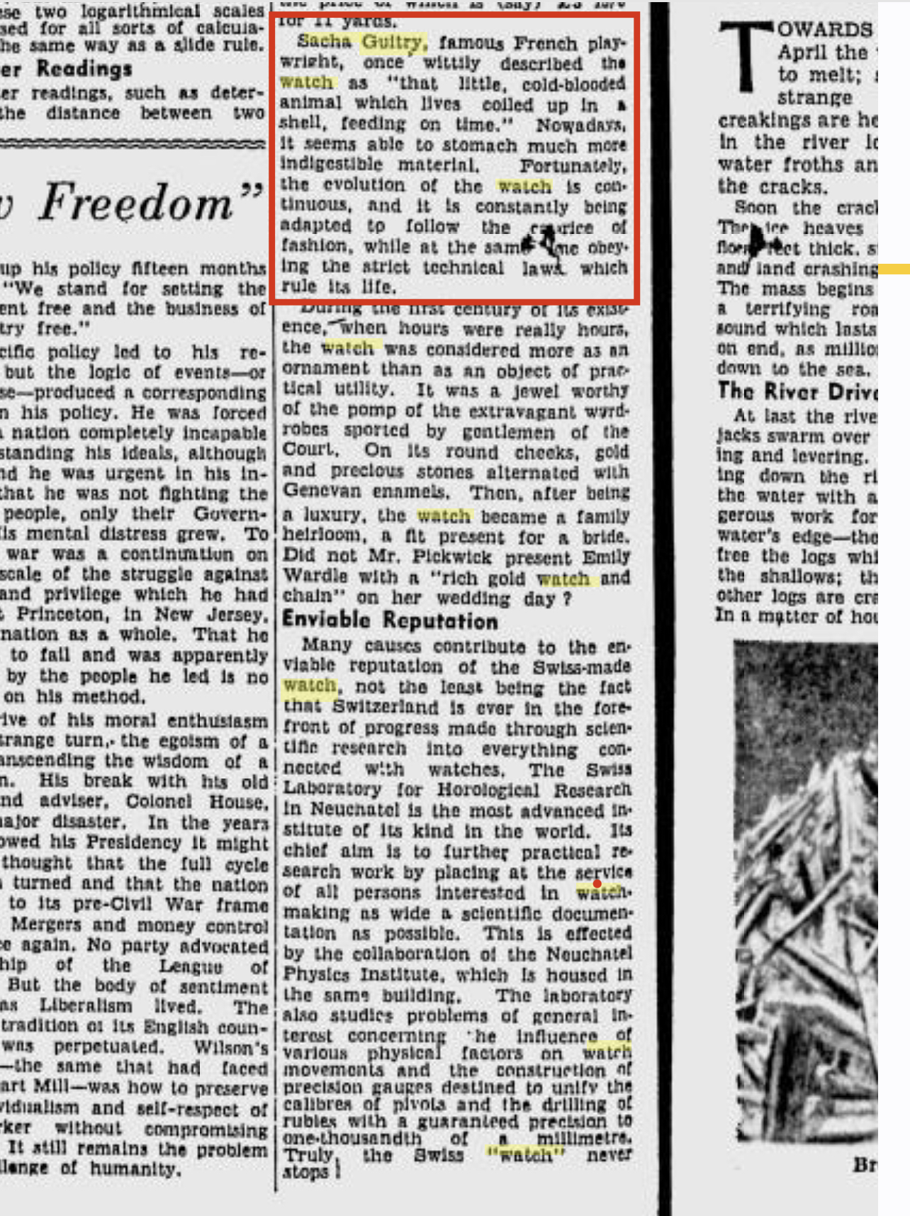 ·“Sasha Guitry: famous French playwright, once famously described the watch as ‘that little, cold-blooded animal which lives coiled up in a shell, feeding on time.’”