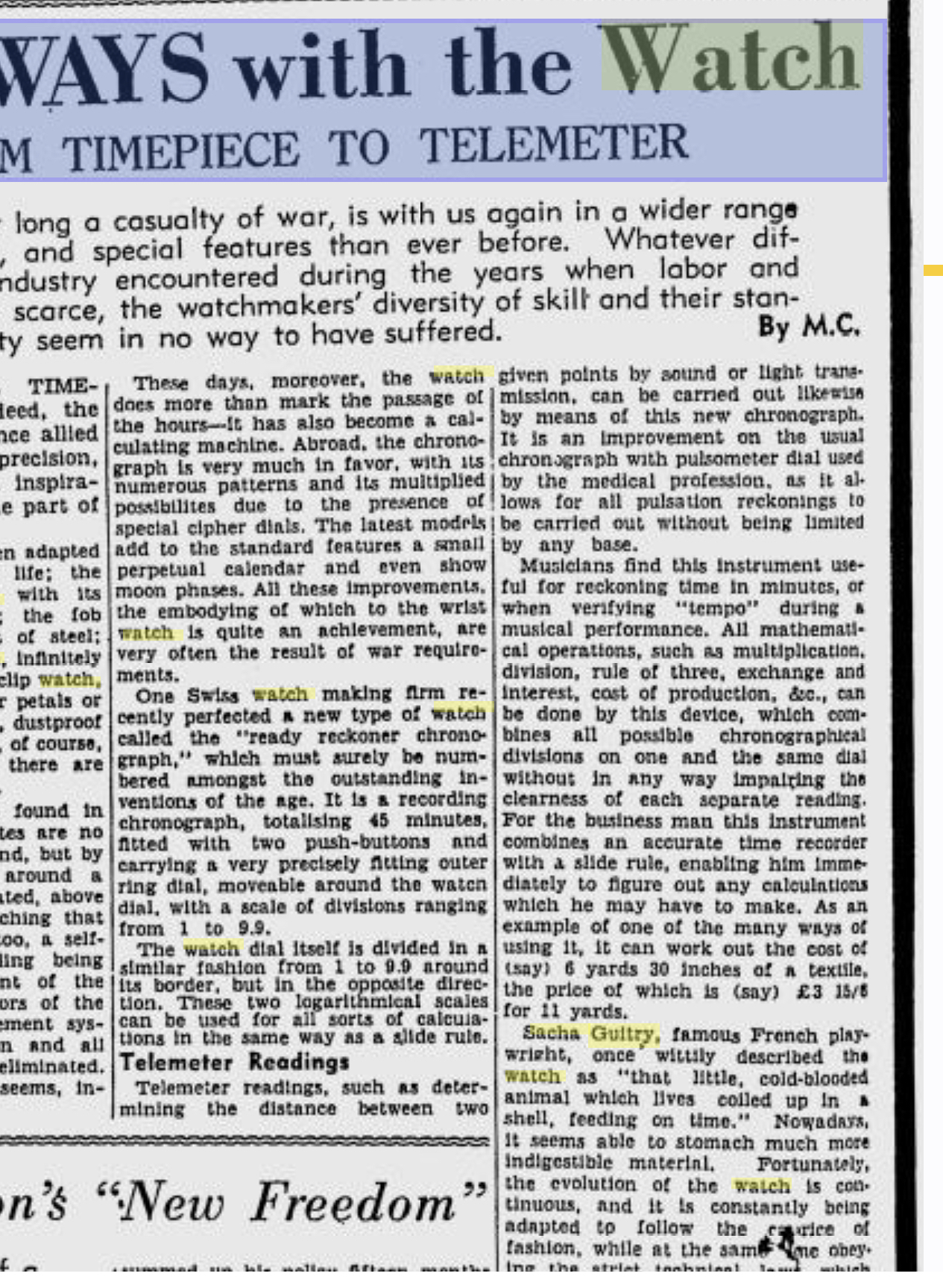 Came across this magazine piece from 1947 out of an Australian publication called “The Age.” Generally discussing in exalted terms the advances in wristwatch technology, I half expect the piece to have been a marketing plant from the Swiss Federation. Still, within it contained the above quote regarding the cold-blooded little animal feeding on time.