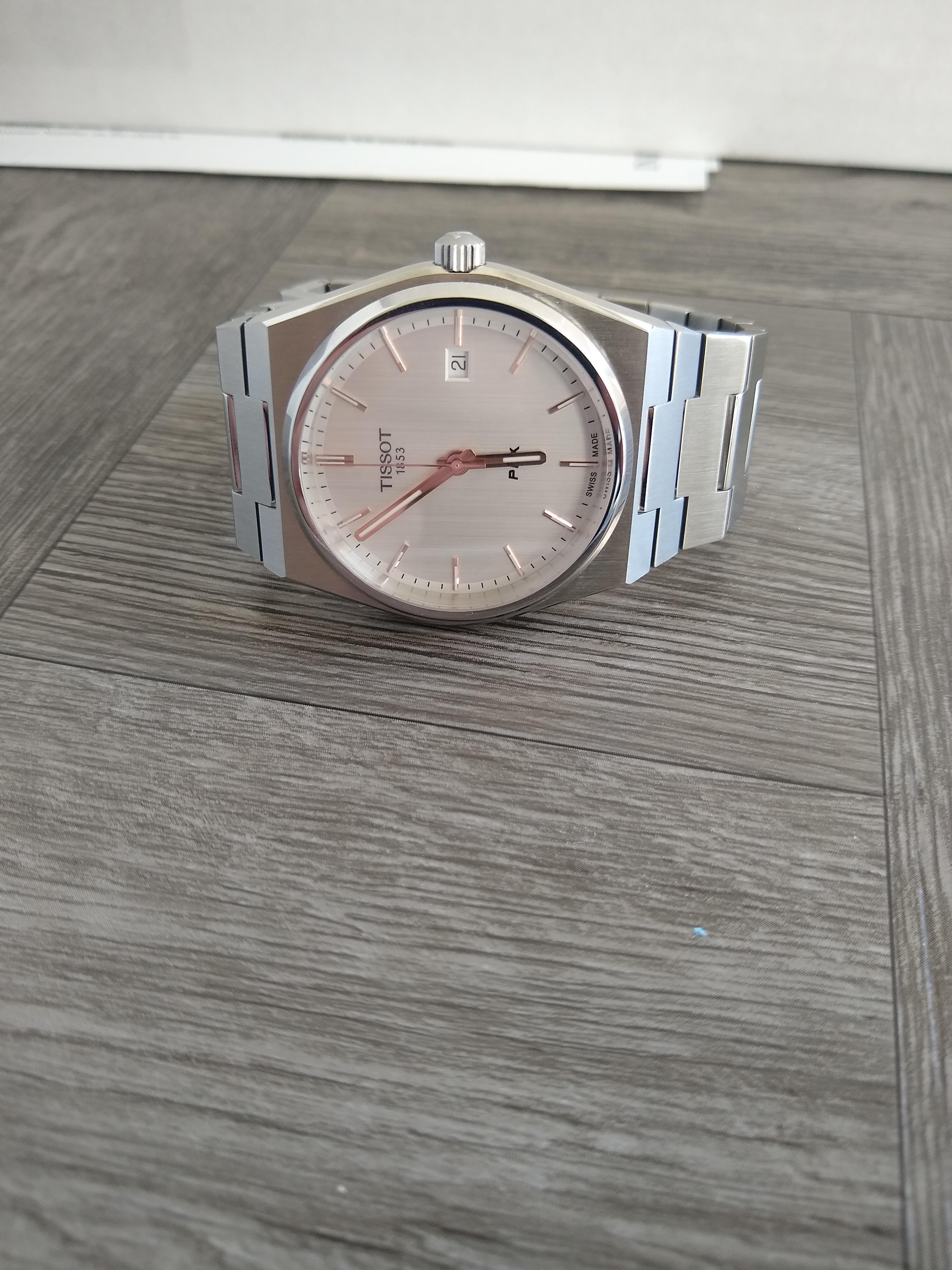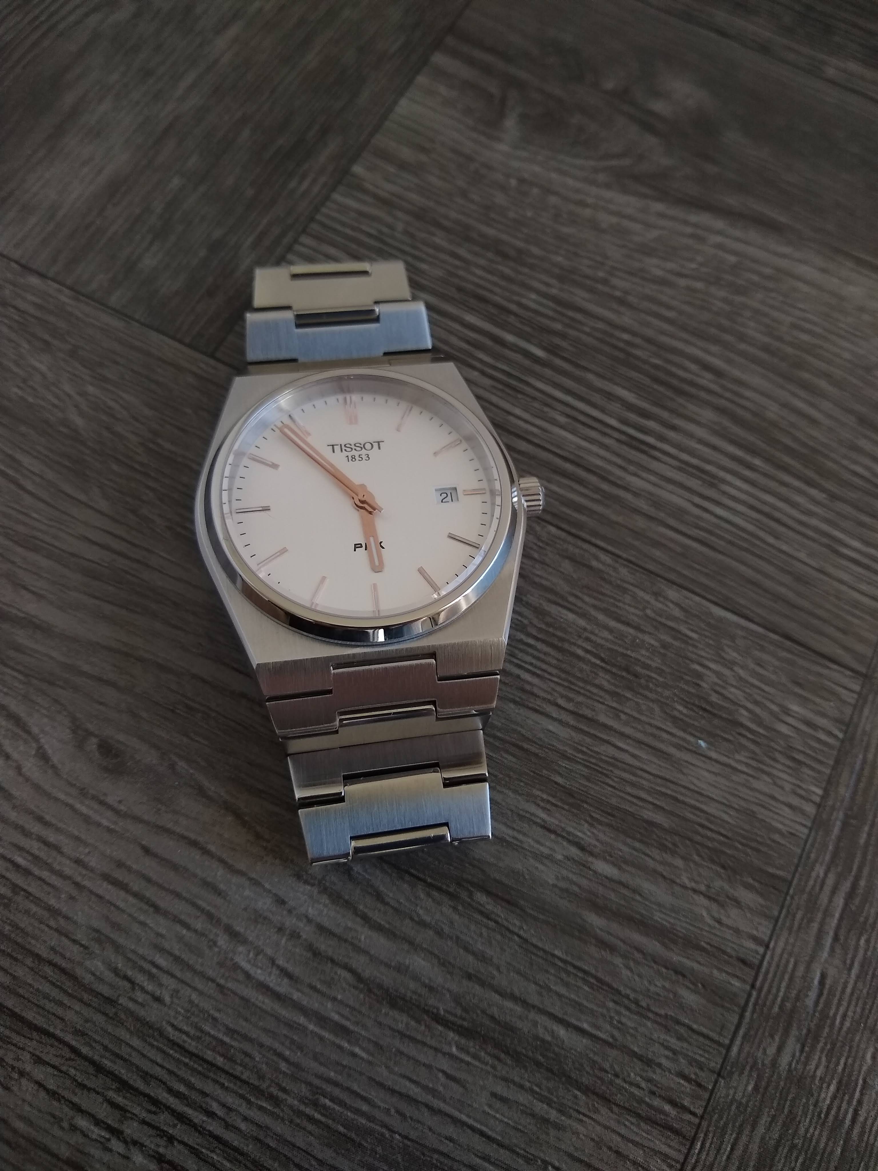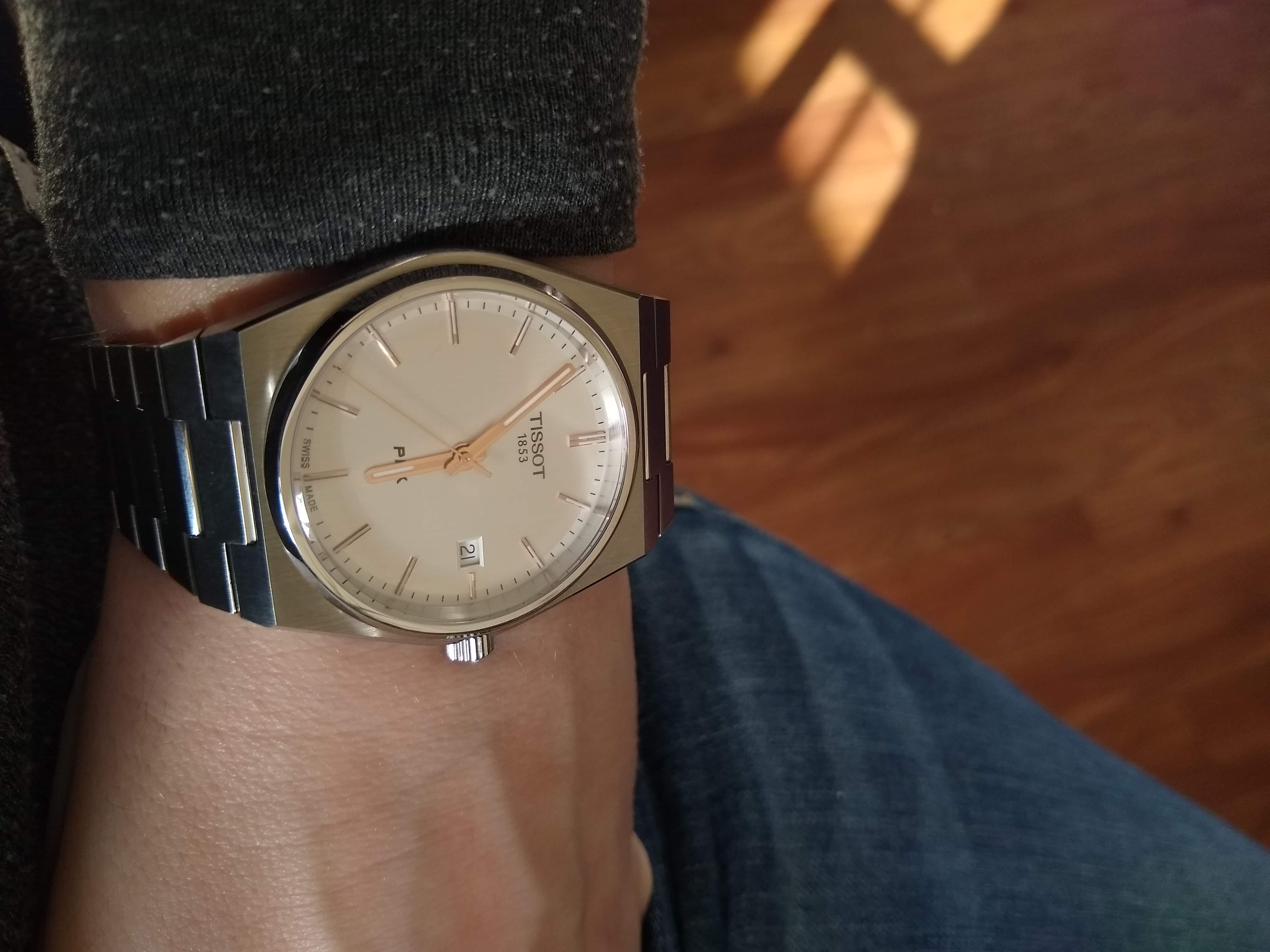 For MSRP of $375+tax, it's a solid watch. For the price I paid ($263 inclusive of tax), it's a downright steal. The bracelet is well constructed, finished on all edges and surfaces, and articulates fully past the first link. The case is an excellent mix of brushed and polished surfaces and the dial is clean, readable, and interesting. The contrast of the rose gold hands and markers give it an extra touch of contrast that would be missing if Tissot had gone with polished silver. The dial on my version is brushed silver that tends to go matte rather than shiny. The quartz movement is on point (literally) and the overall thinness of the case lets it wrap around my wrist like a good bracelet.