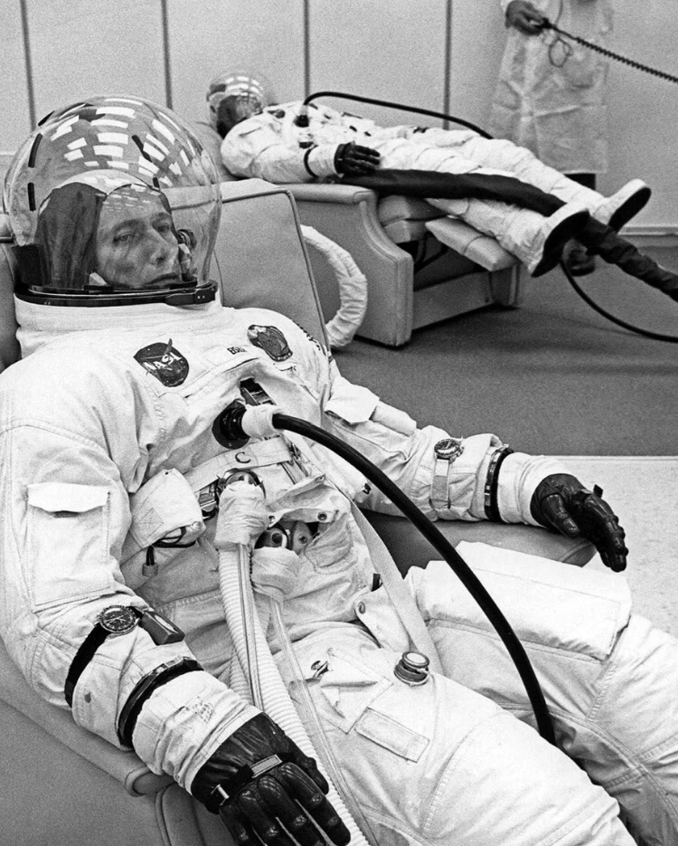 Walter Cunningham also wore a reference 105.012-65, identifiable by the two step caseback.