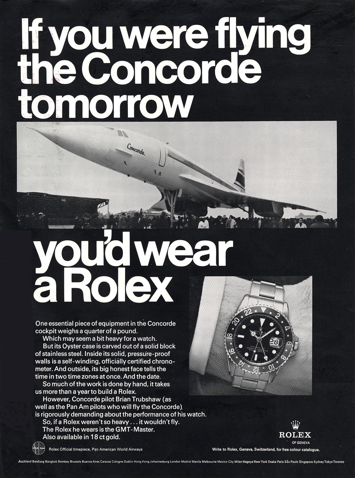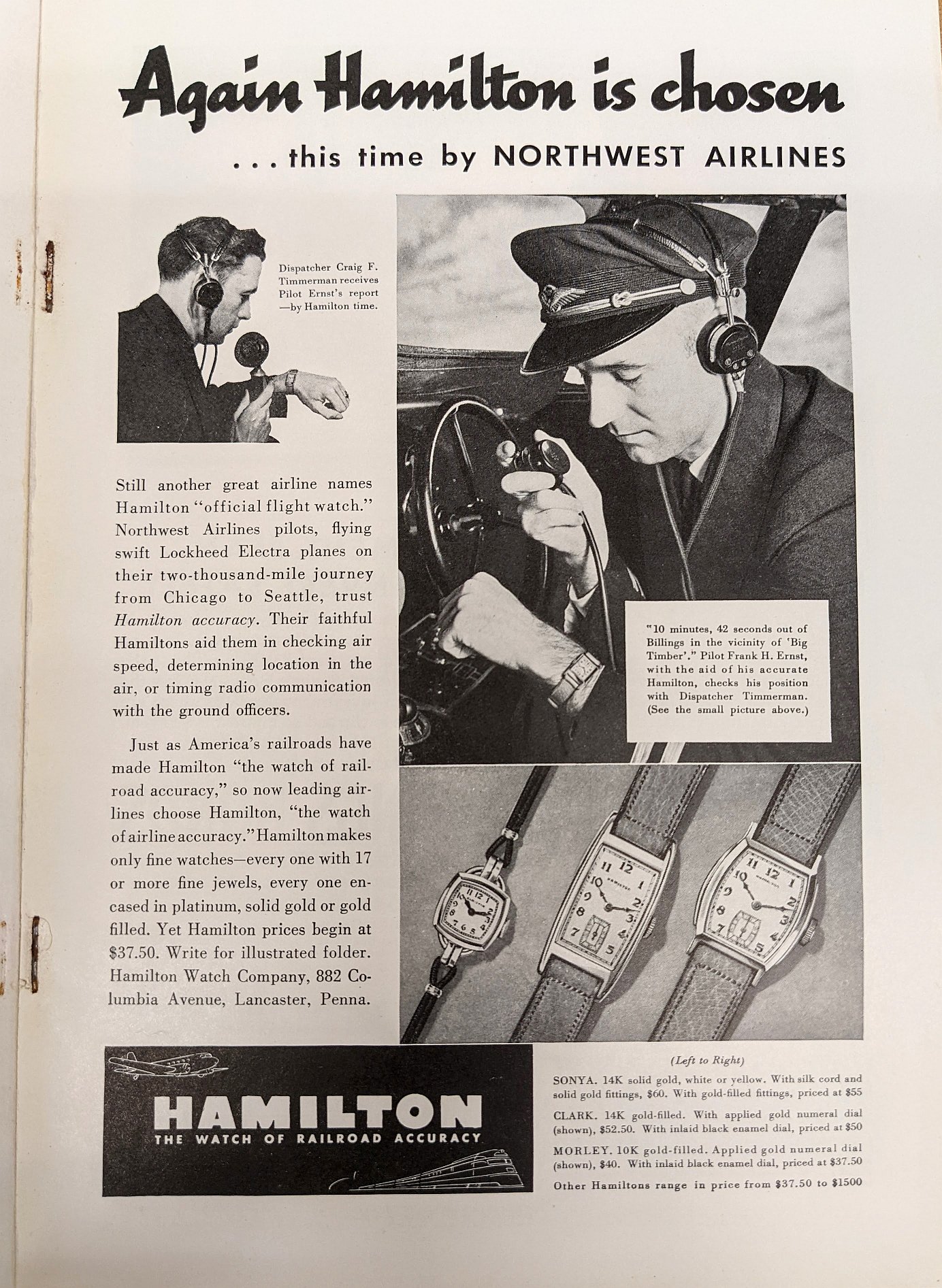 Thanks for sharing this. What I find really interesting is that although Northwest Airlines had adopted Hamilton as its "official flight watch", the watch which the pilot in the ad is wearing is a generic men's wristwatch rather than a specially designed tool watch such as the Rolex GMT Master or IWC flieger. Of course, we've all seen the ads for the GMT Master which spruik it's credentials as a pilot's watch: