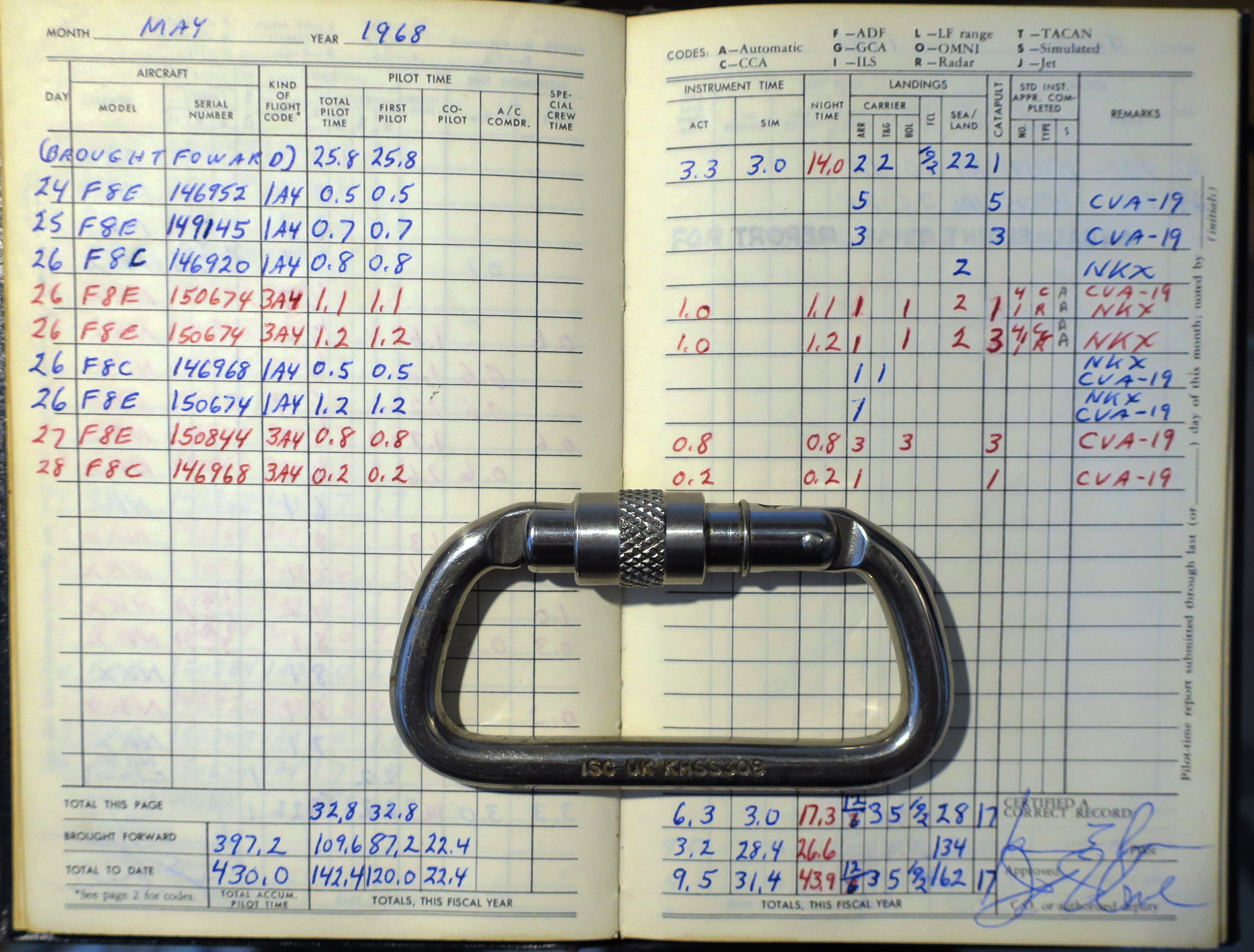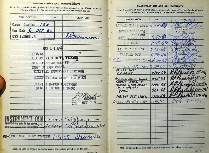 Hi @All. Found am aviators flight log book from the 60ies. The pilot did some training on the USS Lexington. I can understand most of the infos , except the abbreviations at "REMARKS". Any specialist here? 😕