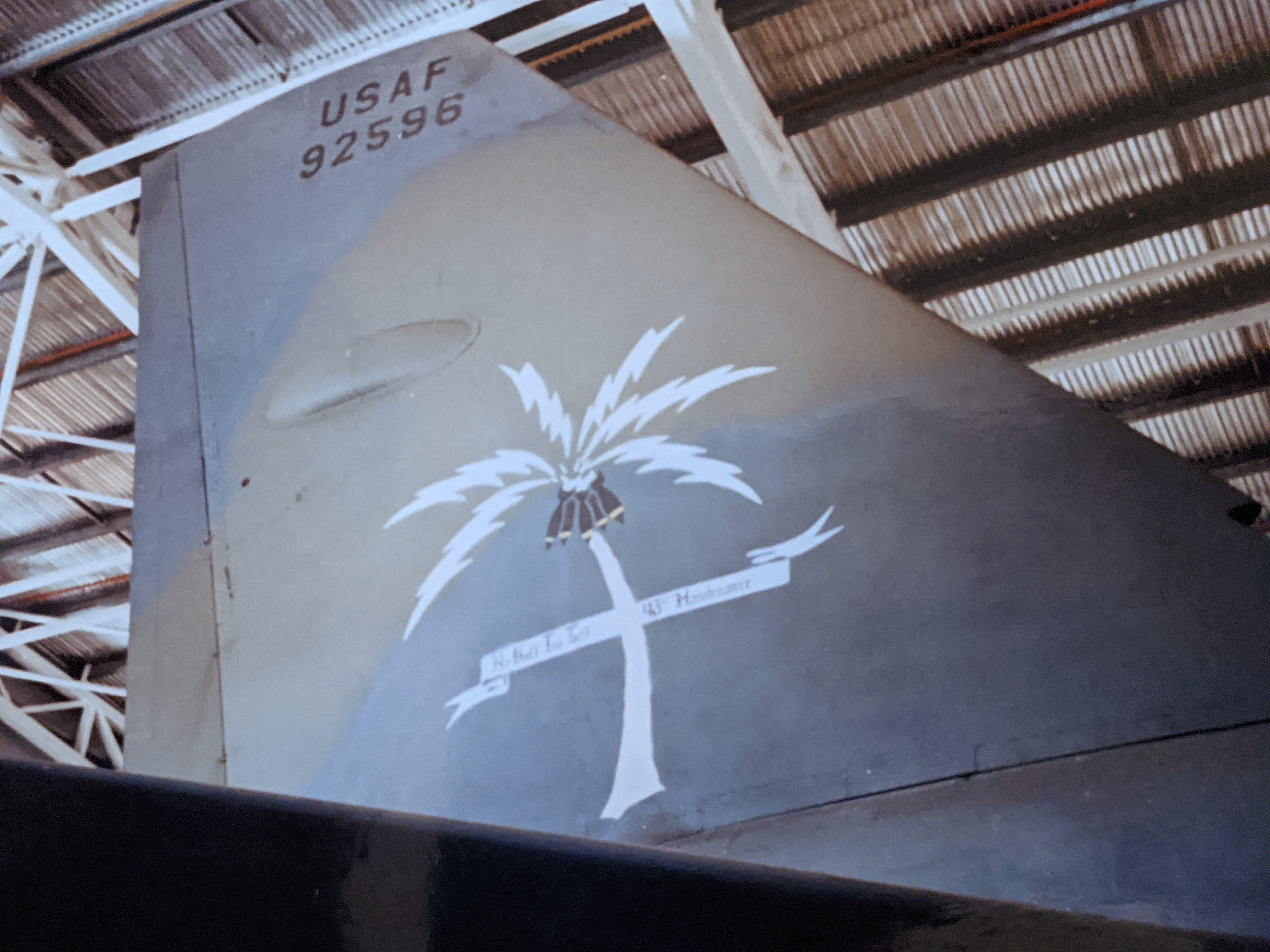 Tail art. Note the bombs on the palm tree masquerading as coconuts. The inscription says "No Buff Too Tuff - 43rd Maintenance"