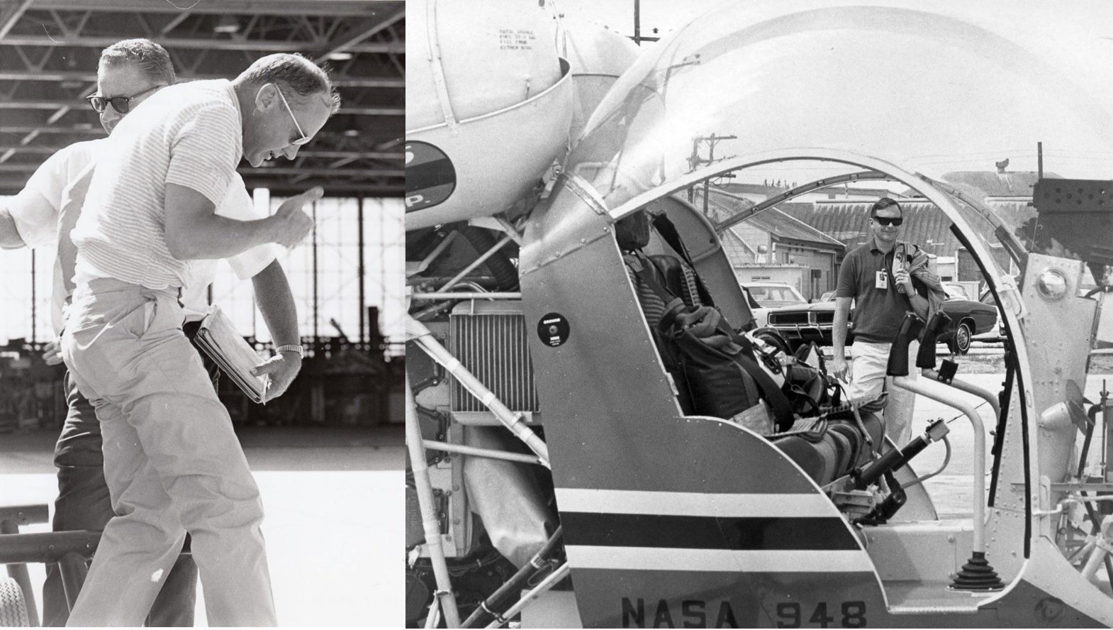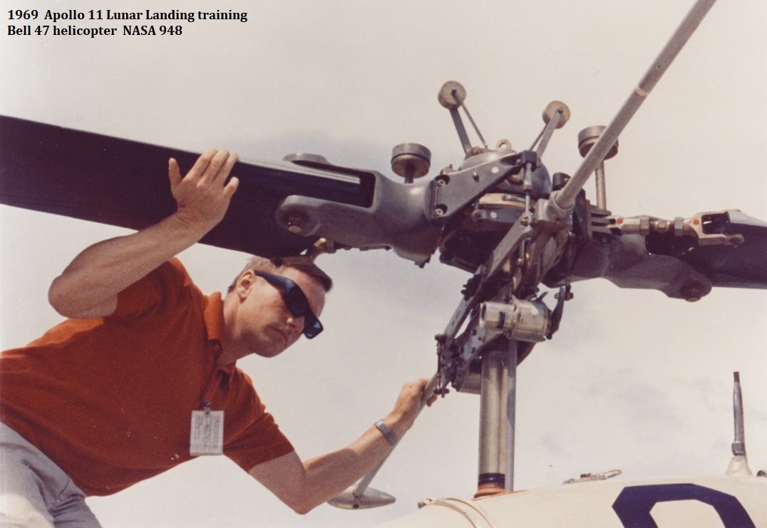 Here're Buzz Aldrin & Neil Armstrong training in a single rotor single engine Bell 47 helicopter (NASA 948), the ideal tool to simulate lunar landings