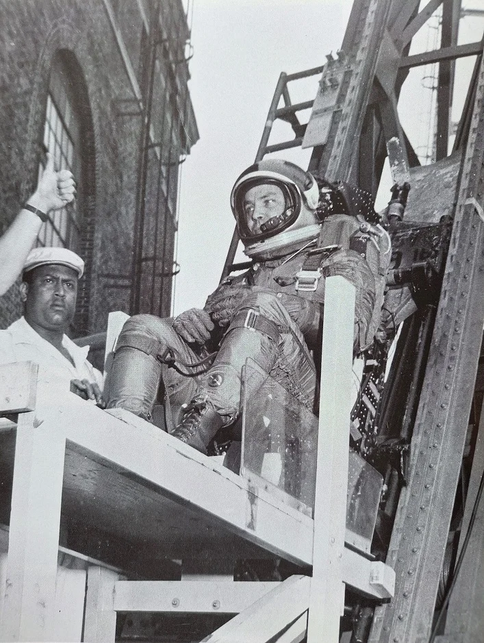 This B&W photo shows a pilot wearing a full pressure suit with high altitude BF Goodrich U.S.N. helmet Mk III sitting in an ejector seat ready for a ride up the ejection seat rail tower !