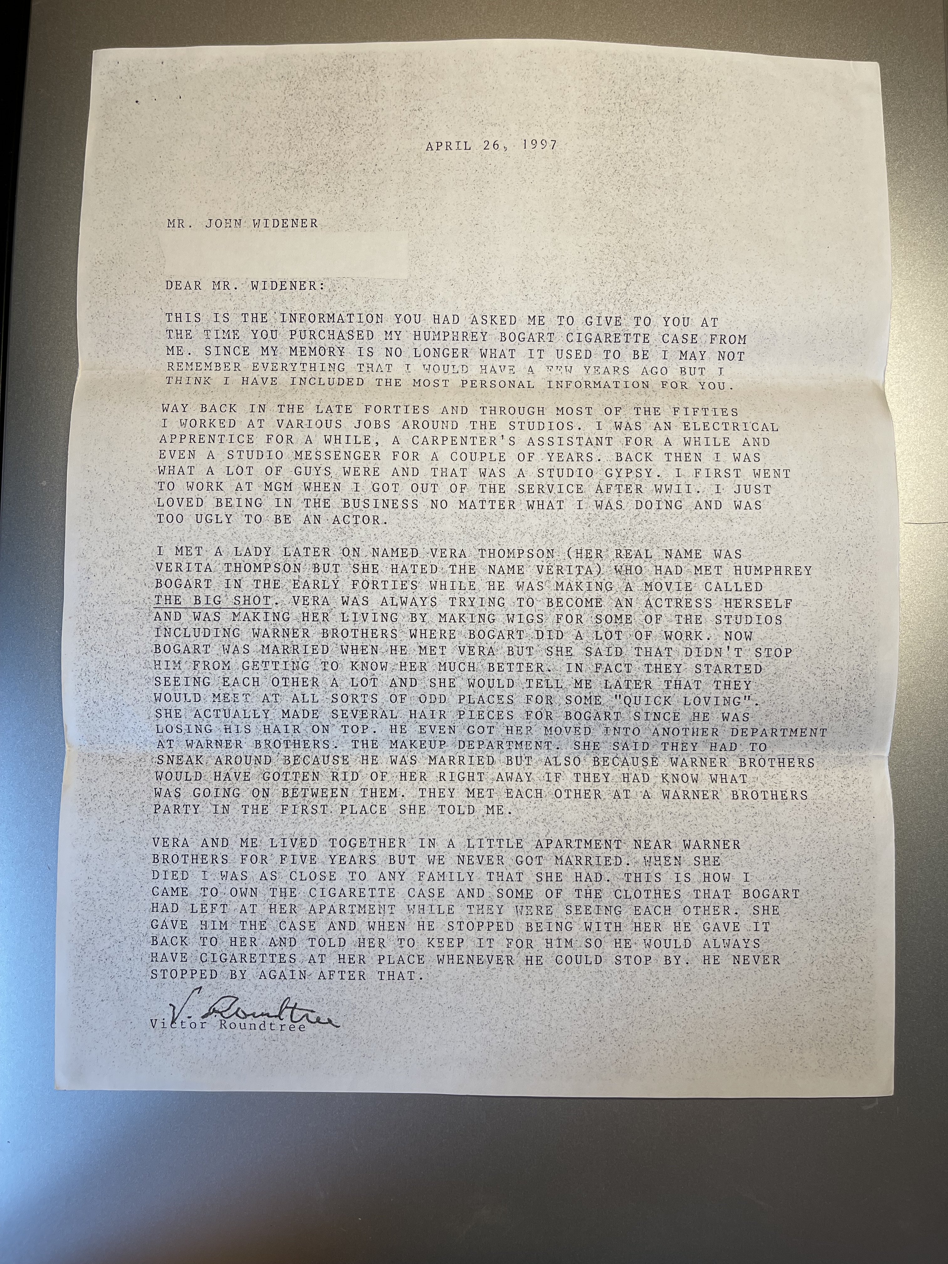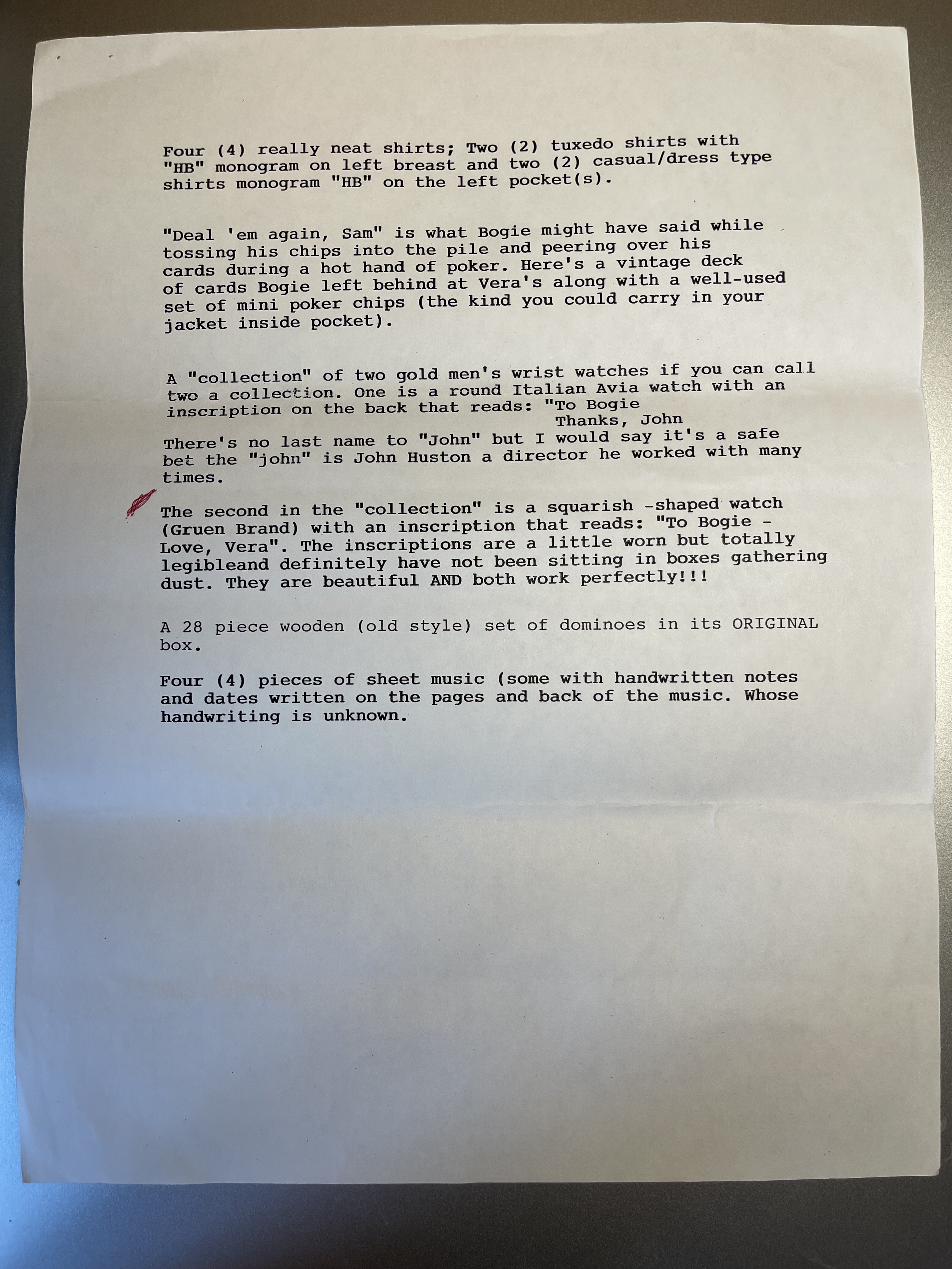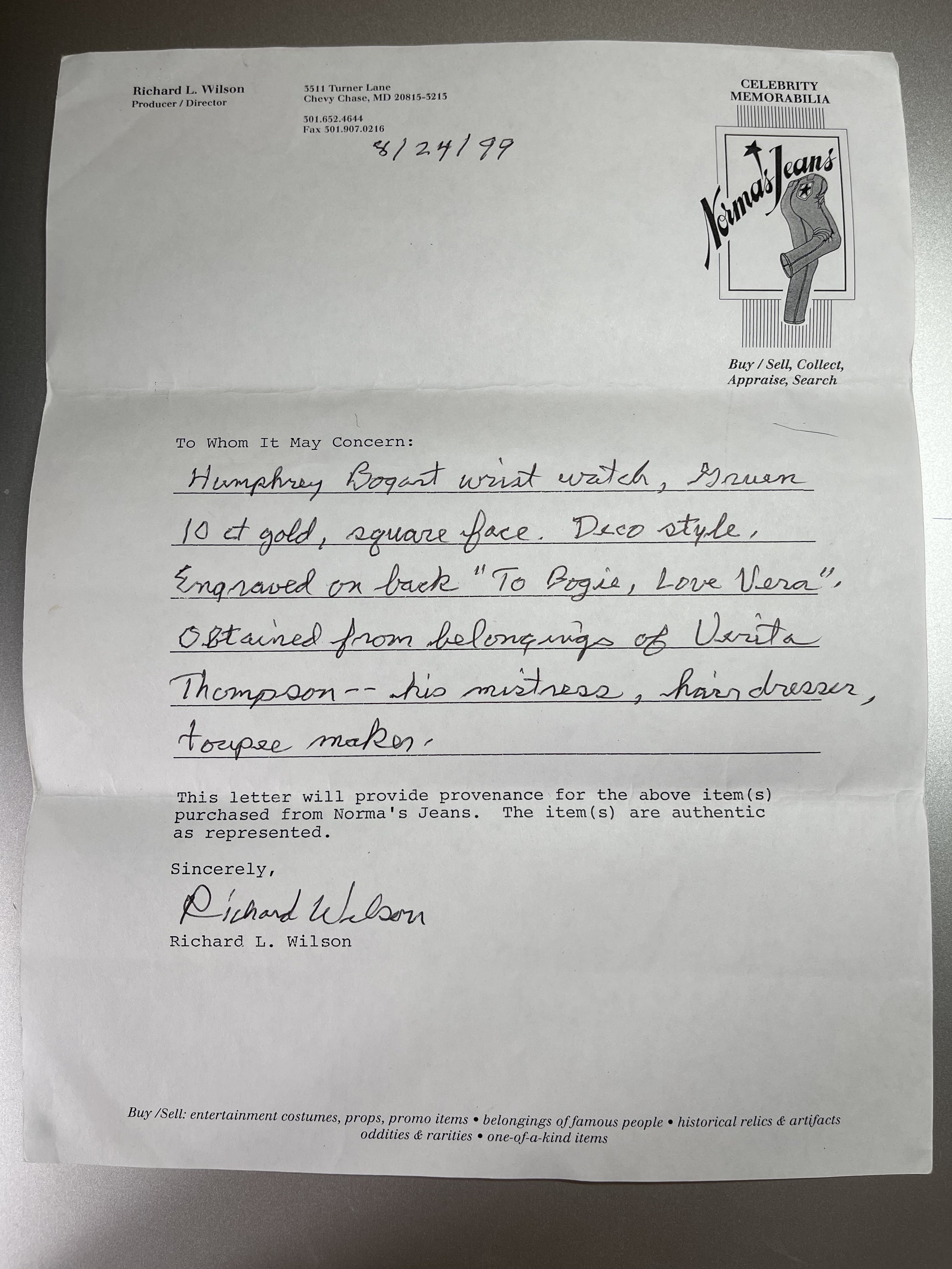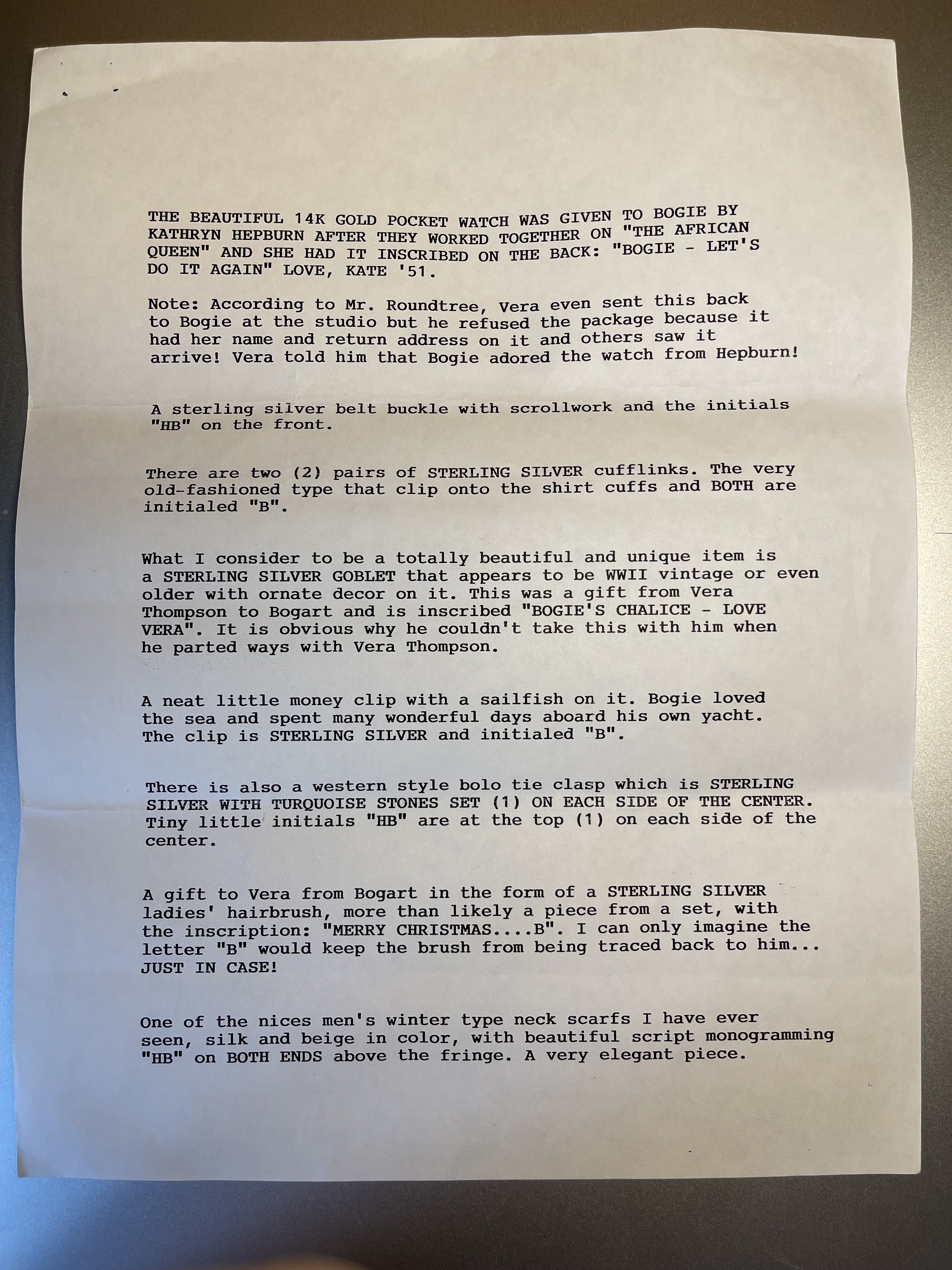 This is part of the list of Bogart's personal items that were sold in 1997 the Gruen was part of this lot.