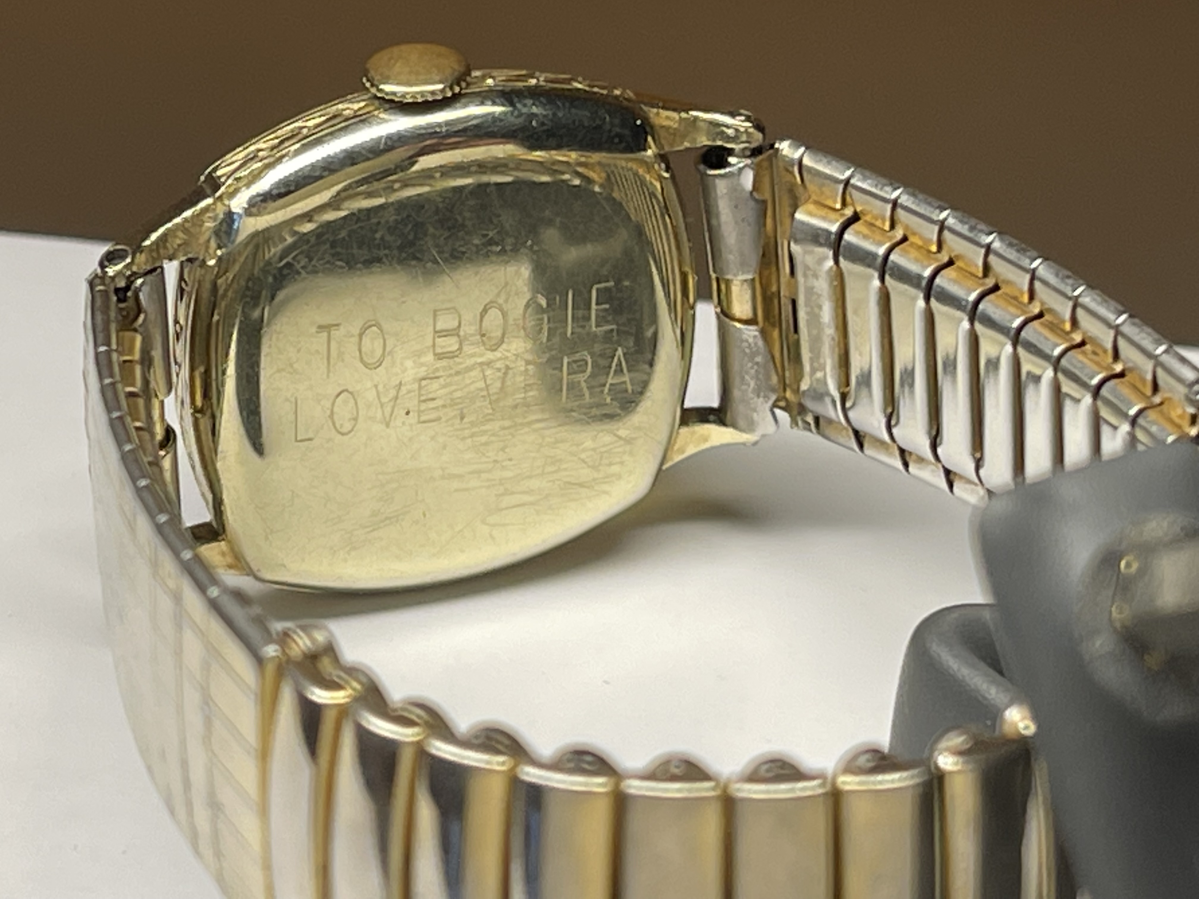 Bogart had a liking for watches, he often wore his own personal watches in his films, we all must know about the Longines Evadenza he wore in Casablanca which is now at the Longines museum, he owned a few Gruen's as these were seen as the top watches at the time. I had researched that he may have worn this watch in the film "Beat the Devil" and it's also been mentioned as such in a documentary on youtube but more research required. Vera must have gifted him the watch sometime after the affair began and I'm sure it would have cost her a lot of money back then and maybe it was even second hand or just old new stock as far as I can date it to 1925 but with the war on at that time who knows ... Vera had the case back engraved "To Bogie, Love Vera" I think Bogart kept the watch on his boat the Santana right up to his death as he asked Vera to remove her belongings from the Satana just before his died.