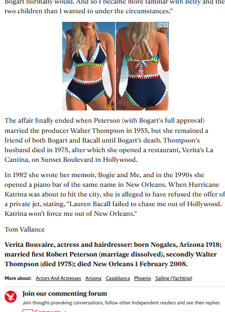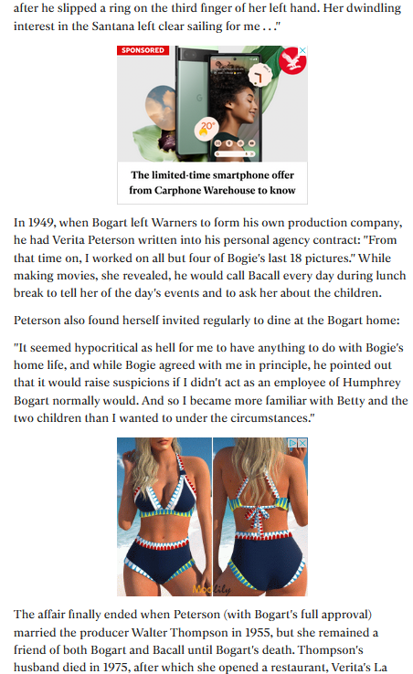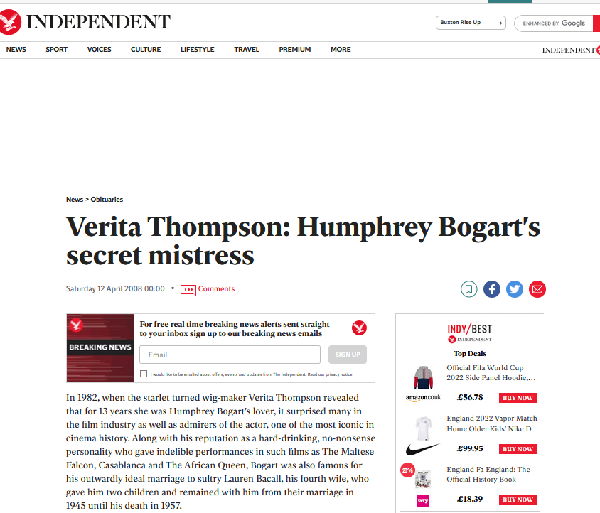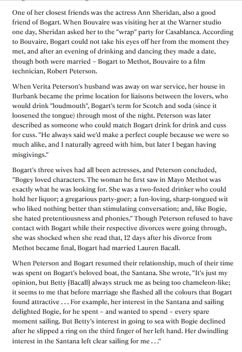 In 1942 the Casablanca had just finished shooting and in the Film and TV industry there is often a drinks party to celebrate the long hours and hard work the cast and crew have put in, many friends and family of crew members get to meet the stars. Verita (Vera) Thompson (A Hollywood studio hair dresser) was invited to the Casablanca Wrap party where she met Bogart and "danced all night" (Google will help you out here, as well as Vera's book "Bogie and Me") ...This whole story is wonderful and is worthy of a Film all of it's own this relationship lasted on and off even though he married Lauren Bacall and right up till Bogart's death from Cancer in 1957.